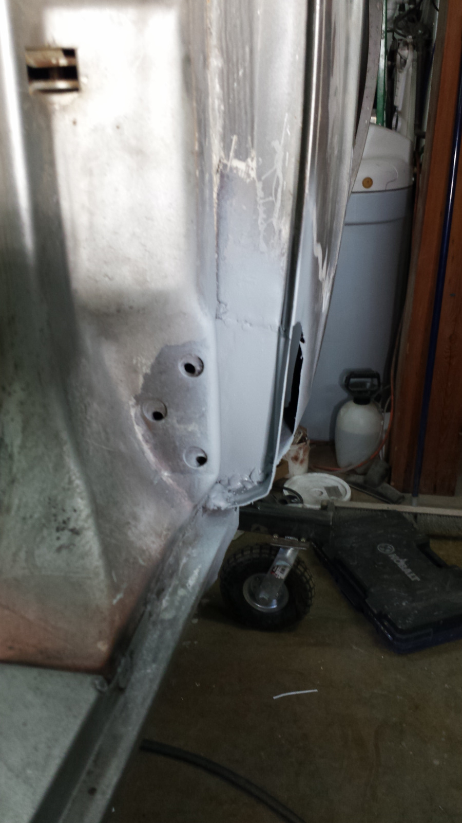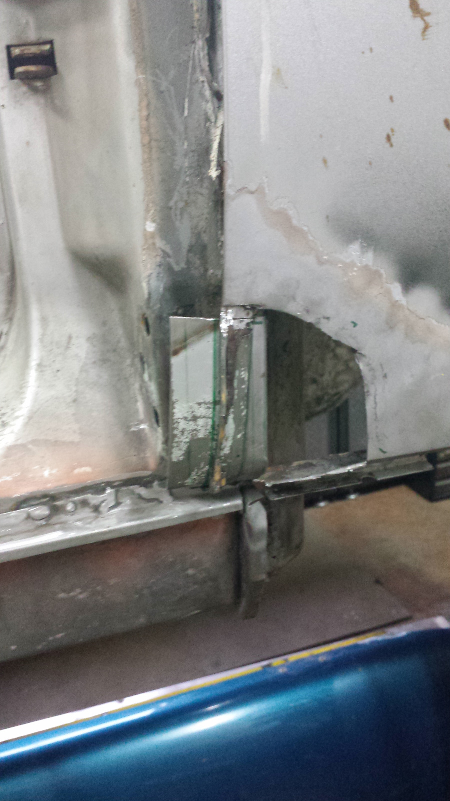 Welded in and ground off. With just a touch of filler, you will be hard pressed to notice it was patched even with the door off. Patching the skin was just like the other side, so I won't bore by repeating those details. Next time I take the doors off, I'll tune the flanges on both sides a little and finish off the inner crimp flanges. Just a spot of filler and that patch will completely disappear. |