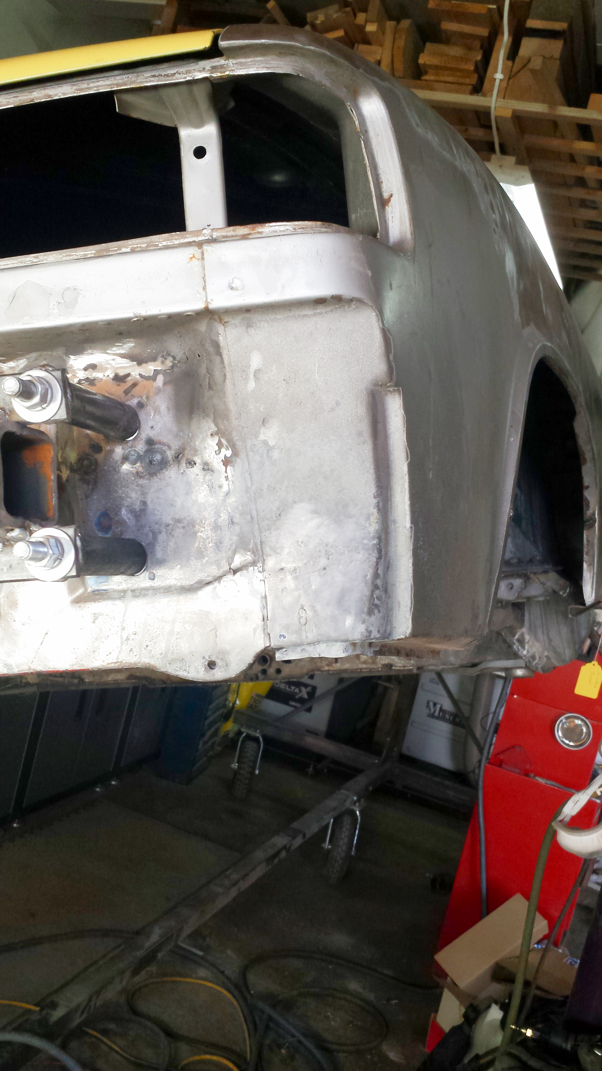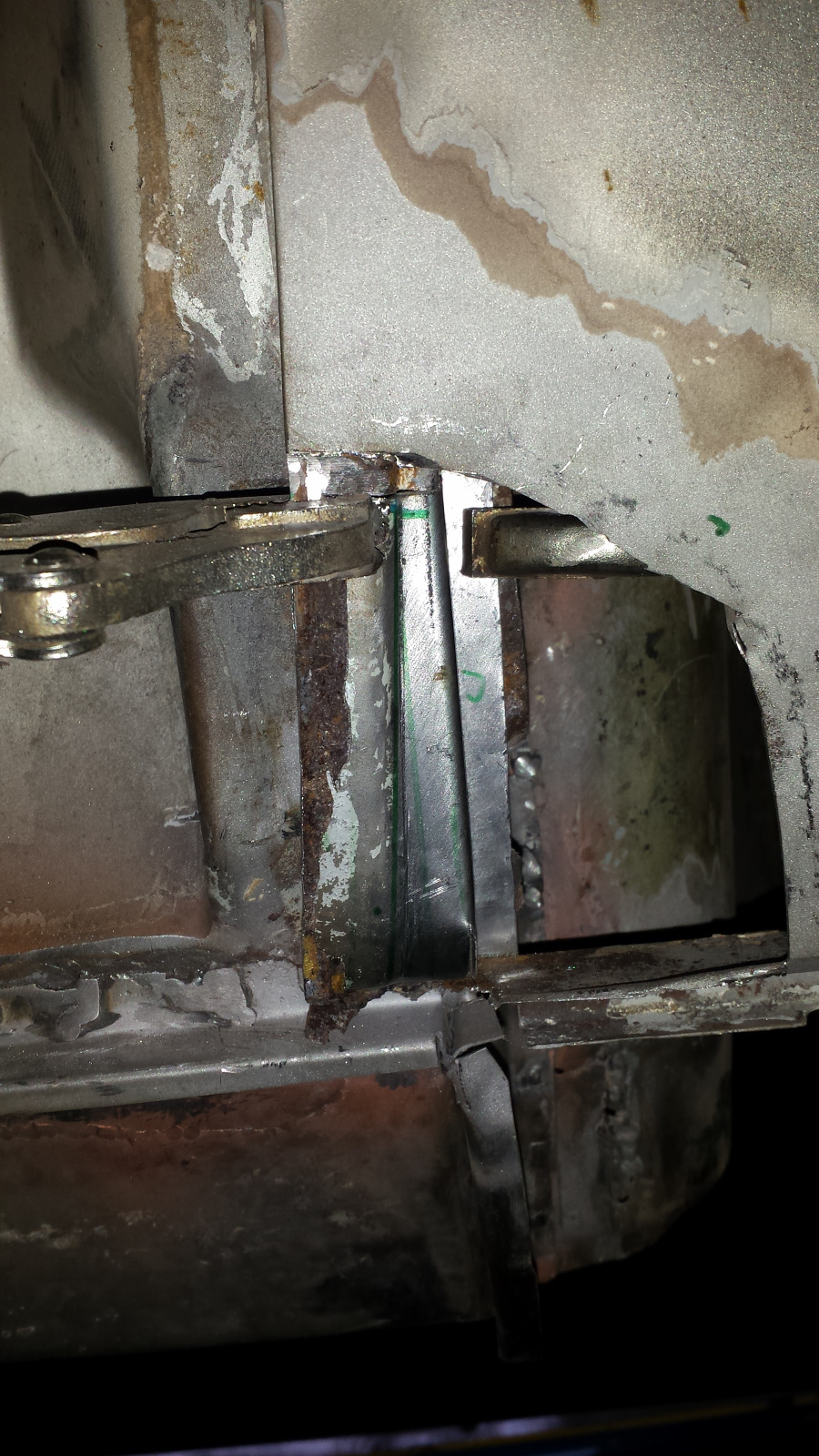 Finally today, I needed a break from tedious panel repair and decided to weld in the trunk hing pivots now that I have a trunk lid to align. First I had to find where I put the dang pivots. That took about 45 minutes. Then aligning the lid just so to get the pivots in the right place. I hit them with 3 plug welds on each side plus 5 tack welds on the edges just to be sure. This picture makes those welds look pretty crappy even though they look nice in life. I'll still grind them down a bit before painting though. My new old trunk lid needs just a little adjustment. There is a low spot along the left edge and just a more subtle one near the hinge on the right. I'm guessing this was caused by reefing the lid down on my roof rack with ratchet straps for the ride home from Iowa. It should be easy to gently persuade the lid back to the right curve and I'd rather have this than having it fly off the roof in transport. The lid actually goes up and down like it is supposed to. That's nice. (IMG:style_emoticons/default/smile.gif) |