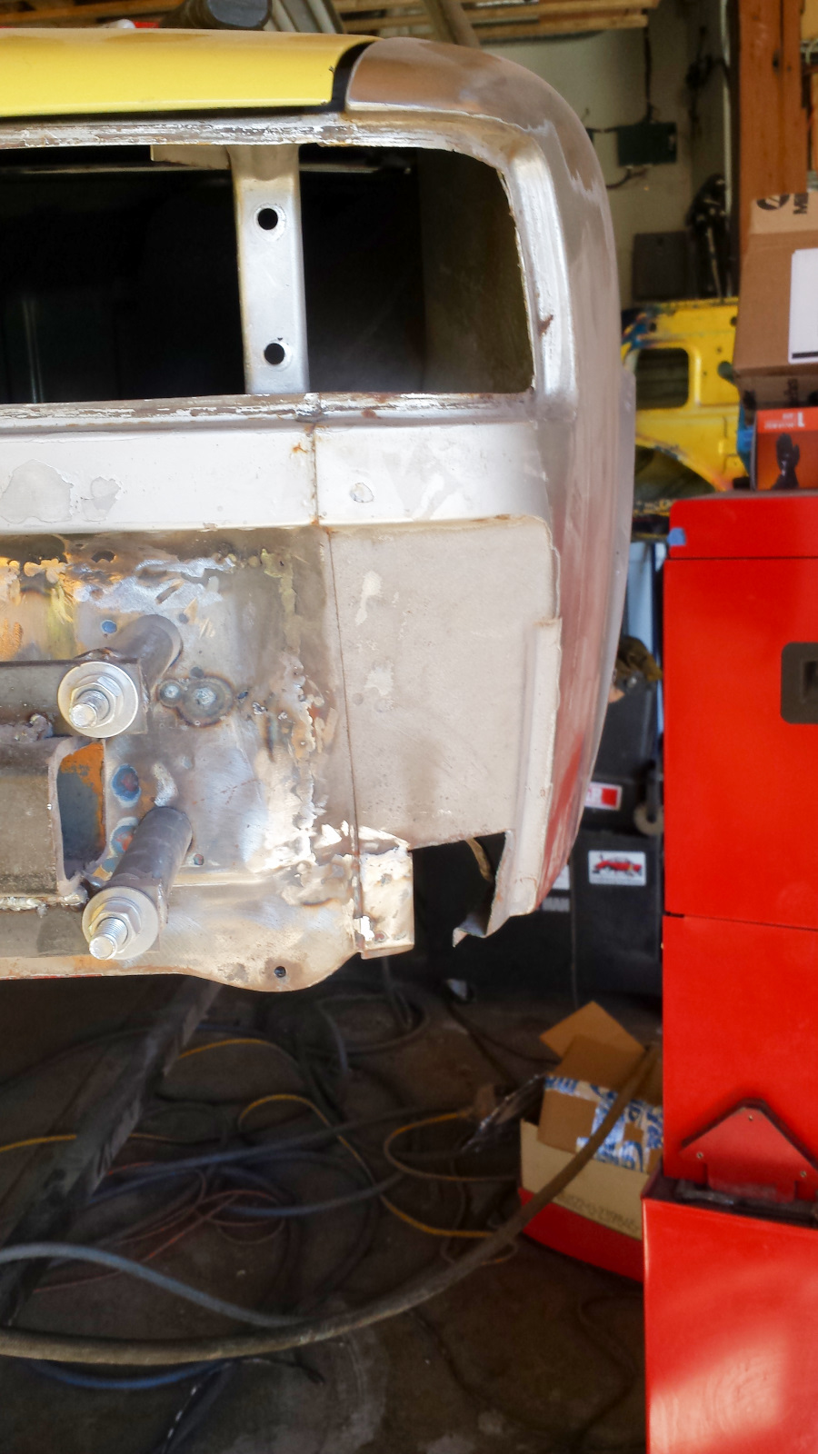 I've spent the last week tackling that nasty tinworm nest I found back in May under the headlight bucket and behind the right bumper bracket. It sure looks innocent from this side but I was NOT looking forward to this job. I got a salvaged bumper bracket from Garold and Plan A was to just cut wide around the replacement bracket and butt weld the whole patch in as a unit. Unfortunately, the replacement is from the other side of the car so that won't work. Plan B is to liberate the bracket from the salvage part, then cut a patch from the inner fender wall that can be flipped over to fit the right side. The salvage patch includes a long indent that would be tough to fabricate and I'd never get it to match as perfectly. I went too deep cutting those spot welds so will have to do some repair on that patch. Cutting this piece apart is about as fun as cutting out the rear suspension console and engine mount. Now I had to cut the bumper bracket out of my car, but first, I had to rig an alternative support since the thing I was going to remove was holding up one quarter of the chassis on the rottiserie. The fog light uses an surprisingly large M10 bolt and looked like a good candidate. So I bent a piece of bar stock to bolt in that location, and welded the other end to the rotisserie bar. Removing the bracket takes several hours of grinding and a copious application of F-bombs working in cramped quarters. The nice thing about working in this area is about every 10 minutes, you ram your back into the sharp corner of the rocker cover flange in the wheel well behind you. Lot's of breaks were required but I finally ground the entire bracket into fine shavings to reveal what all the fuss is about. Then the long process of trimming the patch piece and cutting an opening to plug it into. This took a lot of switching back and forth between tools and getting creative with attachments. In the middle of this, my trustly $14 HF mini angle grinder took a dump so I had to make an unplanned run into town. Knowing that the HF quality control isn't great and not wanting to risk getting home to discover my replacement grinder was a dud like the first one I bought, I picked up a Husky brand at the Home Despot. Online reviews looked good and I will say it is a nice step up from the HF unit, and quality is much nicer than the POS Kobalt die grinder I bought at Lowes. Anyway, eventually I had a hole worthy of a patch. And a patch to plug the hole. There is still a lot of work to do but this gives a pretty good idea of where things are heading. Stay tuned... |