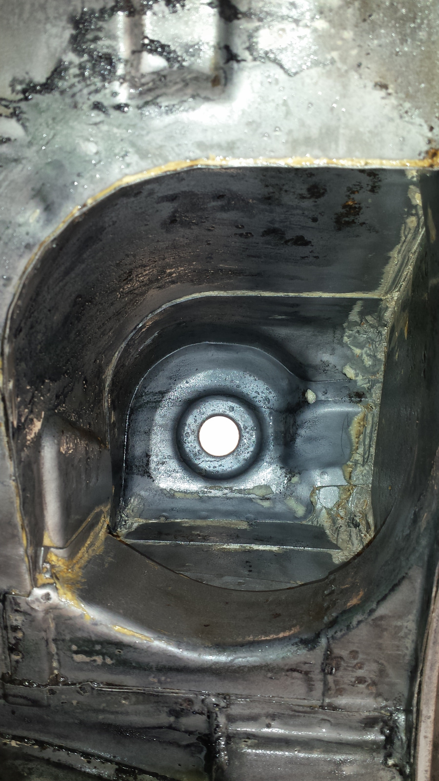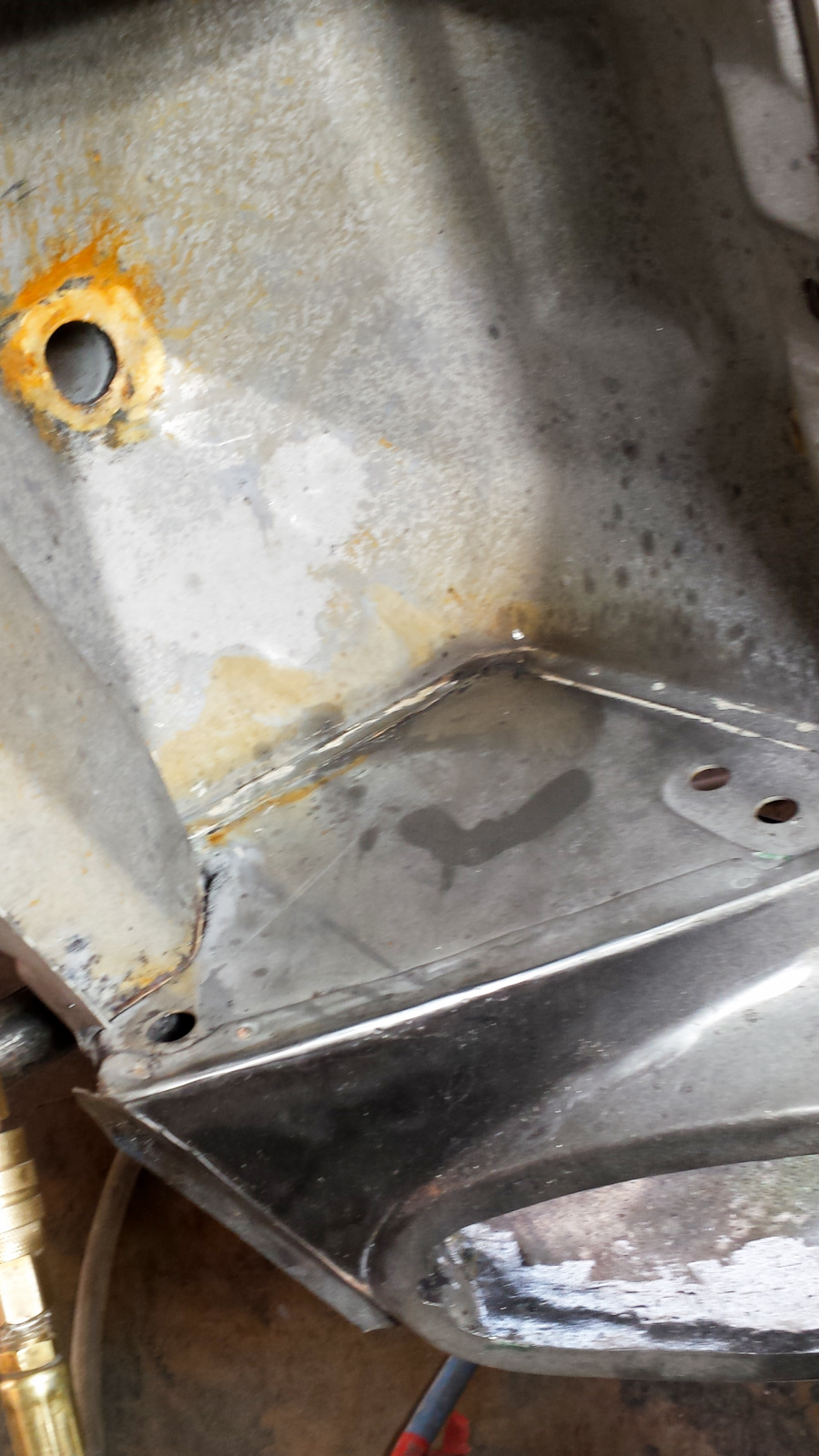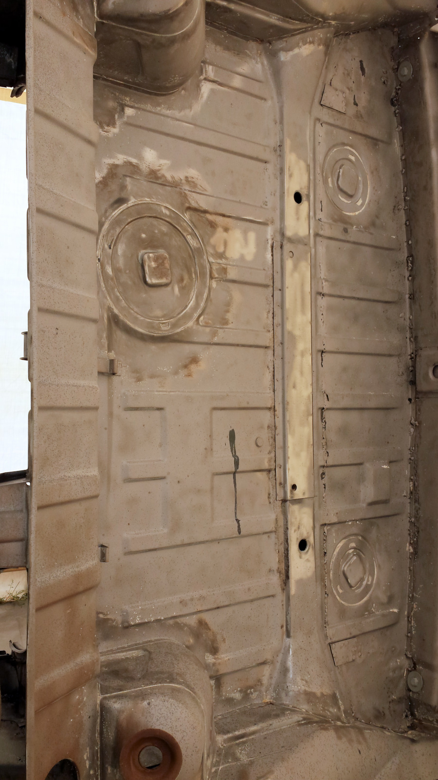 Welded up holes drilled for the fuel pump relocation above the steering rack. I'll be moving it to a late model access cover. Also had a half dozen rot holes from mouse and weasel piss to fill. If you can't see them, then I'm happy. (IMG:style_emoticons/default/smile.gif) Left a couple boogers down in the bottom that I can't get to with tools. They will be buried under sealer anyway. One last one for the road. |