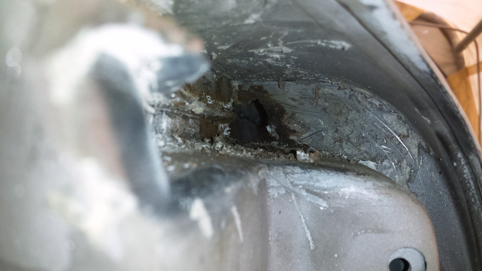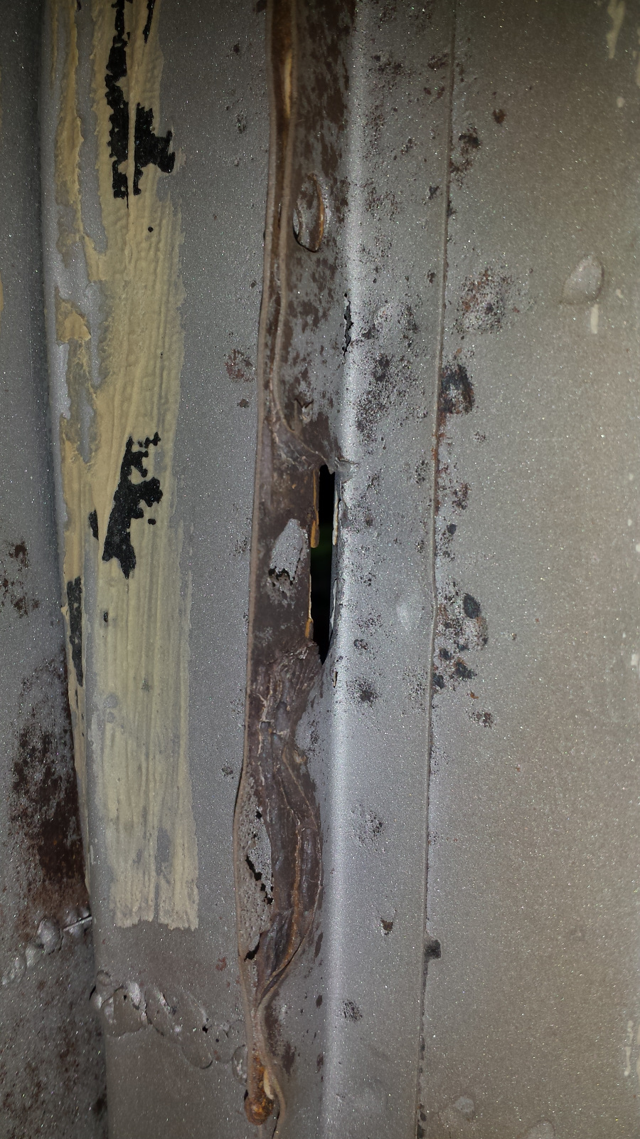 It's a little hard to see, but the pinch weld has rusted through here. I'll probably just treat this one with rust converter and forget about it. There is supposed to be a hole here anyway, just not quite this big. It will be encapsulated in seam sealer on both sides again anyway. |
