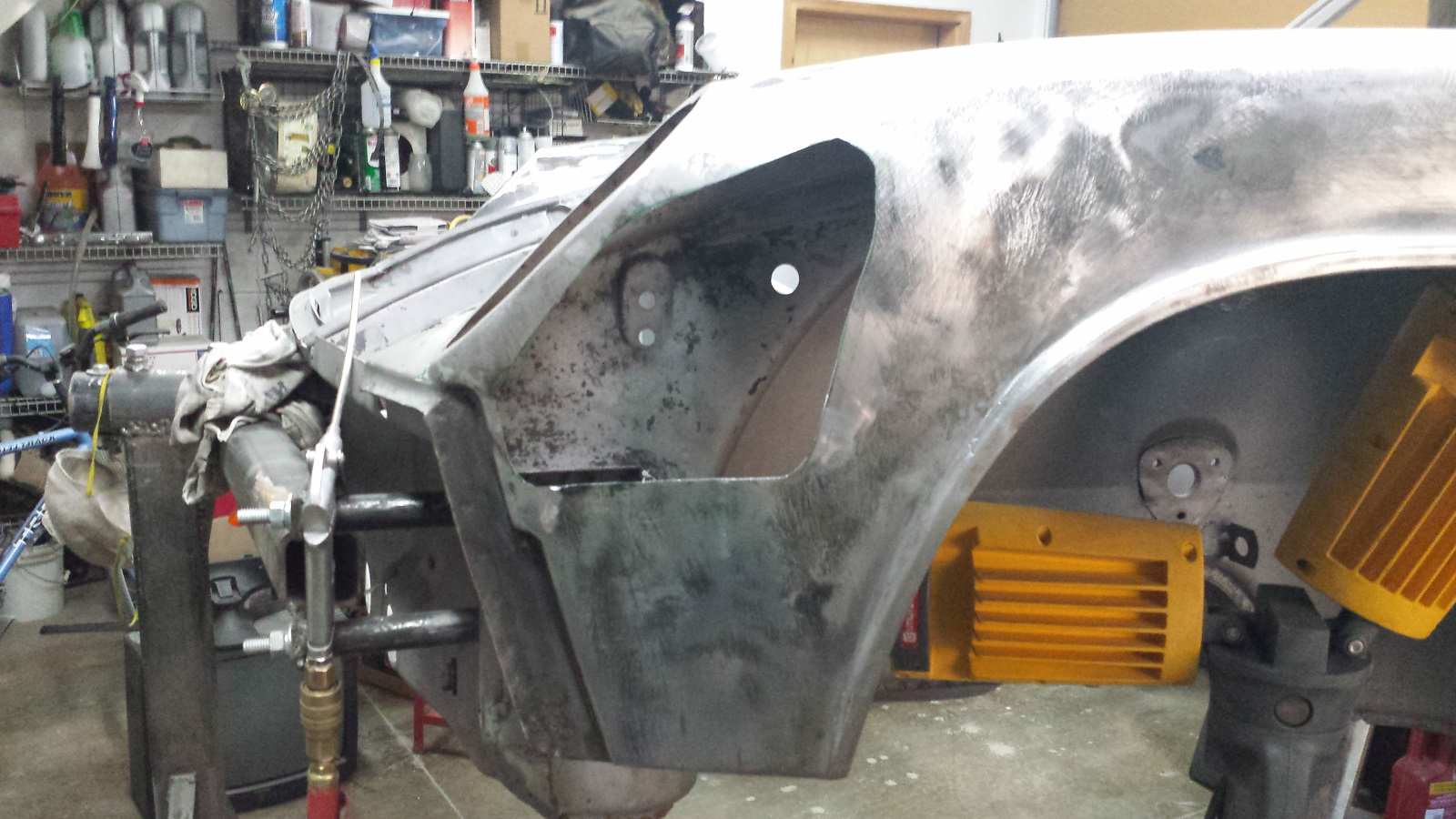 I cleaned all the blasting grit out of the cracks and crevices... then I cleaned out the car. (IMG:style_emoticons/default/laugh.gif) I've seen a lot of complaints about how hard it is to get blasting media out of the chassis, but honestly, it wasn't that hard. It did take a few hours. Before blasting, I taped off all of the holes and stuffed plastic bags to minimize what got inside boxed cavities. After blasting, I spent about 3 hours using a combination of the shop vac and compressed air cranked up on full to suck and blow the media out all the holes. When I was done, I couldn't hear anymore grit rattling around when I rotated the car, nor did more than a half teaspoon fall out. I'll go through it again before painting, but it seems pretty clean. Yesterday I started on patches for all the nice surprises revealed after blasting. First up was that left fender that was hiding under Bondo. The fender had been hit, somewhat straightened, hogged out with some death tool to roughen the steel before hiding everything with Bondo. To add insult, the side wart was stuck on with sheet metal screws instead of the proper clips. The plan was simple, straighten the panel, weld up the slide hammer holes, then patch the rusted metal around the wart. Spent almost a full day with shrinking disc and hammers and dollies to get the panel straight and smooth. Welding the holes went well until I worked toward the front and everything started blowing out just waving the welder nozzle toward it. Closer inspection showed dumbasses at the body shop had hogged down the steel to about the thickness of aluminum foil in spots. Time for plan B: I tried to cut out all the metal that was either thin or rusted without getting into the curve at the top of the fender that I thought would be hard to match, or the rim around the turn signal bucket. I measured the piece I cut out and the thinnest spots were down to 27 gauge!!! Here it is ready for welding. Things went pretty well except right under the turn signal where I hit some thin metal I hadn't noticed. I thought about cutting another patch but fueled by stubbornness, I was able to use a copper spoon to bridge the patch to good solid steel. After grinding, I sprayed a guide coat and block sanded with 80 grit. After just an hour of hammer and dolly, I had the panel looking pretty decent. It will take a few more hours with shrinking disc and hammers, but I think this is only going to need a very thin coat of filler to mainly fill the shrink around the welds. After the hard fight, I'm ecstatic how it is turning out. And look, no wart hole. (IMG:style_emoticons/default/aktion035.gif) Then I took the wife and dog into town for a late lunch. After I got back, I tackled the fender patch next to the hood. This one was pretty easy. One last thing. With all the grinding still ahead of me to get this thing ready to paint, I decided to splurge and bought two boxes of 3M Cubitron II Roloc grinding discs. On box each of 36 grit and 80 grit. For some reason, you have to swear you are a professional when you buy these. (IMG:style_emoticons/default/screwy.gif) I love these discs! The discs last about 4X longer than the 3M green discs I've been buying and the edges don't wear out. Definitely the biggest bang for the buck I've found. |