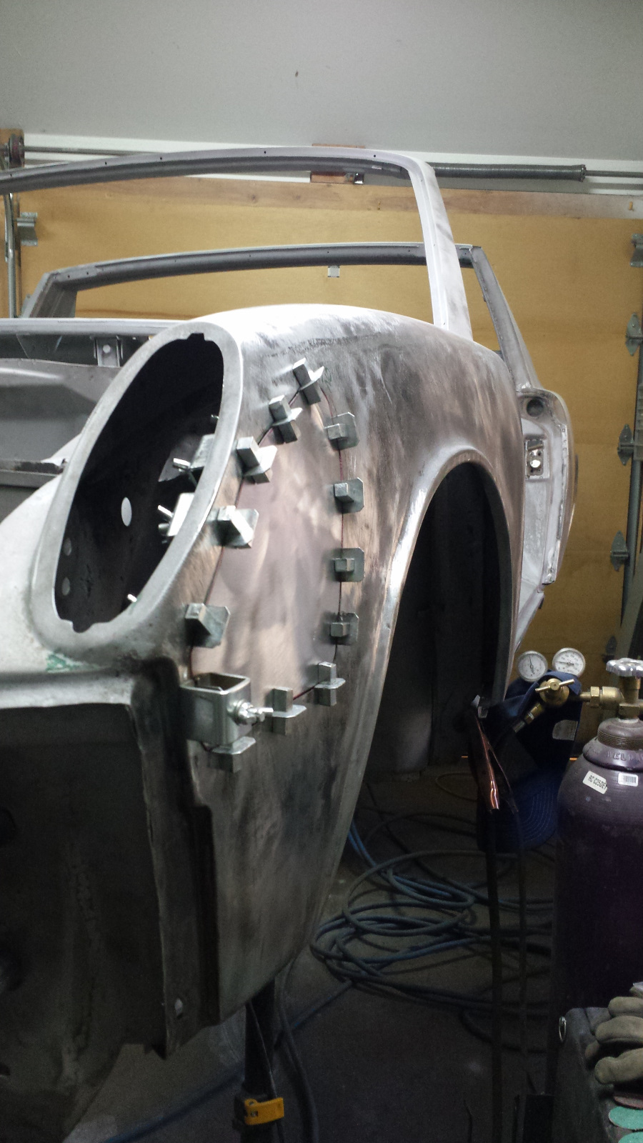 Up until now, my priority has been getting fresh metal onto the car. The longer a part sat in my overly cramped shop, the more likely for it to get stepped on, tripped over, or lost. That meant leaving a lot of metal finish work for later and a lot of embarrassing rough edges on the car. Now I finally get to clean up all the ugly crap that has been bugging the (IMG:style_emoticons/default/stromberg.gif) out of me. I'm starting from the front moving back: grinding welds, chasing pinholes, smoothing snaggle-toothed flanges, and stuff like that. Plan is to straighten, grind, and smooth as much as I can, then give the whole chassis phosphoric acid treatment inside and out. Then I will go over all weld seams with the kevlar reinforced and zinc enriched filler that Ben ( @mb911 ) turned me on to for final finishing. I need to figure out a way to mimic spot welds on those flanges. I've seen a few techniques on restoration forums but none that jump out as a great solution on flanges like these. One guy made a custom dimpler with vice grips which looks slick, but so much of these flanges are welds that I think the flange is too hard to dimple that way. I think I'll experiment with a small carbide burr to see if I can just grind little divots that will mimic spot welds when painted. |