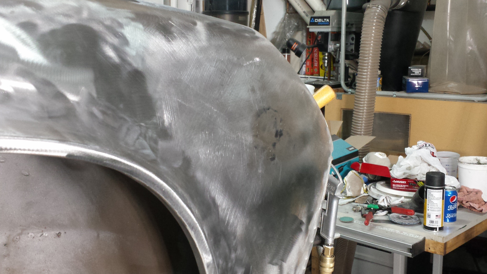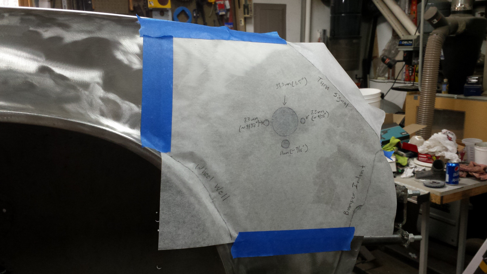 First, let's make a template in case warts become a fashion statement in the future and I need to put them back. After guide coat, block sanding, and banging on it a bit. If I had a bullet pick, I think I could bring those last few low spots around the welds up. Not sure it is worth it, a tiny bit of filler is all it will need. |