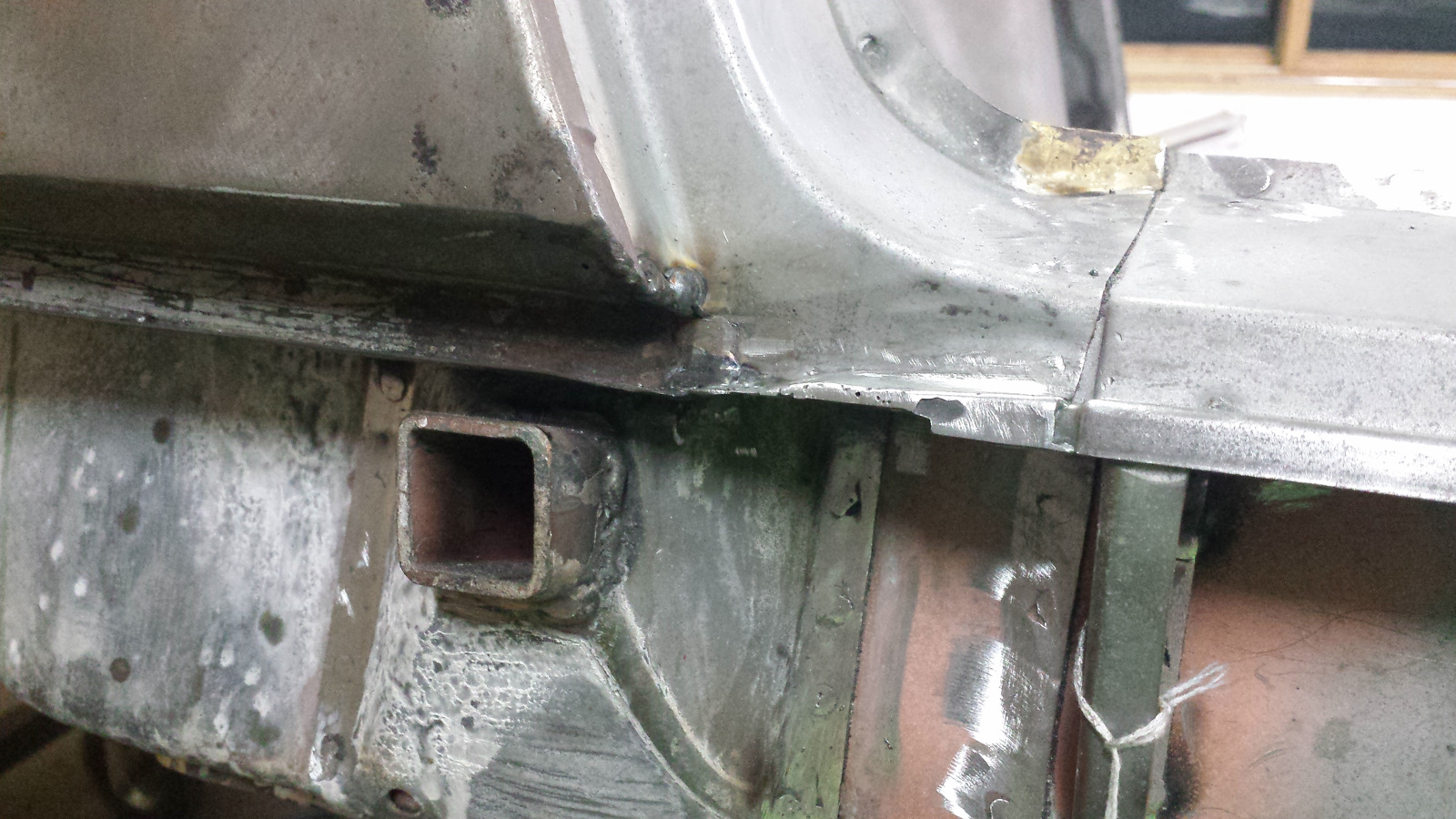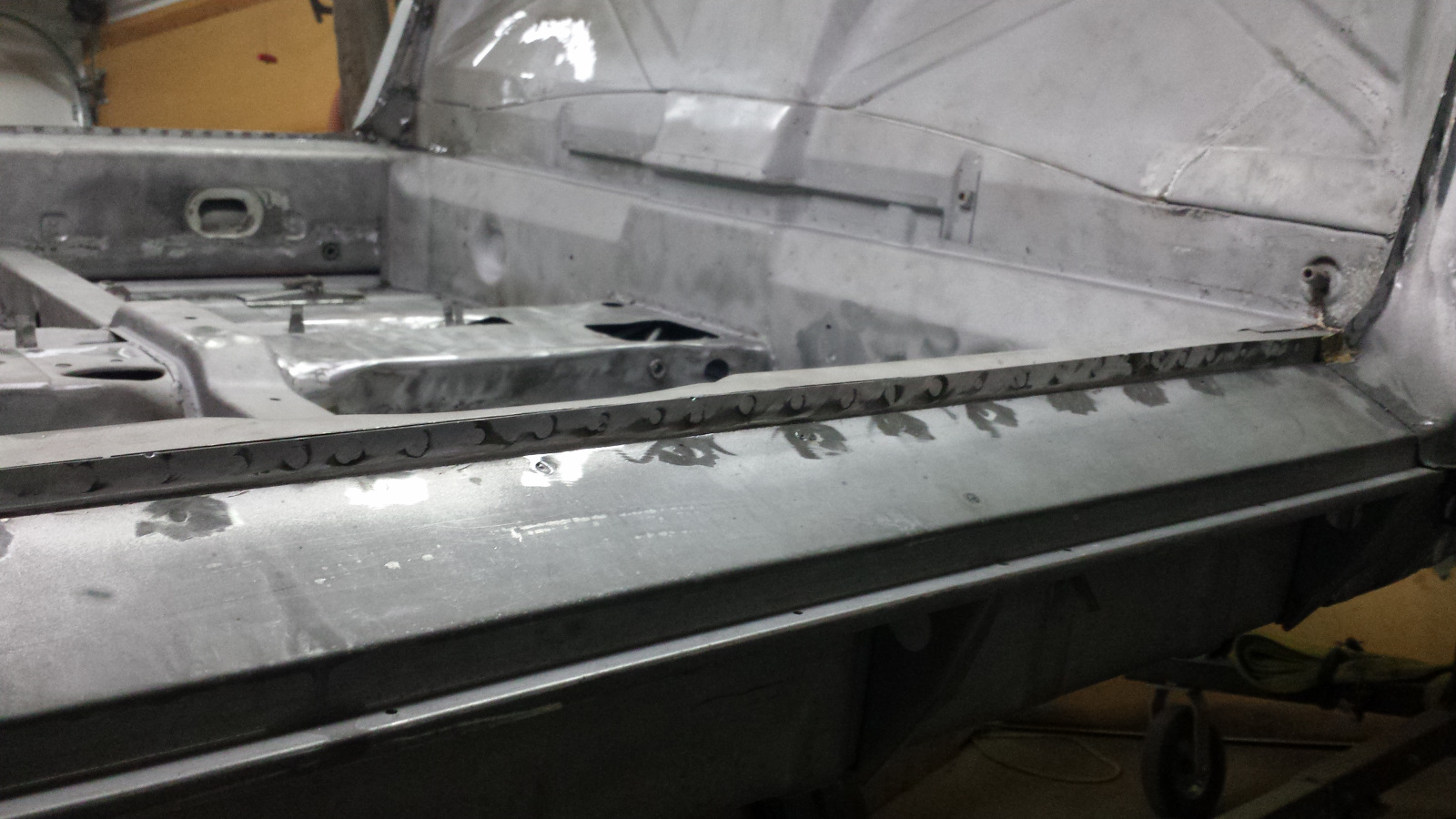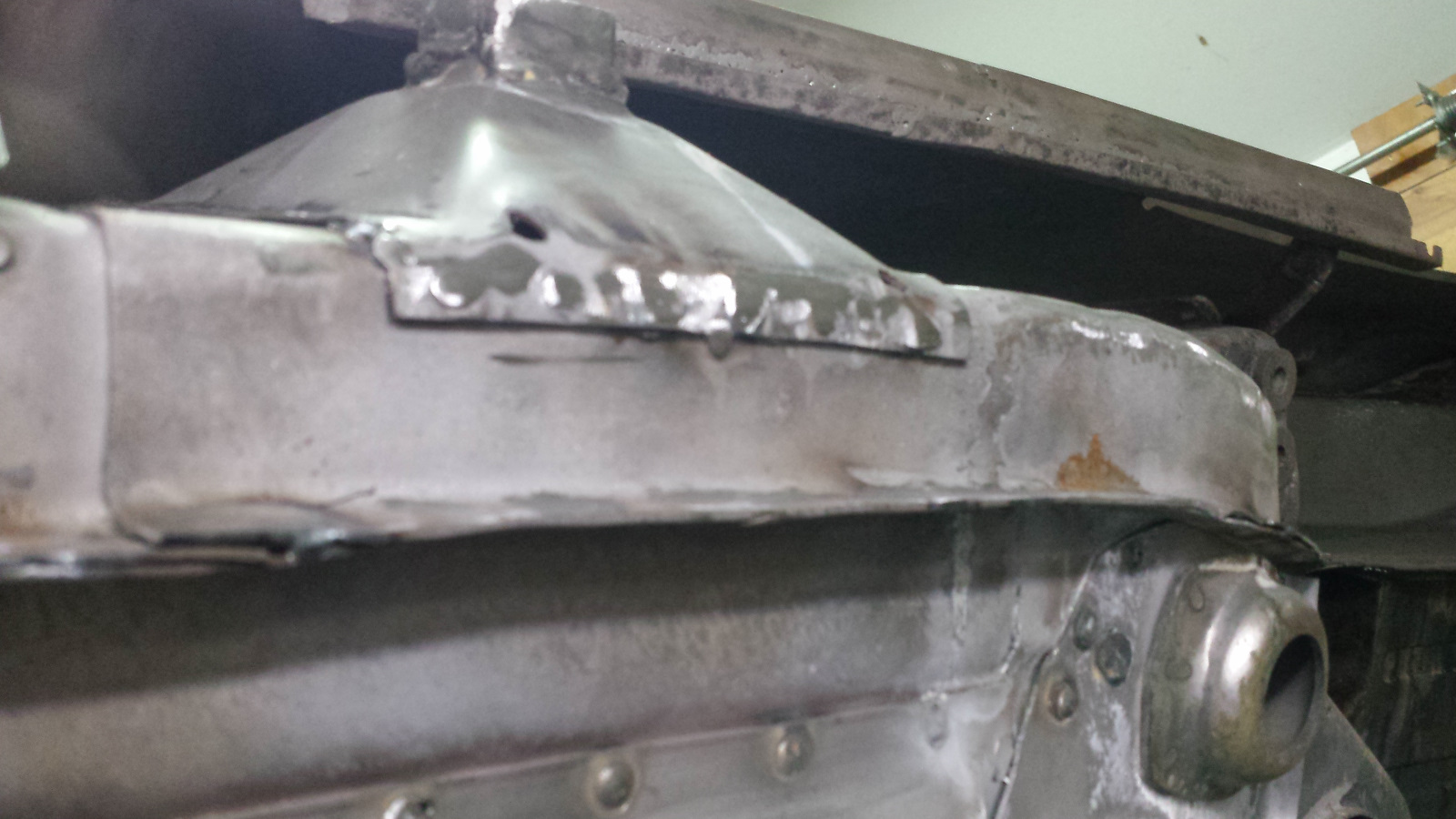 I've been busy but unfortunately, this is probably the most boring part of the project for you all, but gratifying for me because the chassis is finally starting to look in life like it has looked in my mind for a long time. I've been meticulously going over all chassis front to rear cleaning all the boogers and turds off: making sure every plug weld is completely filled and ground flat, tuning the flanges so they are straight and even, all butt welds are light tight and ground flat, and generally getting the metal as close to perfection as my limited skills will allow. It's looking really good but sadly, phone pics don't do it justice and it won't be acceptable until I've applied a little filler to smooth welding shrink lines that seem to pop out like huge zits in photos. Here's just a few pics but I'll keep them to a minimum so it doesn't get to tedious. |