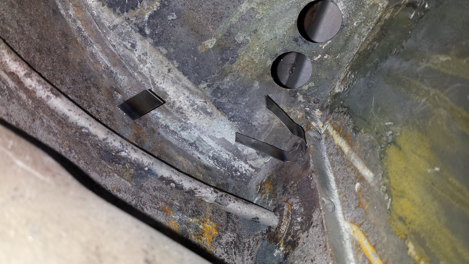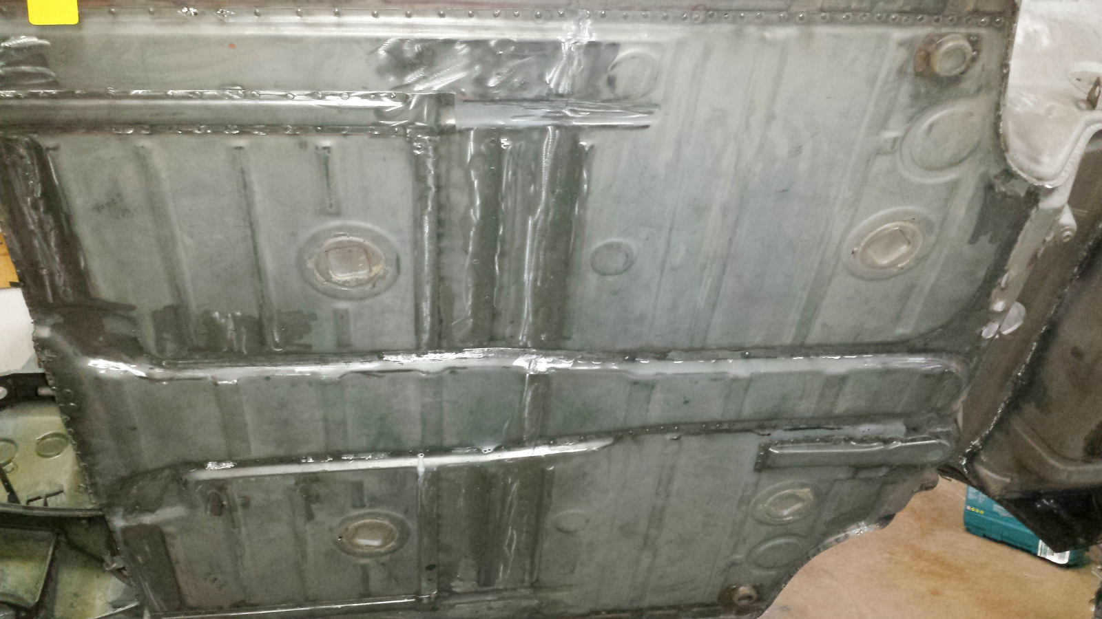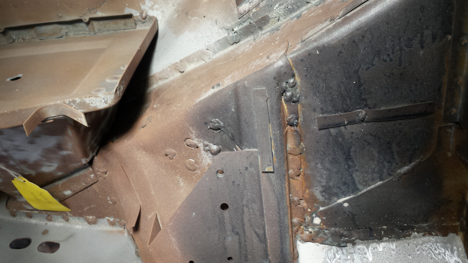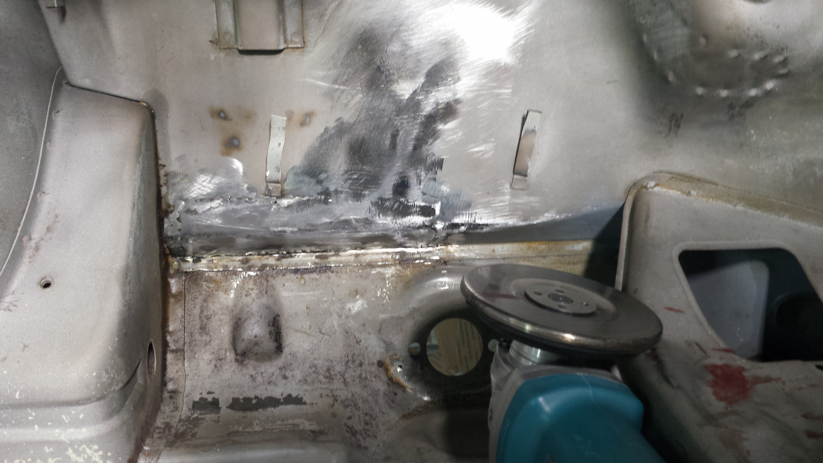 Backside isn't too bad either. Photo doesn't do just to how narrow that crevice at the bottom is. If it wasn't going to be buried under spray-on seam sealer, I'd get in there with a carbide burr and clean it up more. It did extract its pound of flesh though. Floor pan looks like a crime scene. I couldn't work in that cramped space without the cable ties on the tunnel digging into my arm. No biggie. I've said I'd completed my last patch before, so I won't jinx it - just quietly hoping. (IMG:style_emoticons/default/unsure.gif) |