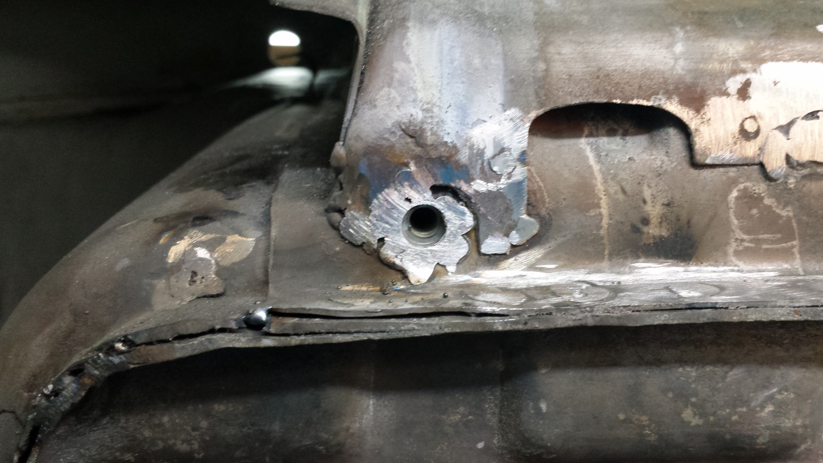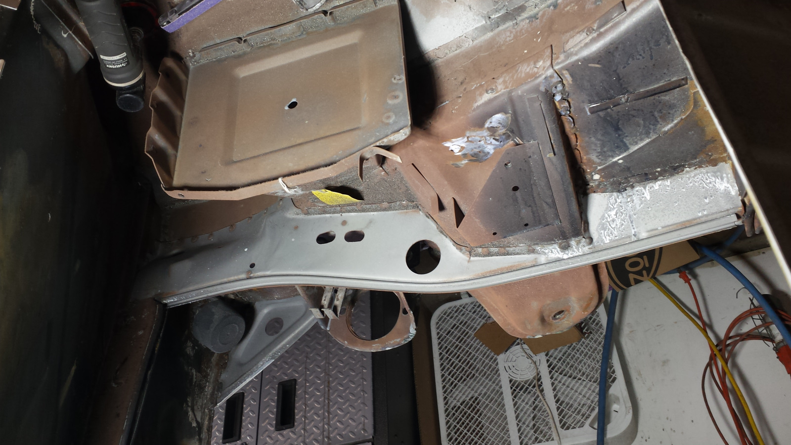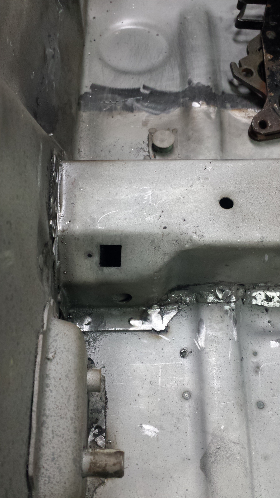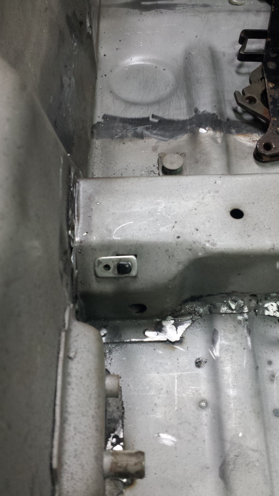 Backside isn't too bad either. Photo doesn't do just to how narrow that crevice at the bottom is. If it wasn't going to be buried under spray-on seam sealer, I'd get in there with a carbide burr and clean it up more. It did extract its pound of flesh though. Floor pan looks like a crime scene. I couldn't work in that cramped space without the cable ties on the tunnel digging into my arm. No biggie. I've said I'd completed my last patch before, so I won't jinx it - just quietly hoping. (IMG:style_emoticons/default/unsure.gif) |