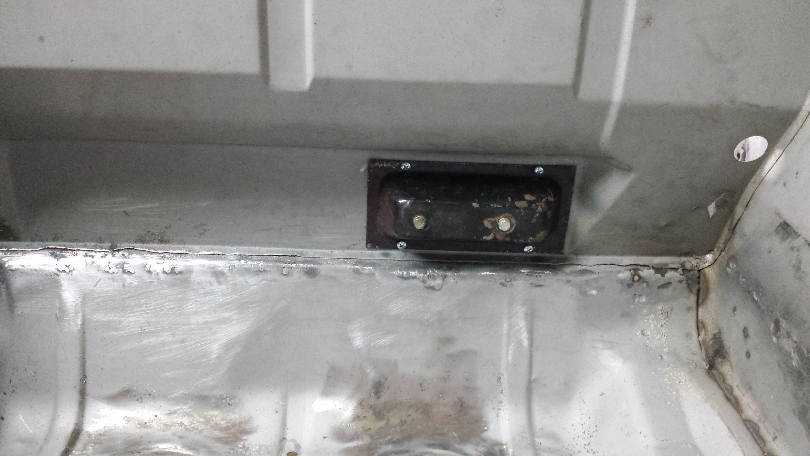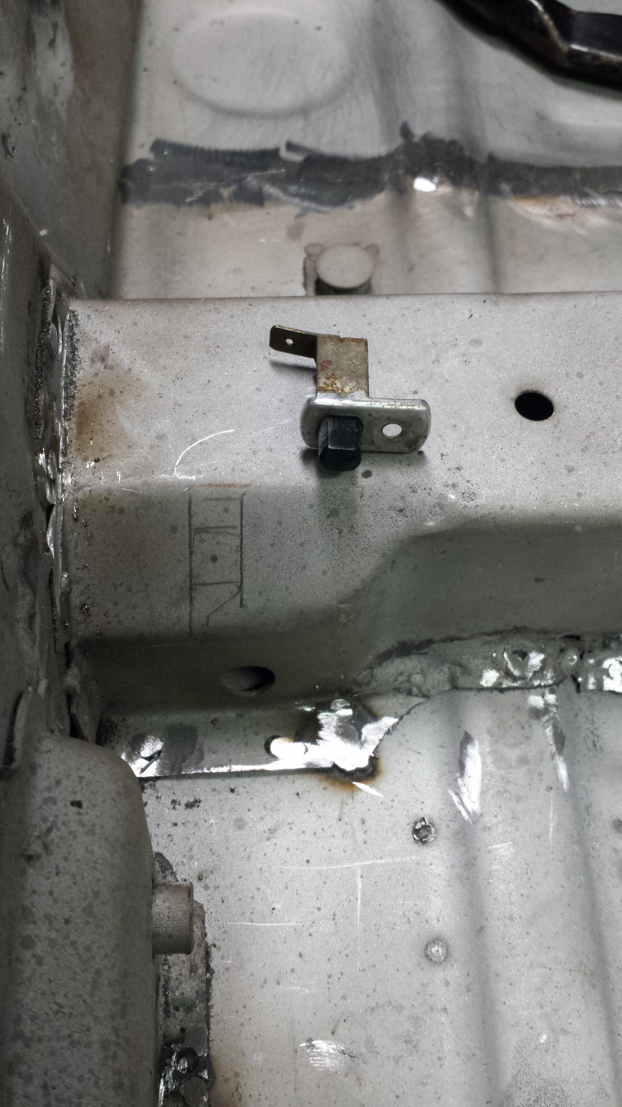 This evening I went to the shop with the intention of patching that footwell, but decided I wasn't in the right mood so went for something easier and more fun. You may recall that I had to fabricate and patch the driver's end of the cabin cross member. It originally looked like this. (IMG:style_emoticons/default/barf.gif) When I soaked the original e-brake switch in rust remover, it disintegrated, leaving me with no pattern for replicating the mounting hole until I got a new switch. Among some parts I bought from @raynekat 's end of project bargains was a collection of door switches and pieces. I bought them hoping there might be a single pole switch in the batch. There was! Now I could lay out to finally finish the cross member repair. After a bit of drilling and filing, I had what I was after. It even works (IMG:style_emoticons/default/beer3.gif) |