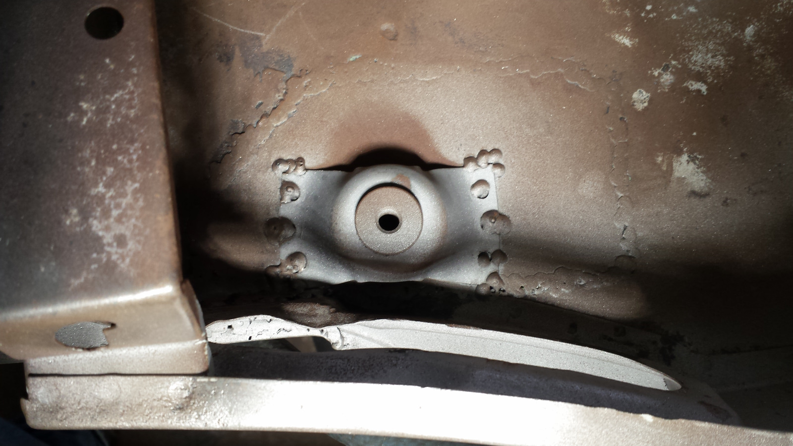 Still a work in progress so no "after" shots yet. The day I finished blasting was cool and rainy so the engine bay flash rusted right away. Thought this was interesting; can you pick out the RD Galvanneal panels? I got a package from Belmetric today which let me take care of that yellow tag on the battery tray. Nice to have that done. I wasn't going to grind the plug welds under that battery tray, but now that I see this photo, I've changed my mind. (IMG:style_emoticons/default/barf.gif) |