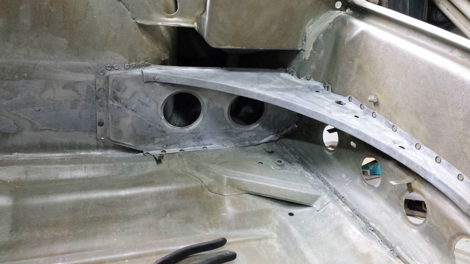I couldn't put off putting in the front trunk braces any longer. In honor of the frankenmost nature of this car, even the braces had rotted at the bottoms to be patched with what was salvageable from the donor trunk. They've been welded up for a long time but welds needed to be ground and filled. Then test fit. I left the nubs from the original spot welds to help realign the parts on reinstall. It really helped and this way I just need to weld the piece back to the nubs. The reason I put off installing for so long is because I was trying to figure out the best way to paint under the headlight buckets and the backsides of the braces. I decided to just shoot epoxy primer. I'll try to scuff it as best I can later and shoot color the best I can. Worst case is the color won't adhere well but the area will be well-protected with the primer. I went ahead and shot the floor of the frunk too but masked off areas to be welded. Then I applied brush-on seam sealer to the areas behind the braces. I did it the German way - nice and sloppy. It's a pretty good match to the original. Yet to be done is convince the brace to lay flat on the wheel well. I tried pulling it in with screws, but because of the curve, it needs to move in and forward at the same time. I have a plan but thought this would be a good place to quit for the night. I got them mostly welded in. Still some more work on the passenger side to do and all the welds need to be ground and dressed. But looking pretty good. |