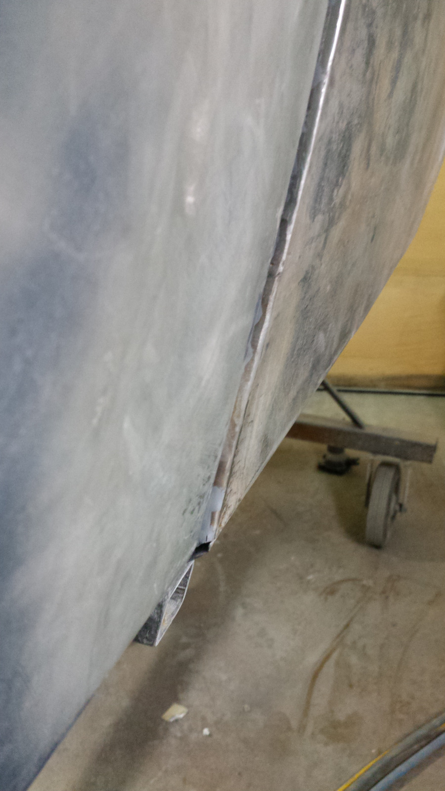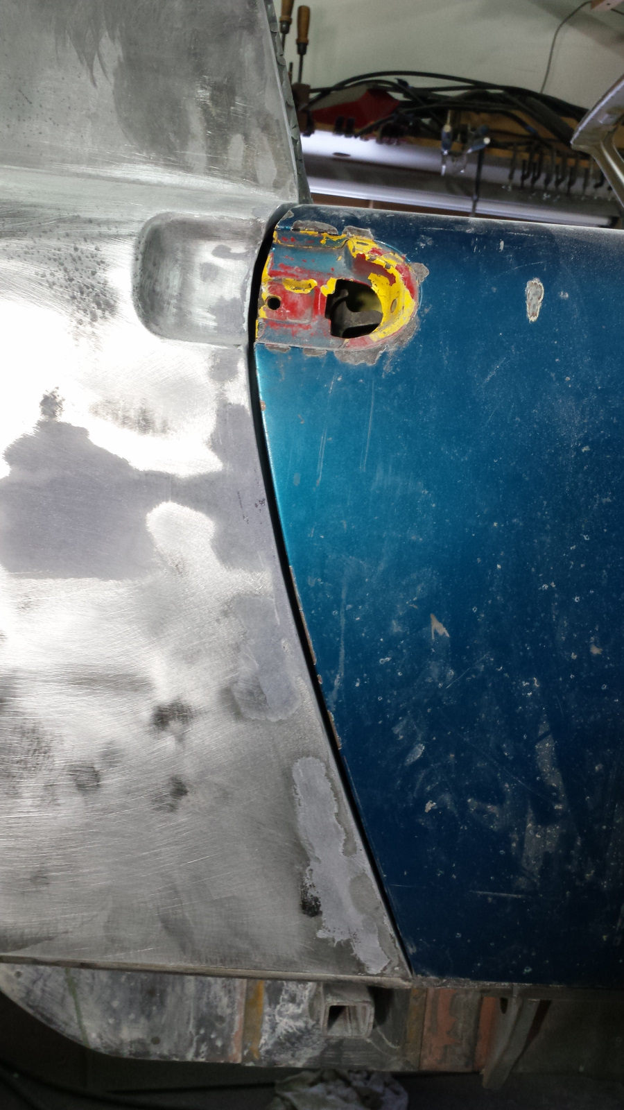 Metal bumping takes a LOT of time. Most of it has gone pretty well but the passenger side quarter has been a challenge. Before I owned the car, that panel had been hit, dirlled and pulled, gouged, and slathered with a thick coat of Bondo. Then I cut it and rewelded. In other words, it was a mess. After hours with hammer and dolly and the shrinking disc, I got it close, but not perfect. Low spots are quite shallow (less than 1mm) and the panel is tight with no oil canning. I'd love to keep working those low spots but I'm I'm im a race against Mother Nature so don't feel I have the luxury of spending several more hours. I may come back to it if time allows. Lack of skill is definitely a limitation, but there is another that prevents this panel being perfect. There is mild pitting on the backside of the panel. In hindsight, I could have tried filling the pits with the Fiber Tech filler and smoothing before metal bumping, but I didn't so those little pits telegraphed through so will need filler on both sides to get smooth. I started with the passenger side. I F'd up the gaps stupidly trying to sharpen the corners along the lock post with a hammer. I cut a piece of flat bar to let be reach inside the quarter panel and massage the metal back where it belonged. That worked pretty well. The gap averaged about 4mm which is good, but wast narrower at the bottom and a bit wider at the top. I've obsessed over any pics posted showing door gaps over the last year and a half and paid particulary attention to survivor and unrestored cars. I've noticed that gaps narrowing at the bottom is pretty typical so I decided to leave the bottom alone, but I wanted a max of 4mm at the top so started by added a bit of metal along the lock post edge. Next I sprayed the edge with gray primer and set my compass to 4mm to strike a line to grind to. Not looking too bad after grinding. Next was applying a bit of the Fiber Tech filler to smooth the edge and refine things a bit more. I'm pretty happy with the result. The gap a above the door lock is still a tad wide (~4.5mm - 5mm). I might revisit that later but this also seems fairly common so it isn't bothering me too much. My goal here is to have a car that looks factory fresh - no more, and no less perfect than the factory produced (but with better rust protection (IMG:style_emoticons/default/smile.gif) ). I have a couple minor dings to tap out on the extreme rear quarter and after that, I think this side is ready for final prep for primer. This is only the DTM reinforced Fiber Tech filler over welded patch, but so far, doesn't seem like an embarrassing amount of filler. There will be more conventional filler applied over the epoxy primer but I'm confident that I'll have reduced the amount of filler that was on this car by about 95%. The only thing I did on the front gap was adjust the patch at the bottom of the fender for perfect alignment with the door. Again, it narrows toward the bottom but that seems typical. The gap at the top is a tad wide but the door is hung about 1mm too low so that will tighten up with final (and proper) door adjustment. Okay, lunch break is overy, I'd best get back at it! |