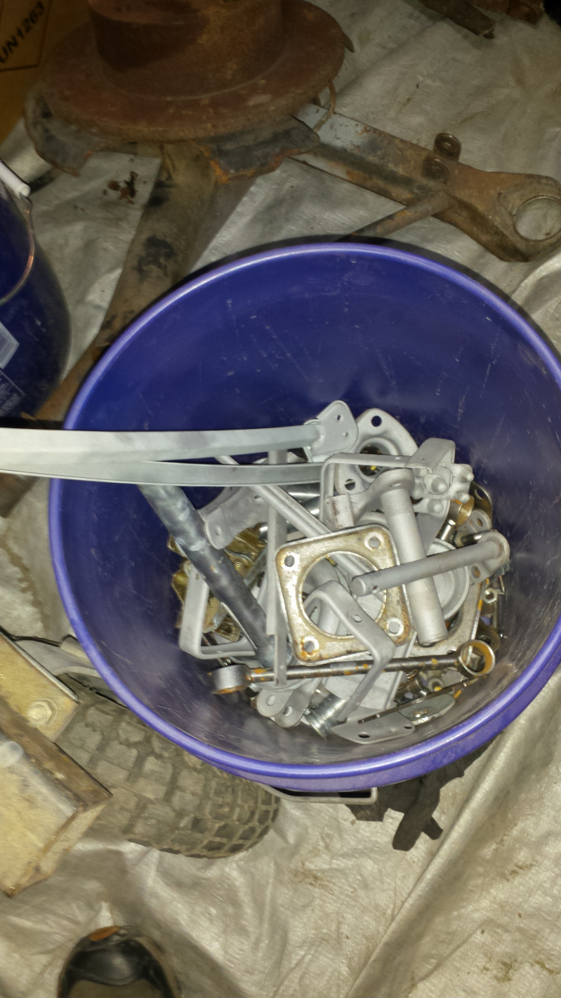 I made some decent progress on cleaning parts for plating yesterday evening. I got the last (for now) of the larger parts to be plated blasted. The "cleaned" bucket is getting more full and the rust bucket is empty although I still have a pile of small parts in the vibrator and in front of the wire wheel to do. The clean stuff will get another inspections and more cleaning as needed.