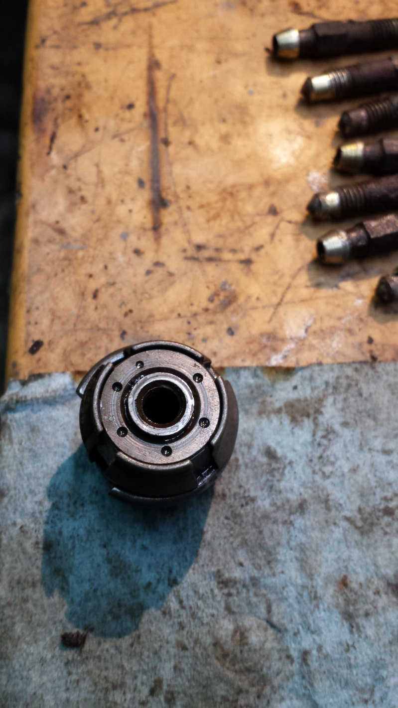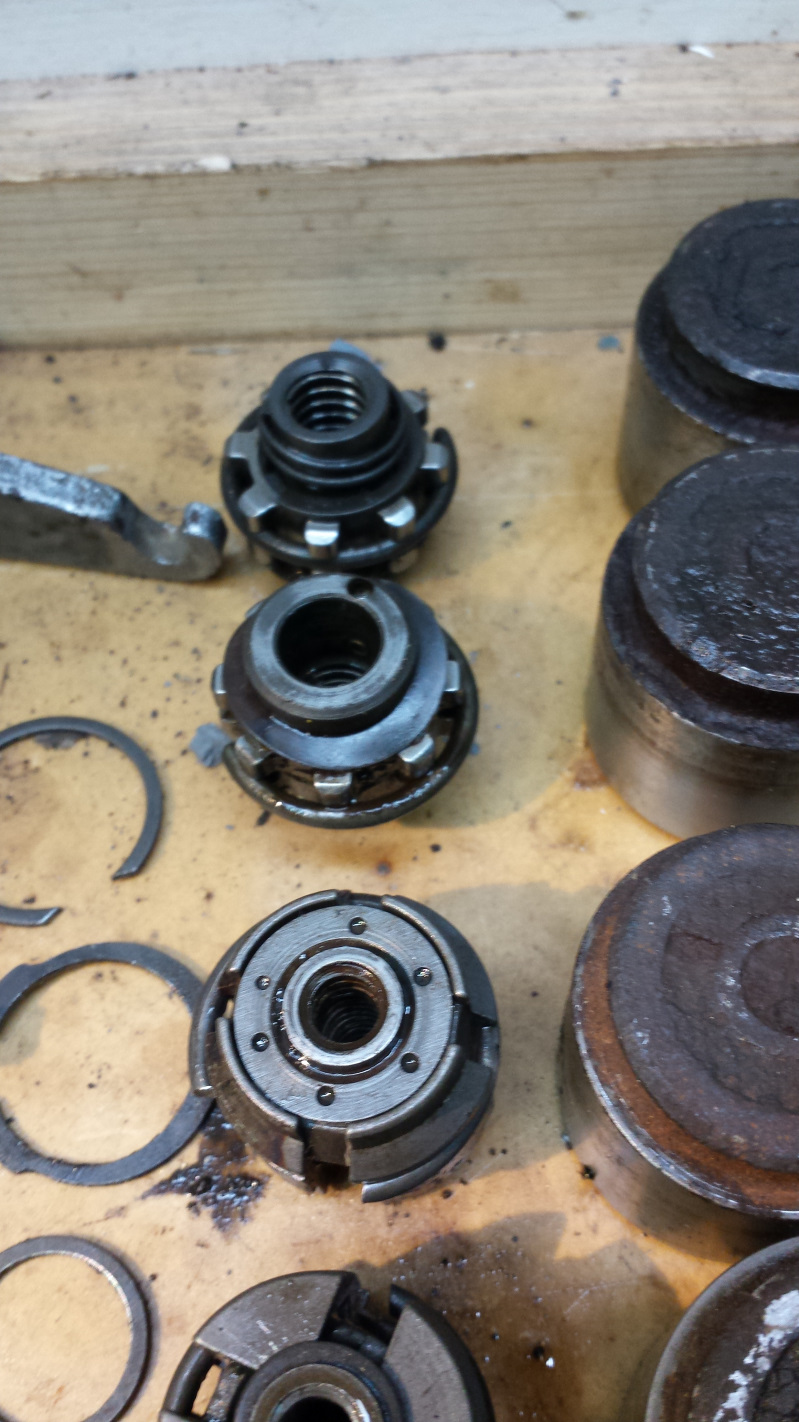 There is considerable difference between the early and late adjuster mechanisms. While the late adjusters are typical German with simple efficiency and only the necessary parts, the early adjusters are a Rube Goldberg sort of affair that is positively idiotic. The hub for the screw floats inside a series of gadgets interconnected by springs. Once the piston is removed, there is no pressure that locks the hub that the screw goes in with the rest of the mechanism so it just spins free. This was a BIG problem since the reason the piston wouldn't screw out was because the screw was seized inside the hub, hence the spinning without pushing the piston out. I tried all sorts of bad ideas to try to get enough leverage to break the screw free from inside the hub. What finally worked was pushing down onto the spring loaded top in one of several holes with a scratch awl and gently tapping with a small hammer. This simultaneously put downward pressure to lock the apparatus with the hub and spun the hub off the screw. Finally, success! Here's the complete assembly of brake bits to be cleaned and restored. And here's both late (rear 2) and early (front) adjusters. The late ones are German simplicity. The early ones are complicated pieces of shit. Here's a close up of that trouble making little fucher. I wonder if I can find a tap to match the threads of that hub. I'd like to chase those threads clean up some slight roughness from the rust. That's it for now. Got another project I've been working on that I'll report on tomorrow. (IMG:style_emoticons/default/beerchug.gif) |