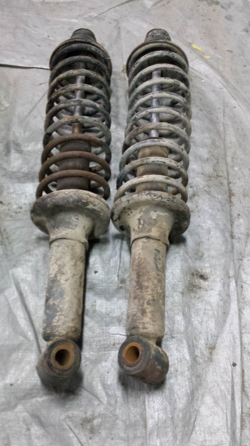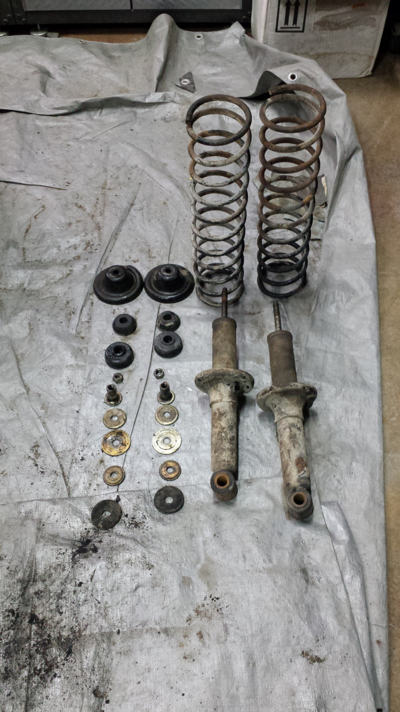 I think I'll walnut blast the housing before reassembly. I might have a replacement bearing in the mail tomorrow compliments of @mb911 and ordered a second and the seal. Ben, I confirmed your bearing is the right one - THANKS (IMG:style_emoticons/default/beerchug.gif) In the end, that was a lot of work to scavenge those three bolts above the retainer springs for plating, but sooner or later, it had to be done. Oh, I'm installing turbo tie rods. To refurb the old ones would require new rod ends, bushings, and bellows. Kind of a no-brainer to go turbo. Next up was finishing off the brake pistons just to get them off the bench. A few hours in the vibratory tumbler and then some high temperature gray paint. So what's the opinion on this one? No, I didn't grab hold of it with vice grips (IMG:style_emoticons/default/slap.gif) That chip was actually corrosion. I think it will be okay but curious what you smart people think. (IMG:style_emoticons/default/confused24.gif) Finally, I tore down the rear shock towers to harvest bits for the platers. Those shocks no son buenos. Anyone no where to find Boge/Sachs rear shocks anymore? I'd like to keep the ride as close to stock as possible. I'm going to test the rate on the springs. Not sure where to find stock springs anymore either. (IMG:style_emoticons/default/confused24.gif) That's it for now. |