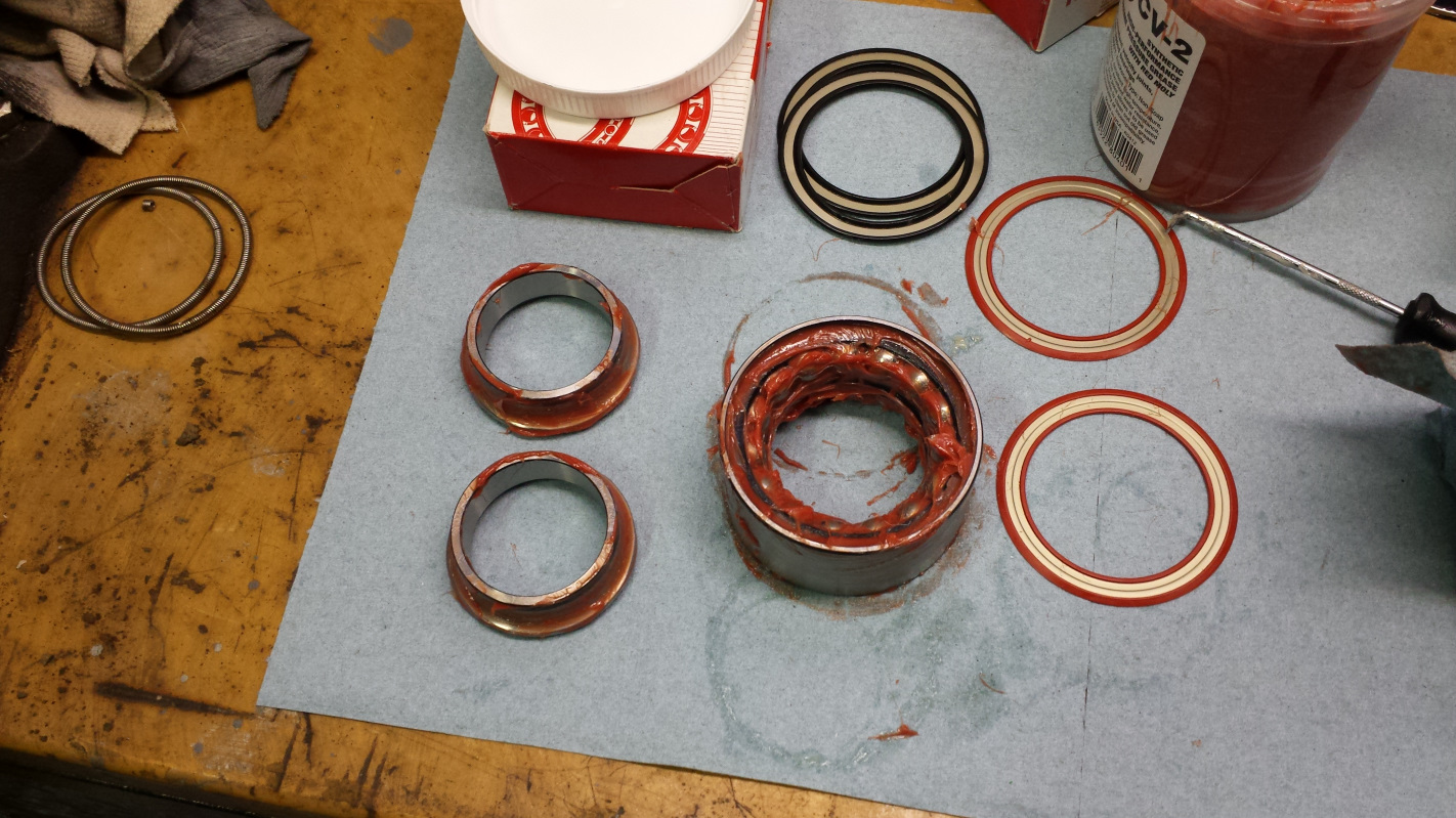 Of course the first thing to do with a new set of sealed bearings is to tear them apart. Wait... what? But why? I've been reading a lot about premature bearing failure and it turns out these Slovakian bearings are coming out of the factory improperly greased. There are a couple good Youtube videos on this. I wasn't taking any chances. The first bearing I popped open actually wasn't too bad. The grease on the outer race sides of the bearing cages was on the skimpy side but it might have been okay. However, one vid claims the factory grease is only rated to around 250F. I don't know what typical wheel bearing temps run, but that seems a little close. This redline stuff is rated for something like 800F so seems like cheap insurance. Here's the first bearing greased and ready for reassembly. I popped open the second bearing and it was downright scary. It doesn't show well in this pic, but there is no fuching grease in there! (IMG:style_emoticons/default/yikes.gif) There is a smear of grease on the inner race side of the cage but the outer race side is bone dry. I mean DRY! How the fuch are they getting away with this? (IMG:style_emoticons/default/blink.gif) Anyway, takes maybe 20-30 minutes per bearing and they are all back together with a good pack of quality grease. Time well spent. (IMG:style_emoticons/default/beerchug.gif) One last pic just to show off what else I got from PMB. New soft brake lines, new bronze pedal bushings, and those pretty yellow tubes. I'll probably wind up buying a pair for the front too. I just need to let the sticker shock wear off a little first. |