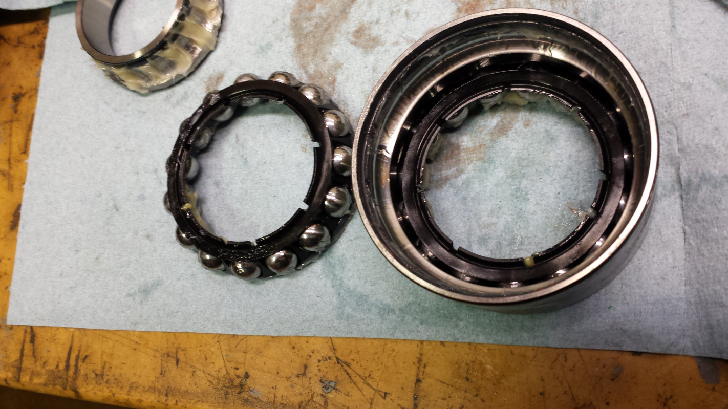I popped open the second bearing and it was downright scary. It doesn't show well in this pic, but there is no fuching grease in there! (IMG:style_emoticons/default/yikes.gif) There is a smear of grease on the inner race side of the cage but the outer race side is bone dry. I mean DRY! How the fuch are they getting away with this? (IMG:style_emoticons/default/blink.gif)