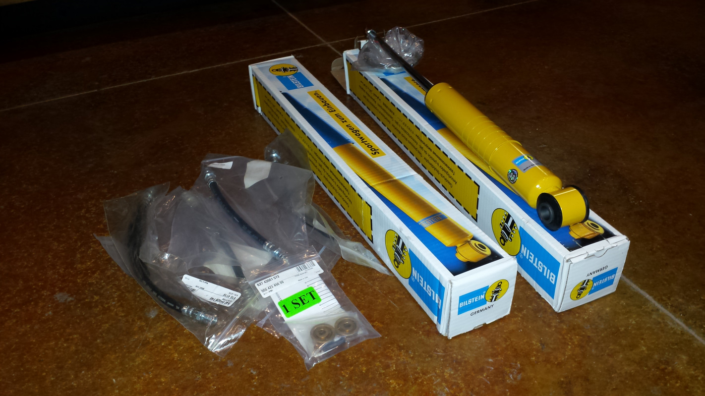 The immediately went in the car. I need to get some 30R14 hose to connect them together as well as some small pieces of hose to wrap the lines at the metal hold downs. I think I'll mount the bypass fuel regulator for the carbs on the MPS bracket. Should make for clean routing of fuel hoses for the supply and return. I also recieved a package from @KevinW . The missing brake part problem is solved as well as a nice pair of rubber springs for the rear struts. Thanks Kevin. (IMG:style_emoticons/default/beerchug.gif) |