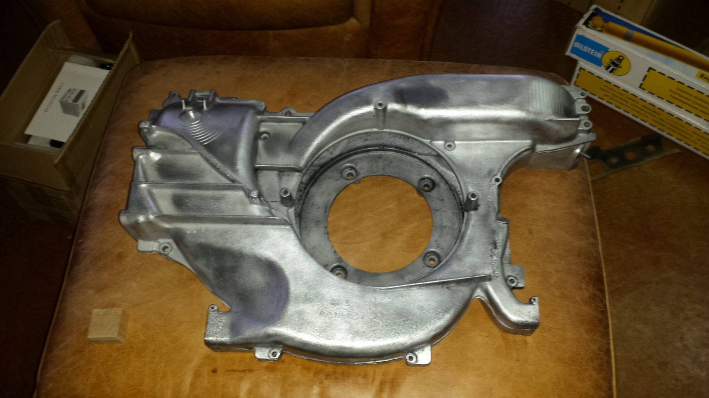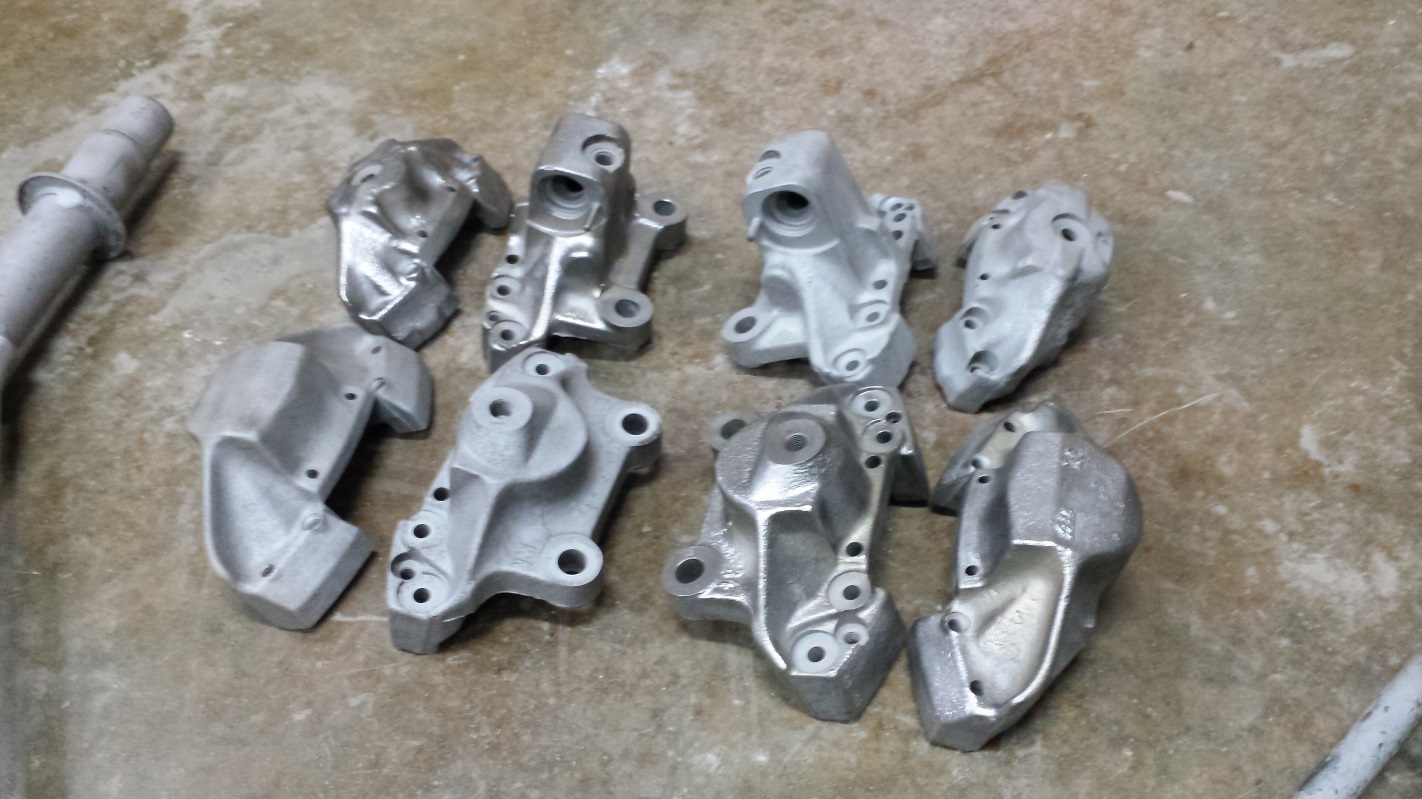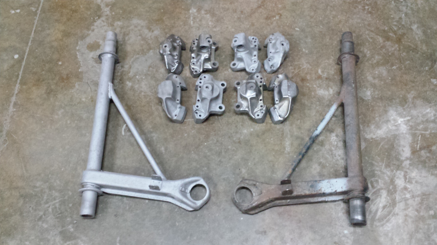 cup full not empty But does it runneth over? Ok, here's a little catchup of some tasks that go back to the weekend before New Year's Day. I decided to clean up the engine fan and shroud. That seems random, but there was some logic behind which is long and boring to describe, so I won't. I wound up just blasting them with crushed glass because I didn't have much luck with walnut shell. This pick shows the fan after media blasting followed by brushing with a brass wire wheel against the untouched fan shroud. And here's the shroud after the same treatment. Both were sprayed with Boeshield T-9 for protection because it was recommended on another thread. Seems like good stuff but time will tell how it protects over the long haul. The fan was a little frustrating because I picked up a can of VHT primer on New Year's Eve and went to paint the fan pulley the next day only to find the paint had gone to shit. I suspect it had frozen as the pigment just puked out in solid chunks causing me to have to reblast the pulley and put the task on hold. Finally climbed off my hermit mountain last week and exchanged the paint, so finished the job this morning. It isn't bolted together as that hardware is in the plating buckets. Here's a shot with the repainted timing marks. The story on that black mark is in this Mystery Mark thread. My other task today was to do something about this box of rusty brake calipers. Oh yeah, I also finished blasting the A-Arm that has been in the blasting cabinet for weeks. Look closely and you can tell which one it is. A better shot of the calipers. Two of them have taken a ride on the wire wheel. I'm told the shine will show through after plating. |