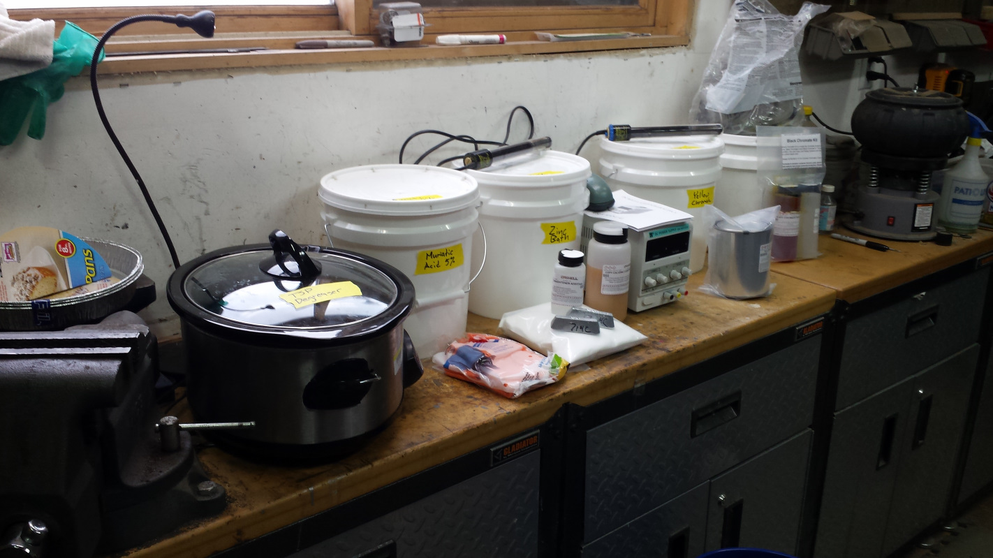 Okay, I said exciting things were afoot so here's one of them. This post belongs as much to @doug_b_928 as it does to me because if he hadn't jumped off the cliff first, I might not have done this. Doug also introduced me to Mike M's channel on Youtube where he documents his 911 restoration in phenomenal detail. If you haven't seen his vids, check them out. So what's the fuss about? Well, I've been slowly gathering parts for my deluxe home chemistry set. Being a CSOB, I managed to piece together what amounts to the Caswell Copy Cad system for about half the cost. Caswell charges about $200 for their smallest kit, plus you have to buy the yellow chromate and power source separately, plus a bunch of buckets. Instead of buying the kit, I just bought their 2-part plating bath chemicals, yellow chromate, black chromate, and zinc brightener. Then I found an adjustable DC power source for $35, a pair of zinc ingots for $10 on ebay, bought a bunch of buckets at Lowe's, and found a large crock pot at the local thrift store for $12, and substituted TSP that I already had on hand for the degreaser that would have come in the Caswell kit (which very well might be TSP). I also had a couple aquarium heaters and air pump on hand. All total, I am in at about the cost of just the kit from Caswell. There are plenty of youtube vids on the process, so I won't bore you with that. So how did it work? For my first test run, I grabbed a handful of bolts from my spare parts tray. I purposely selected bolts in various stages of prep because I wanted to see how sensitive the process was. Very first batch came out of the plating batch looking like this. That pic doesn't do them justice. Yes, there were flaws on the parts with poor prep as I expected, but mostly they looked almost like chrome. (IMG:style_emoticons/default/piratenanner.gif) And after 20 seconds in the yellow chromate bath, they look like this. I couldn't be happier. Off to a good start, I spent quite a bit of time yesterday and today plating a few choice items. Here is the result. Mostly yellow zinc but there are a few pieces with black zinc and also some with plain zinc. One of the clips next to the black clevis pins is a new OEM piece, the other is one I plated. @KevinW and @PCA7GGR , do you recognize any of those e-brake parts? (IMG:style_emoticons/default/shades.gif) The frunk latch and fuel cap are going to get redone as there was a mishap. The copper wire I had on hand was a little too thin gauge and those parts fell off the rod in the plating bath. It's pretty similar to dropping a part covered in wet paint. Here's a better pic of the mess it made on the fuel cap. I'm thrilled to have this in my arsenal of capabilities. No, it doesn't mean I'll do all my own plating. I think home plating every nut and bolt on this project would be too time consuming and not really worth it. It provides a lot of flexibility though. For example, consider this e-brake cable that KevinW generously donated to my project. Sorry about the poor choice of backgrounds for this pic. I was able to plate the whole piece in zinc and then just chromate the ends to replicate how it came from the factory. I couldn't do that sending it out. I'll also be able to plate parts as needed to reassemble components which I think will help a lot. Now it's time to put some shiny parts on the car. |