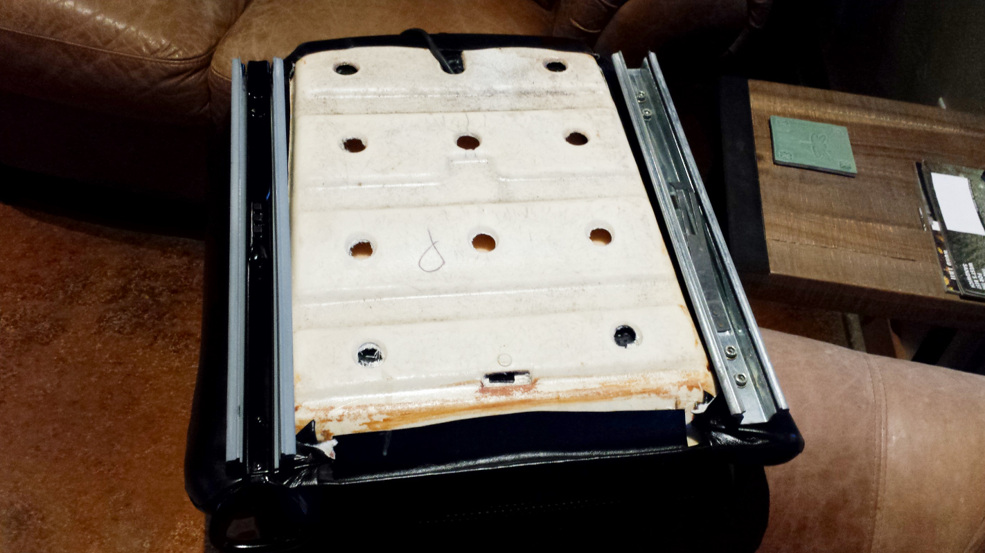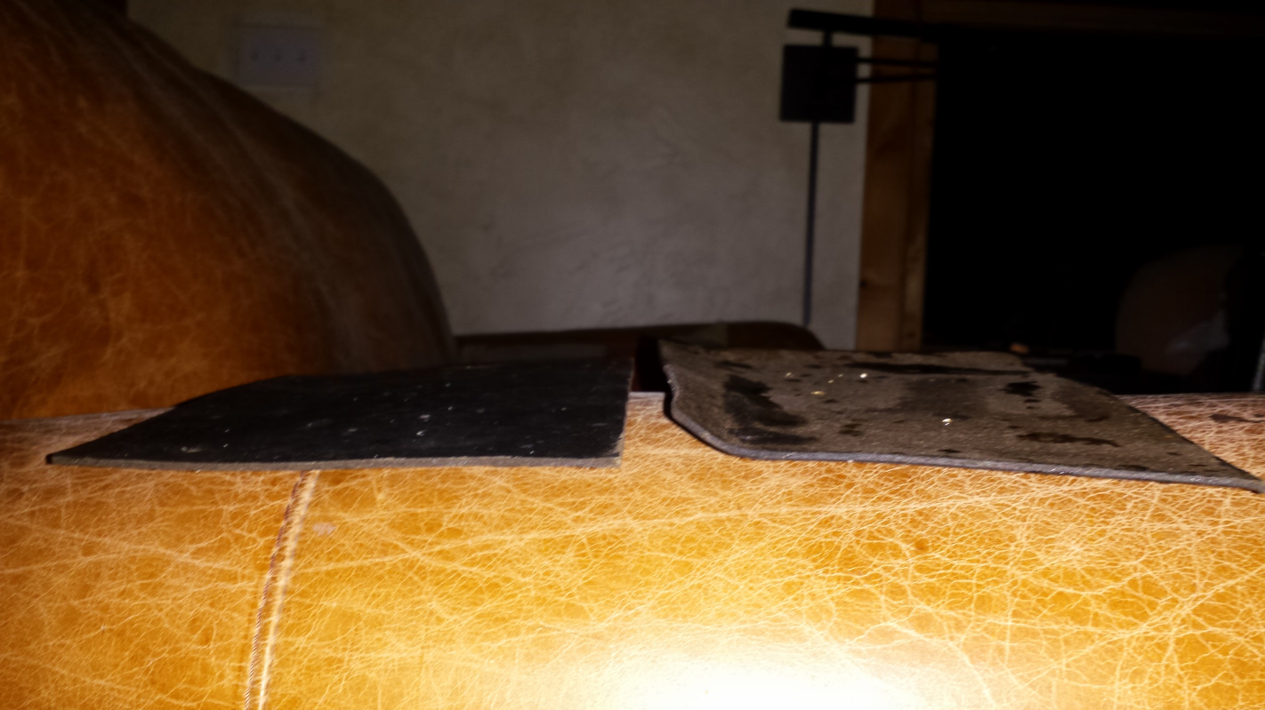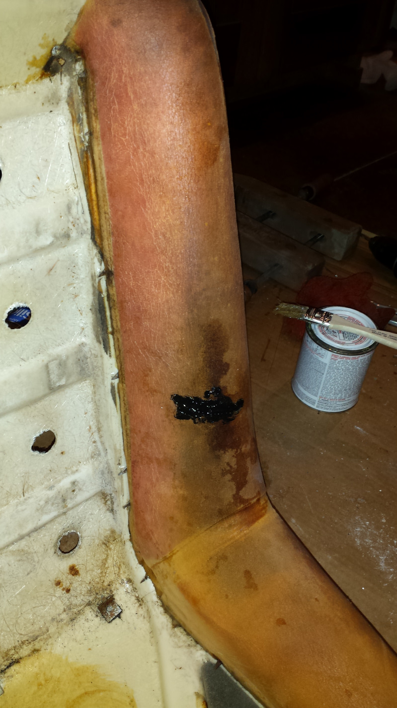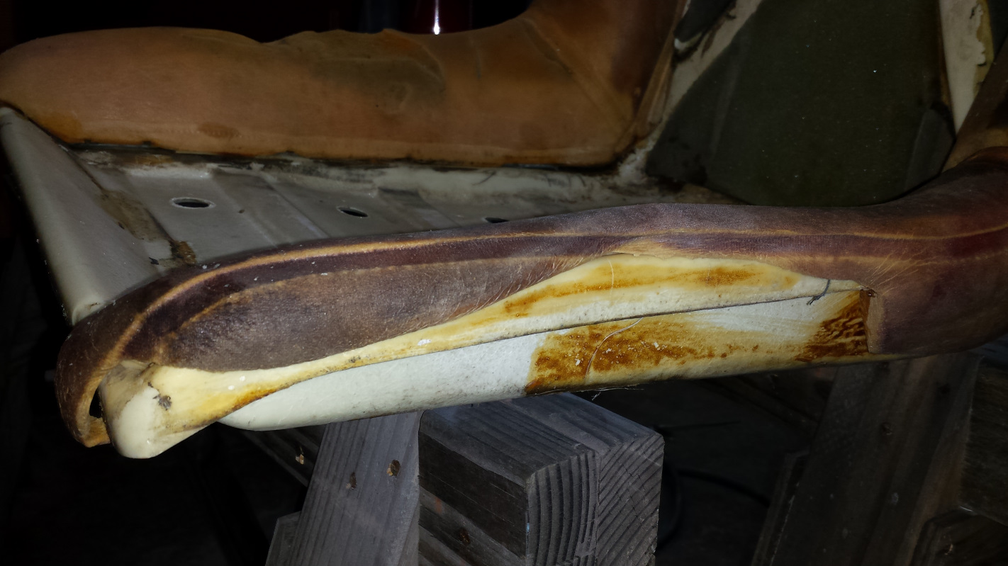 That darkest one is an evil SOB that had a bolt seriously corroded and seized into it. I tried fire, penetrating oil, vice grips, and an easy out to get the stub of that bolt out with no success. I finally gave up and started drilling it out to insert a helicoil and, as often happens, just as the drill started to exit the bolt, it spun loose. Problem solved. I'm hoping the replacement bolt arrives from Belmetric today. Those prongs look kind of nasty, let's see how a nice layer of zinc looks. (IMG:style_emoticons/default/smile.gif) The original rivets seemed pretty marginal and, being metric, and just a smidge larger than 1/8," and 1/8" rivets left them a little loose. I drilled them out to 3/16" which seemed a lot better. The passenger seat was in much better condition. Just a small nick that I just filled with silicone, but it was hiding a blemish. That seat always had an ugly bump on the bolster which I assumed was a piece of crud trapped under the vinyl. It turned out to be a hard knot in the foam. I sanded it out and tried to take a pic, but you can't see anything. It is the orangish area about 8" above the slicone. I didn't take any pics of putting the vinyl on. Pretty standard and covered in tutorials in the classics section. I did learn from my mistakes on the second seat and went back and restretched the vinyl on the first one after I figured out what I was doing. |