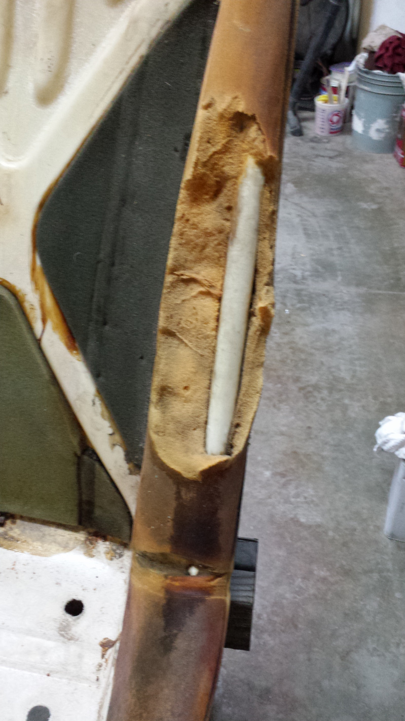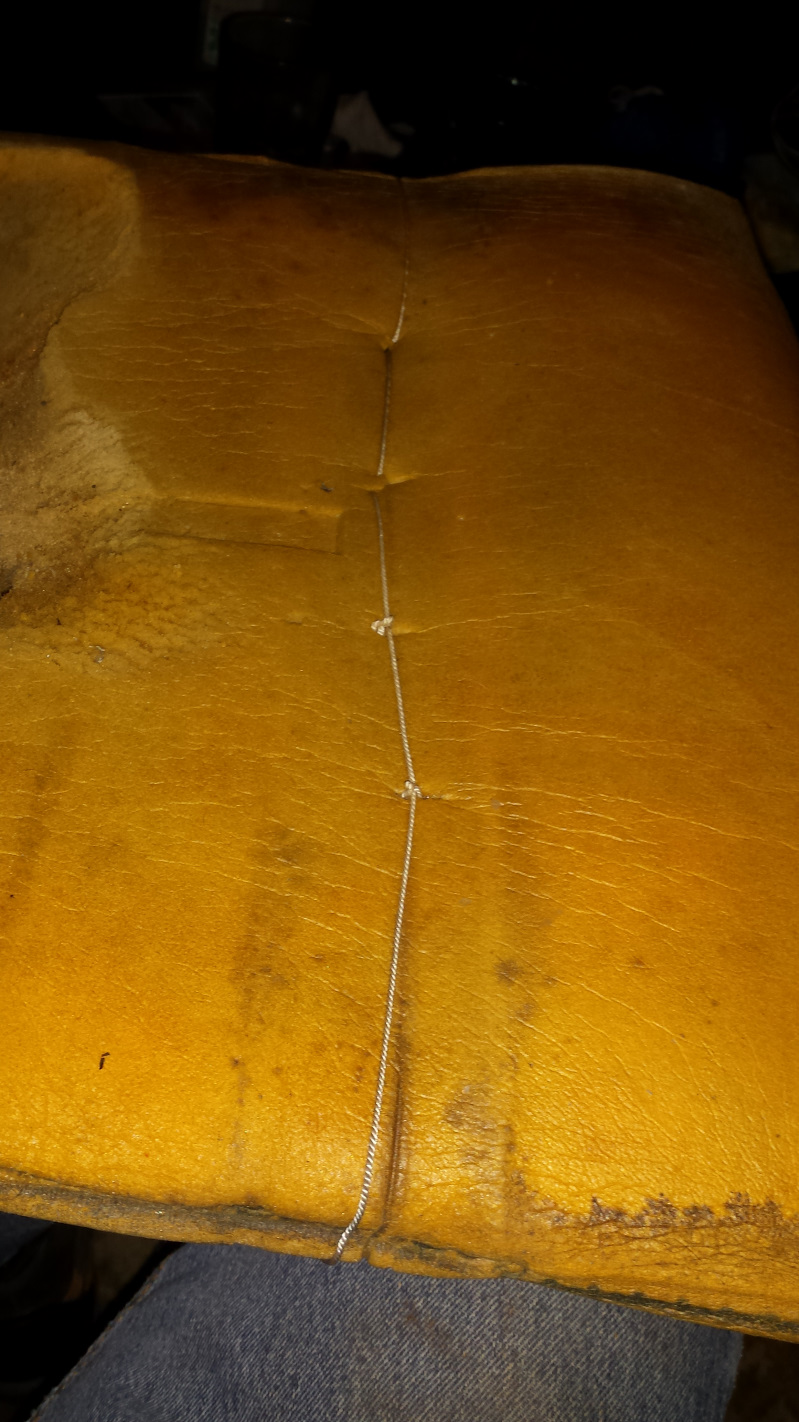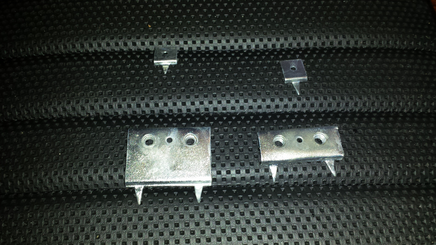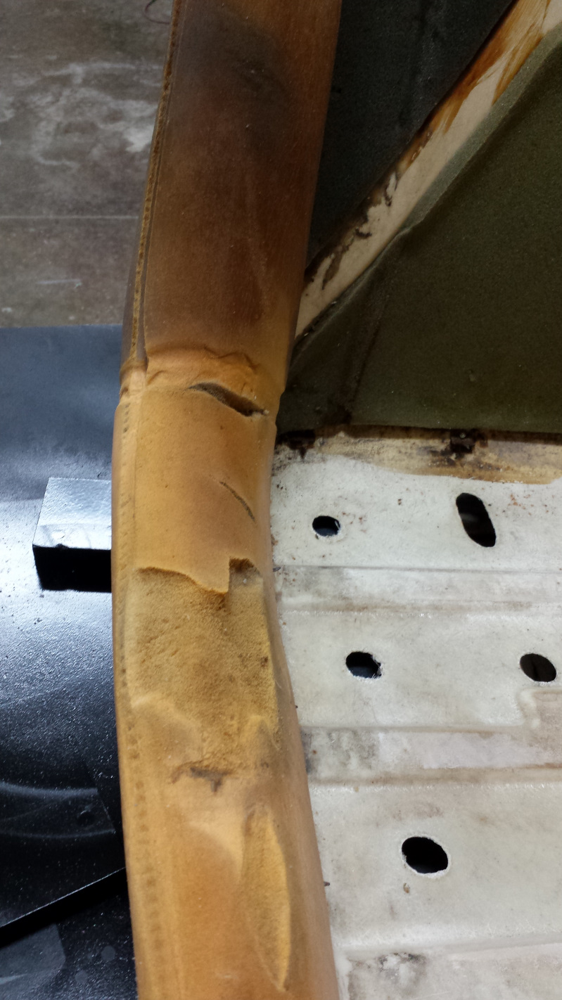 That darkest one is an evil SOB that had a bolt seriously corroded and seized into it. I tried fire, penetrating oil, vice grips, and an easy out to get the stub of that bolt out with no success. I finally gave up and started drilling it out to insert a helicoil and, as often happens, just as the drill started to exit the bolt, it spun loose. Problem solved. I'm hoping the replacement bolt arrives from Belmetric today. Those prongs look kind of nasty, let's see how a nice layer of zinc looks. (IMG:style_emoticons/default/smile.gif) The original rivets seemed pretty marginal and, being metric, and just a smidge larger than 1/8," and 1/8" rivets left them a little loose. I drilled them out to 3/16" which seemed a lot better. The passenger seat was in much better condition. Just a small nick that I just filled with silicone, but it was hiding a blemish. That seat always had an ugly bump on the bolster which I assumed was a piece of crud trapped under the vinyl. It turned out to be a hard knot in the foam. I sanded it out and tried to take a pic, but you can't see anything. It is the orangish area about 8" above the slicone. I didn't take any pics of putting the vinyl on. Pretty standard and covered in tutorials in the classics section. I did learn from my mistakes on the second seat and went back and restretched the vinyl on the first one after I figured out what I was doing. |