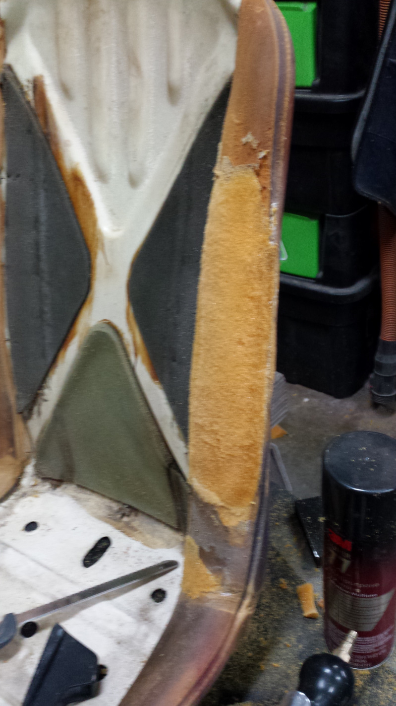 Nice segue way to the next installment @mepstein ! Here's how I tackled the bolsters. You can see from the before pics that my driver's seat has some minor blemishes in the foam. Yeah right. The flesh had been torn off and the bone was showing. Here's a few more shots of what needed repair: Cut to the bone. Typical shrink tears at both bolster bends. A significant tear on the other side. And foam shrinkage on the hand brake side. I think it may have come from the factory like this because that area always looked like ass as long as I've owned it. Worth noting here that there is less padding on hand brake side of the driver's seat to allow more clearance for the lever. That adds a little challenge in stretching and gluing the vinyl there but not too bad. Just note how it is glued when you take it apart and take reference pics. I had no clue how to approach the repair, but after filtering out the hacks on Youtube who should be banned from offering any how-to advise (boy there are some idiots out there), I settled on this guy who looks like he knows what he is doing. https://www.youtube.com/watch?v=32bMlq-9JUc I tracked down the cheapest electric carving knife I could find, and some 40 grit discs for my DA (couldn't find 36g locally) and went to work. That dude makes it look easy. It isn't. Helpful tip: don't buy the cheapest carving knife you can find. It isn't horrible though. It just takes some practice, but after doing the first seat, I also found this video with a low tech version of the same approach and found blending them together worked better. https://www.youtube.com/watch?v=VhB4cVm4Rik Now that I had an idea what I needed to do, I needed some foam. That's where my genius (that's code for dumb luck) in buying new seat foam came in. Now I had extra original seat foam which was an exact density match to the bolster foam. After cutting out the damaged areas to get flat surfaces to patch on to, I just chopped out pieces from the old seat bottom, and glued them on with spray adhesive. Doesn't that look beautiful? Then a little rough sculpting with the carving knife. And here we are after sanding with the DA and some fine tuning with a cheese grater style wood rasp. A word about using the sander. This stuff sands like... well... foam rubber. It grabs, it pulls, it bucks. As I said before, the dude in the video makes it looks easy. I found it best to turn the air pressure way down to spin the sander fairly slow. Here's a closer shot of one of the repairs. The last thing for the foam repair was to add a thin later of polyester batting just to keep those glue lines from telegraphing through the vinyl. It isn't enough to change the thickness of the bolster. This is actually the passenger seat, but that doesn't matter. |