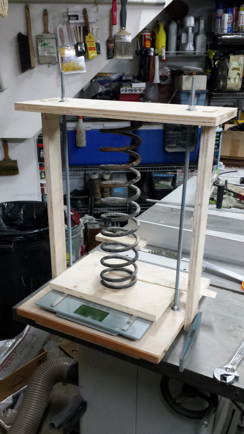 Spring Time I rigged up a Poor Man's spring tester today using some scrap plywood and a bathroom scale. I was hoping I would be able to put a 1 inch pre-load on the spring, tare the scale to zero, then crank the spring down another inch to read only the weight added in the second increment. I wasn't surprised it wouldn't tare with that much weight but my backup plan was to tare the scale with the spring on and no compression, then take incremental readings as I compressed the spring an inch at a time. Like most "smart devices," this thing is dumb as shit. Simple analog would have been much better. Anyway, I managed to compress the spring manually an inch to get a reading, then repeat at 2 inches. I tried for 3 inches but was afraid I would break the rig. Anyway, I was able to get consistent readings of 42 lbs. for the first inch which I expected would be light, then 92 lbs. at 2 inches. If I'm thinking right, that means my springs are only rating at 50 lbs/inch. Not unexpected but crap (IMG:style_emoticons/default/sad.gif) I guess I'll jump on the GB for stock springs that 914Rubber has promised. To end this on a more satisfying note, I put the instrument cluster in the dash today. Waiting for the wife to notice it missing from the family room counter. They look better in the dash. I'm a little bummed though because I have a set of new gauge gaskets from 914Rubber but they fit way loose in frame and the gauges would fall out if I used them. My original gaskets are looking a little ratty but at least they hold the gauges in place. And here is a shot of the pedal cluster back home after 35 years. (IMG:style_emoticons/default/cheer.gif) I have heard that stock 914 springs ranged from 60-90lbs. I've never purchased a car with old shocks and springs that were any good but I still keep an old set or 2 because they are good for making a chassis a roller. |
