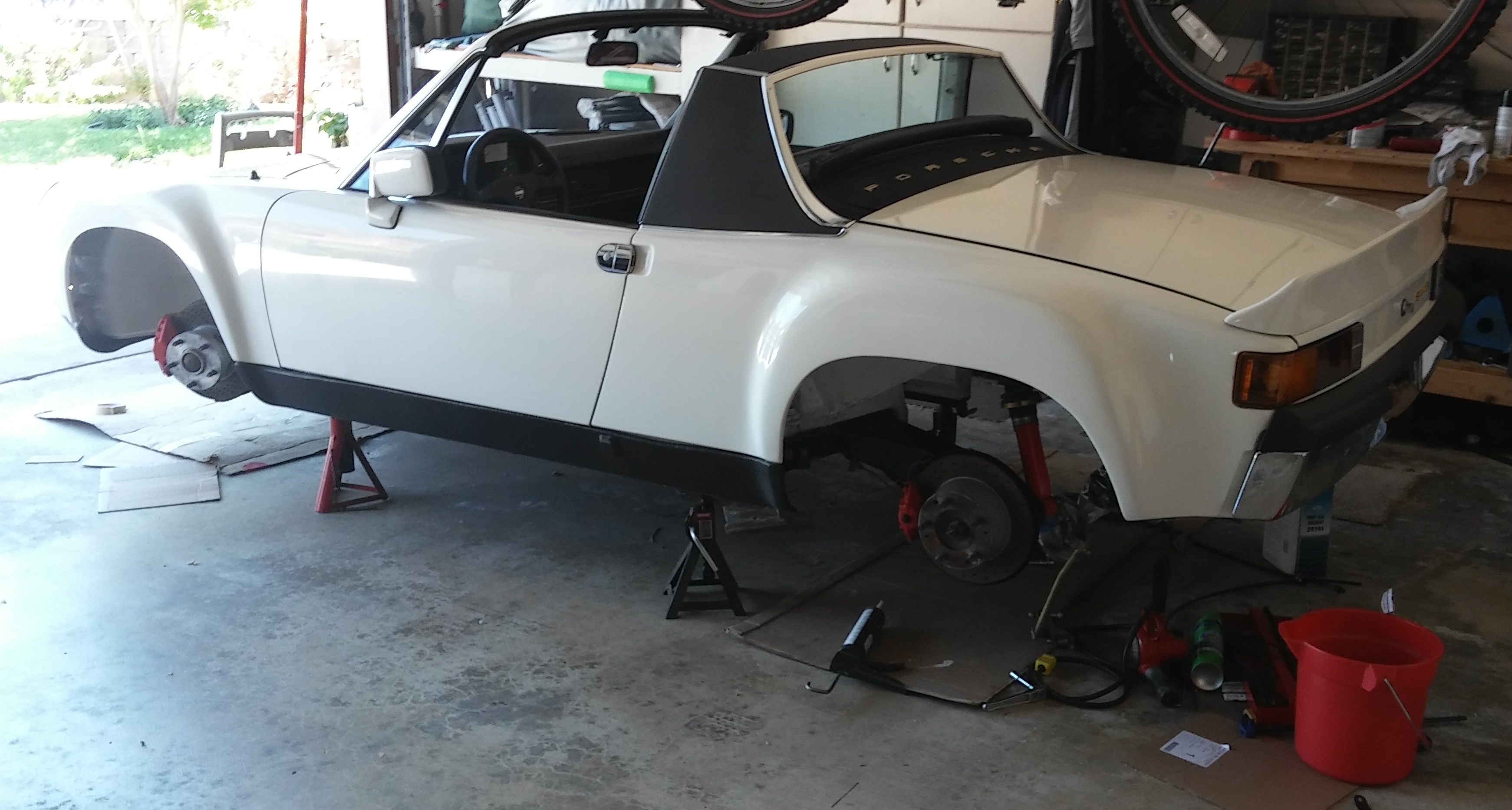 Here is what I have: Front - Sway bar attachment points were welded to the arms then the arms, mount, steering rack and cross tube were rebuilt with new poly graphite bushings, bearing, seals. 911 SC struts, Koni adjustable shocks, turbo tie rods, new ball joints. 911 SC Brakes Padgid RS-4 pads, with stainless steel braided brake lines. Front sway bars are 22mm. Rear - Arms were strengthened with Automotion kit. New poly-graphite bushings and bearings. Rear brakes are 914 with braided lines, 911 cross-drilled rotors with machined and hardened 914-6 half shaft adapters. Weltmeister 22mm rear sway bar. Engine - Not currently installed as mentioned. 1979 3.0 with 39mm port heads, Carrera tensioners, Turbo valve covers. Jerry Woods distributor rebuild/ re-curve, MSD 6-AL Ignition and coil. Dual Weber 40 IDA 3C carbs. 914-6 engine oil cooler, Patrick Motorsports 914-6 oil tank, Mazda RX-7 front oil cooler, Mocal external thermostat. Rich Johnson engine conversion mount. Perry Kiehl 914-6 conversion wiring harness, MSDS 1 5/8 inch headers. Had a thread going but shelved that when I had to stop working on the car "Finishing A 914-6 GT Conversion Project" but have not updated it in a while. Hoping to get back into the car in May and get it running. In the mean time I understand the stock torsion bar may not be good for the set up I have. Everyone loves a picture so her is one just before I stopped. Thanks |