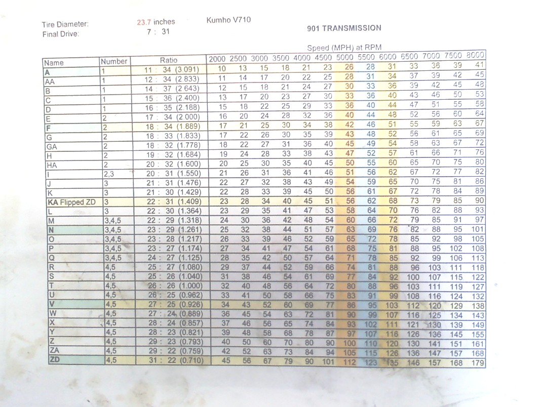 The 901 Achilles heal is 1st gear, 2nd-5th it can handle all the 3.0/3.2 NA power you can throw at it, but if you had a usable 1st gear you would smoke the box PDQ. Also you can't change the 2nd gear ratio, it's fixed on the shaft, so even if you make a taller 1st then 2nd isn't tall enough. My tranny is set up A, F, O, X, HA (flipped). HA is one tooth short of H. I choose HA because I had it and I'm cheap, also it's almost but not quite as tall as H, so for me a bit more in line with typical highway speeds here. I'm using a hot street 3.0 that should have at least 250.hp |