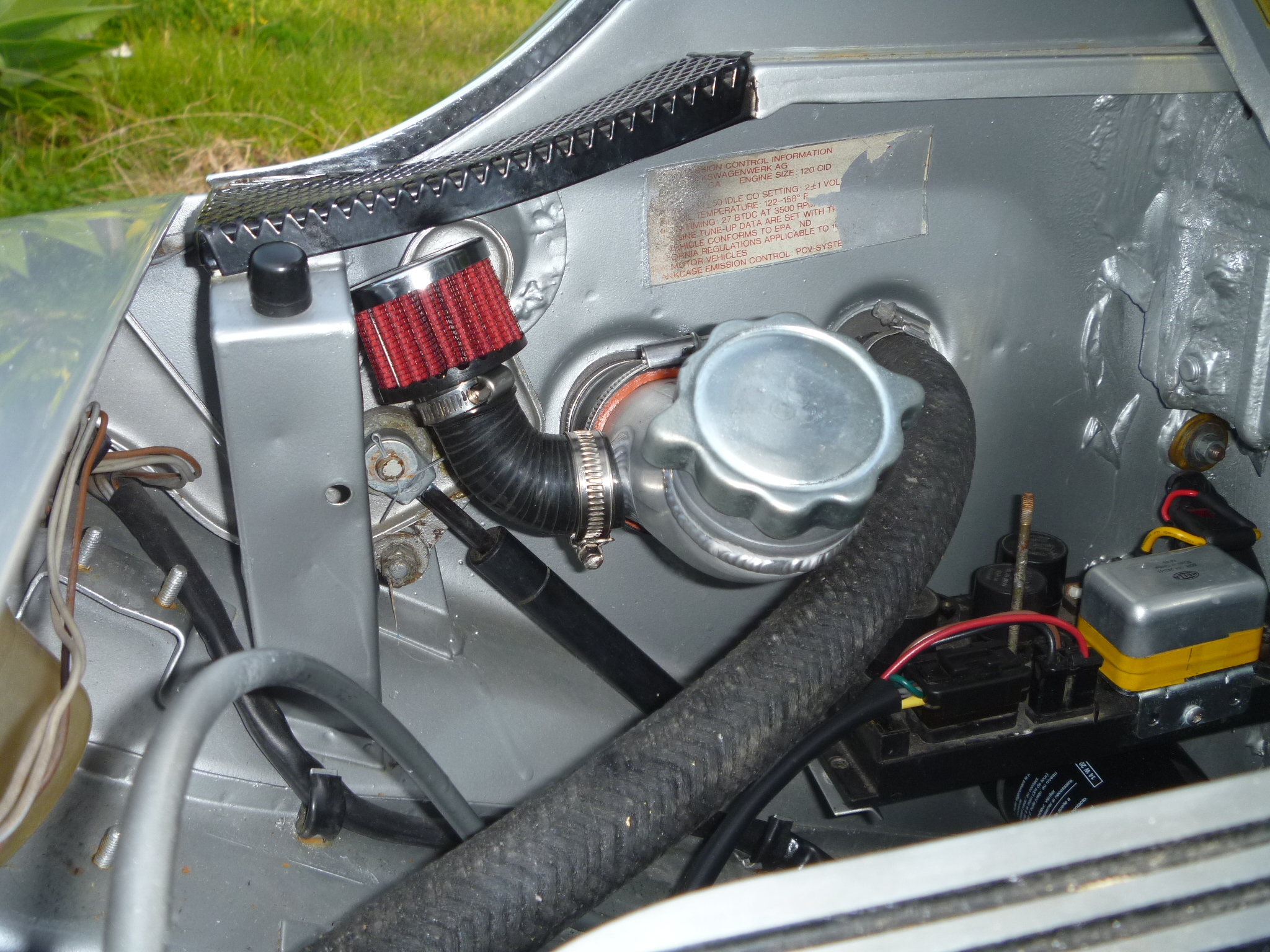 ...I have not found a good way to mount mine yet !don't wanna drill holes ,I see your design is bolted to the rear fire wall , that looks good... I just cant do it that way...was gonna look at mounting under the car ?? but where.... BTW nice work Mr (IMG:style_emoticons/default/smile.gif) Yeh.. I hate drilling holes as well, just a a necessary evil. I used riv-nuts, but self tapping screws would also work in a pinch. If one was totally dead set against drilling holes there's a couple of factory holes close by on the engine/trunk firewall and if I made a bracket you likely could secure that with T bolts. I just don't know if all years 914's had these holes and in the same location. |