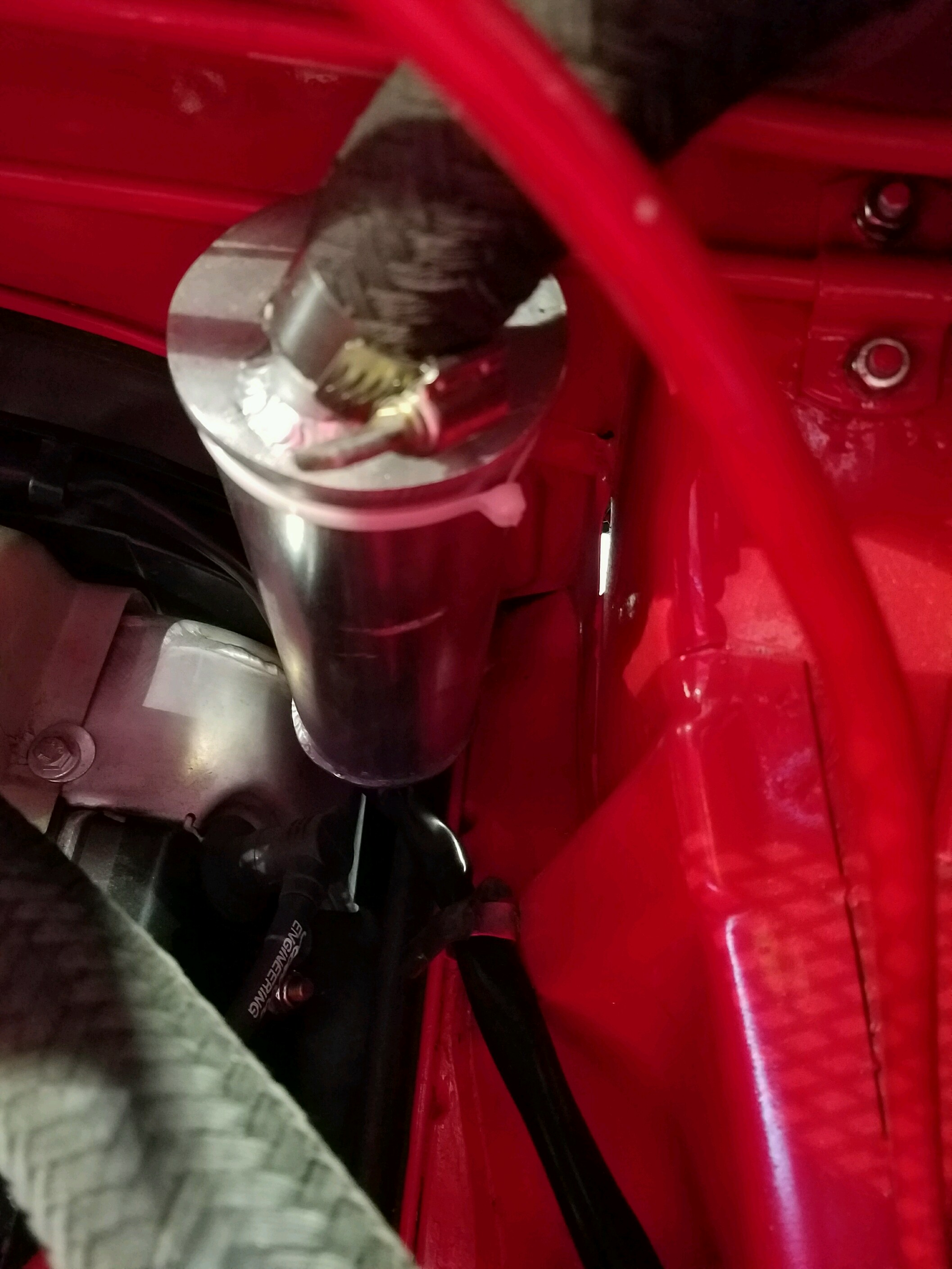You should also take into consideration the rubber stopper thingy that keeps the engine lid from hitting the trunk lid when its open ...sorta looks like your tank is right in line with that...no idea of the hose size (IMG:style_emoticons/default/smile.gif) The top of the tank is a couple inches below the decklid. Just the picture depth of field. |