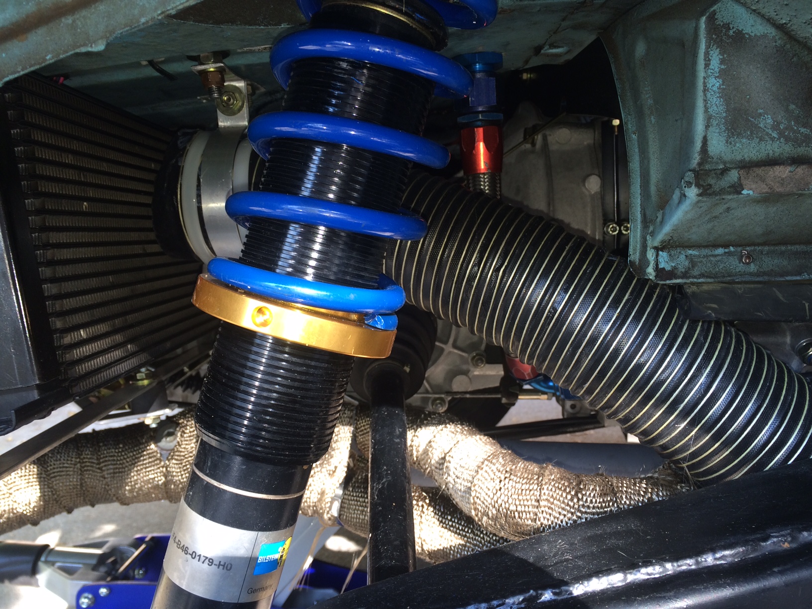 http://www.914world.com/bbs2/index.php?sho...%20hot&st=0 I was hopeful that re-installing the ducts from the fan housing to the heat exchangers would solve my high oil temps. Well...it solved one of the causes of my high oil temps. Now that I have driven the car on 2 multi-day tours through California I can unfortunately report that the issue is not fully corrected. With the benefit of hindsight I now know that as road speeds increase the airflow through the engine compartment is insufficient to keep the oil temp in check. Running through the gears on tighter 2 and 3rd gear roads are no problem. It's the more open 4th and 5th gear runs (high road speeds) that are causing the problem now. Now it looks like we are dealing with 2 options. The first is to install a faster-turning 1.9 to 1 ratio fan setup. This will increase airflow through the engine compartment but will make more noise and take a few HP to run. The second option is to add an external oil cooler. The front-mounted cooler seems to be the tried-and-true solution but is expensive and invasive. Some folks have rigged up an external cooler with fan under the rear of the car. I am soliciting thoughts, preferably from those with experience themselves, on these or any other options that may exist. I would appreciate any pictures of the various external oil cooler installations as well. Many thanks, Lee |