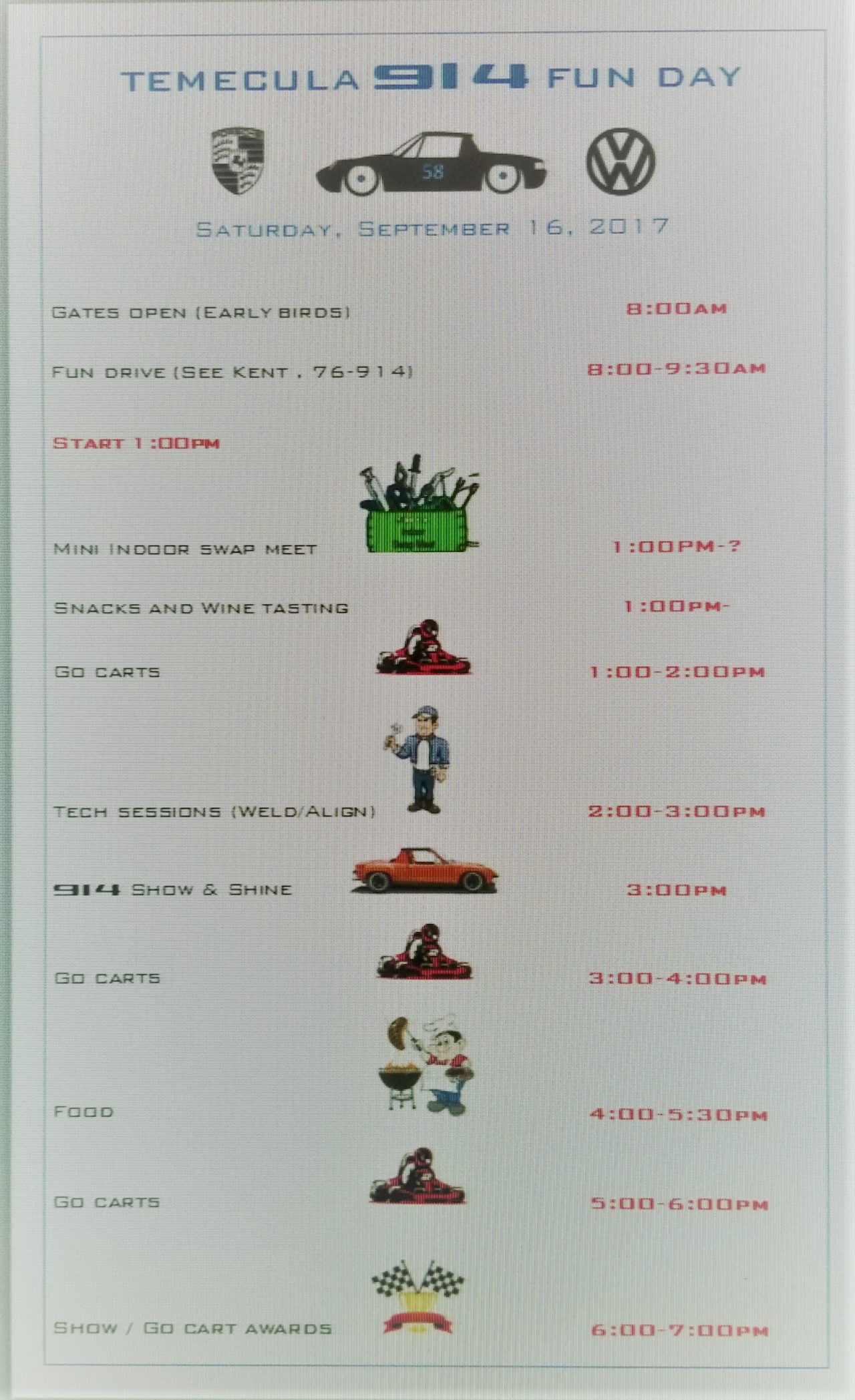 Here's the latest event schedule...it's a loose idea of events. Come hungry, leave full and happy. Please be patient with our local traffic congestion. Kent...you may want to chime in on drive details (if needed)...I'm on I have two weld stations set up w/practice kits. (Don't forget helmets) Alignment station is cleared and ready to go. About 4 to 5 trailered cars are expected...please text me as you arrive so we can guide you in. We will have an onsite AAA-914 road crew with car trailer available should we have to rescue anyone within reason. Oscar Hello Oscar...Greg Gutesha here....Second Wind....I paid weeks ago but seem to have disappeared from your list. I live in Topanga, Calif. Please hook me up! Thank you, gg |