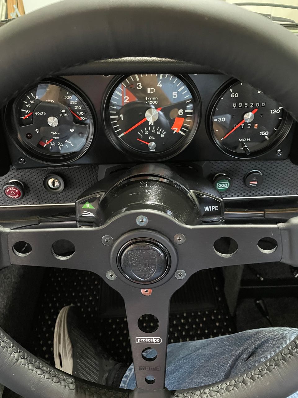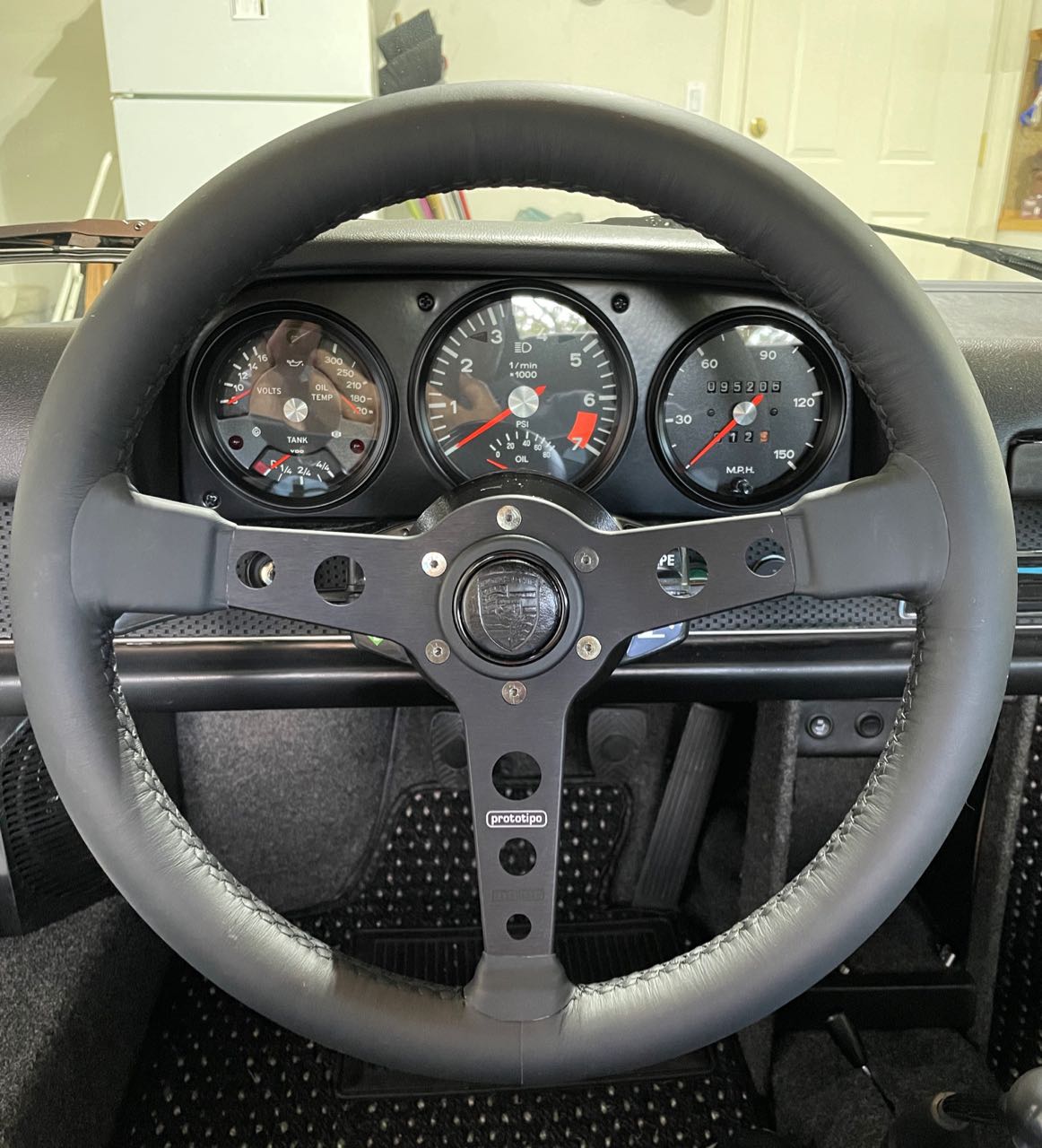 OK, after thinking about the Momo hub (too long) I decided I would rather not modify the hub. So I sourced an early, solid, short hub (took a bit) that is in excellent condition. Reportedly it is a total of 2 3/8" deep. That would be exactly what I was looking for. (For you guys with long legs, (not me) having the current Momo hub is probably a welcome change.) Once it arrives, hopefully by the end of the week, I will do a side by side comparison with photos for all to see. Once that is sorted, I will pull the wheel back off and send it to Dallas Customs for a double wrap in the high-quality black leather with black stitching.