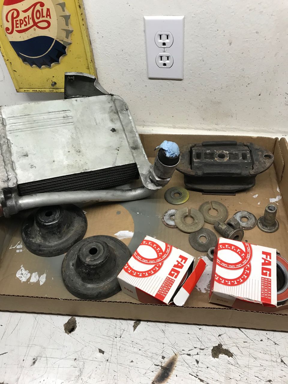 Terrific. Scotty got my oil cooler shipped out pretty darn quickly, (thank you) and it came with a few other parts we have been missing too. Now we will send the cooler out to be sonic cleaned and pressure tested so it is ready for installation. Oh, the two trailing arm bearings came from PMB- thanks Eric.