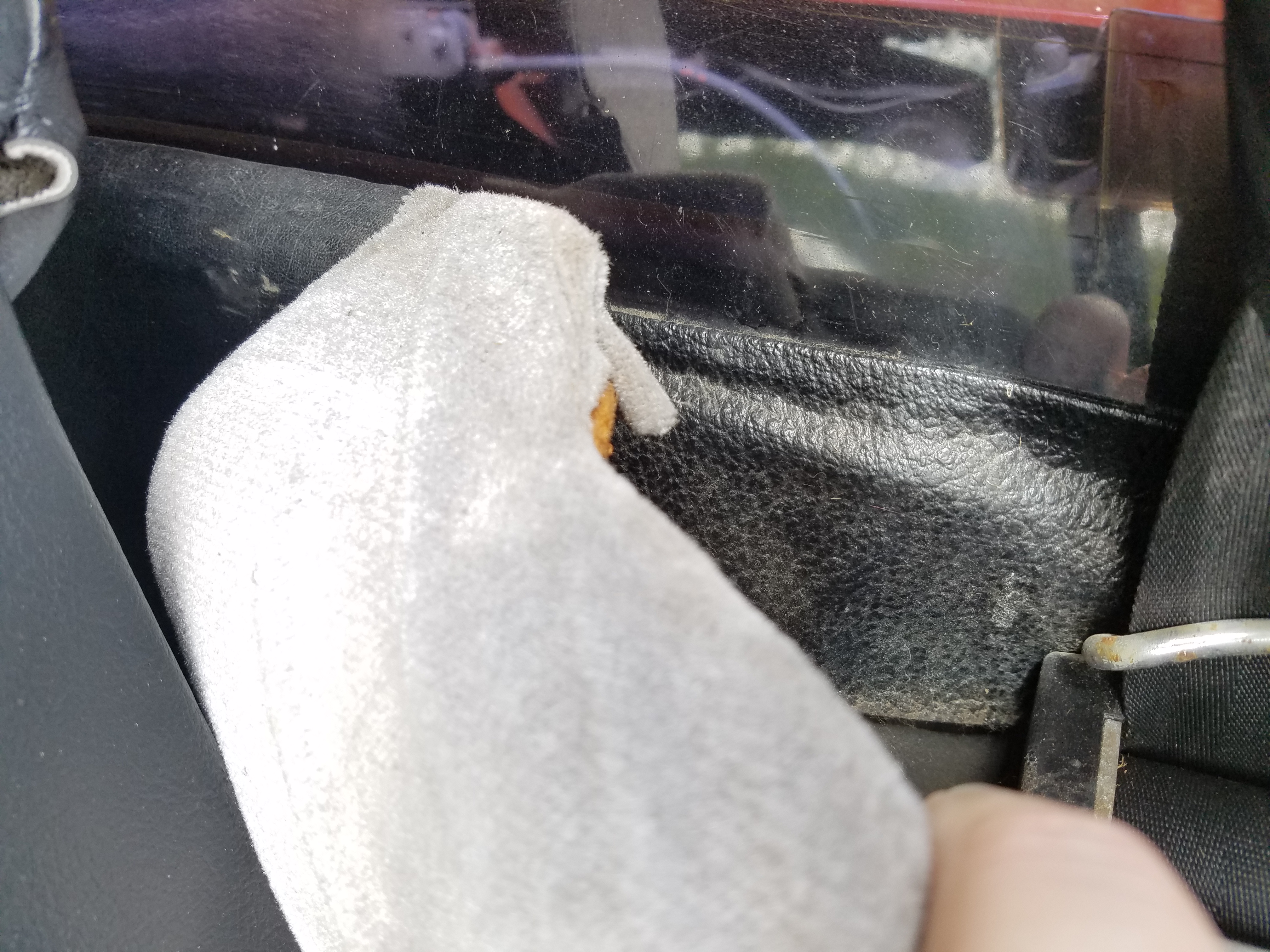 Test fit those short pieces & they should wrap perfectly on the front of seat cross member, just between the raised areas on the side, then mark & mask the floor so you can spray that surface neatly without too much overspray clean-up afterwards (assuming you're using one of the 2 surface spray adhesives like 3M 77, 90, etc.). Do the same test fit, mark & mask for the rest too, but only spray a couple of small or 1 large piece at a time (spraying both floor area & leather backside) to give you enough out-time/dry time to get it positioned & on comfortably. Use a couple-a-3-4 long wooden dowels from Home Despot/Lowes to lay under the leatherette to prevent contact with the sprayed floor surface while you position & smooth-out & roll it on, moving them out of the way while working from one end to the other. If you've ever done Formica/etc. with 2-surfact application contact cement - it's a similar process. A small rubber roller helps with the final step of pushing the vinyl into the floor/cement, but a sturdy new/unused small paint roller can work, but requires more going back-n-forth since you can't push it as hard into the vinyl/floor. Good Luck! (IMG:style_emoticons/default/beerchug.gif) Tom /////// |