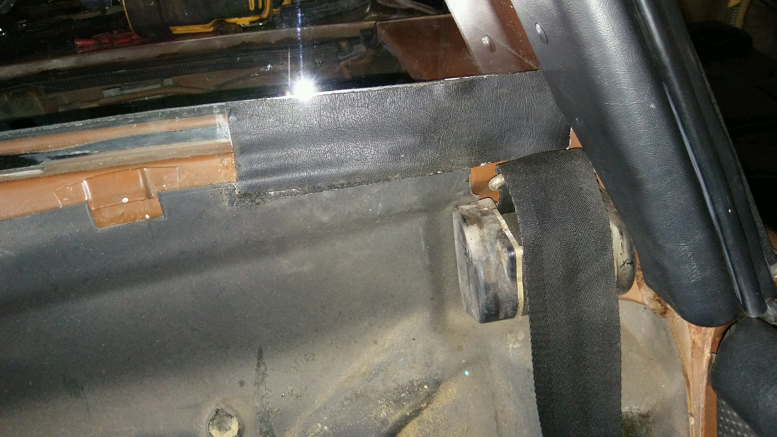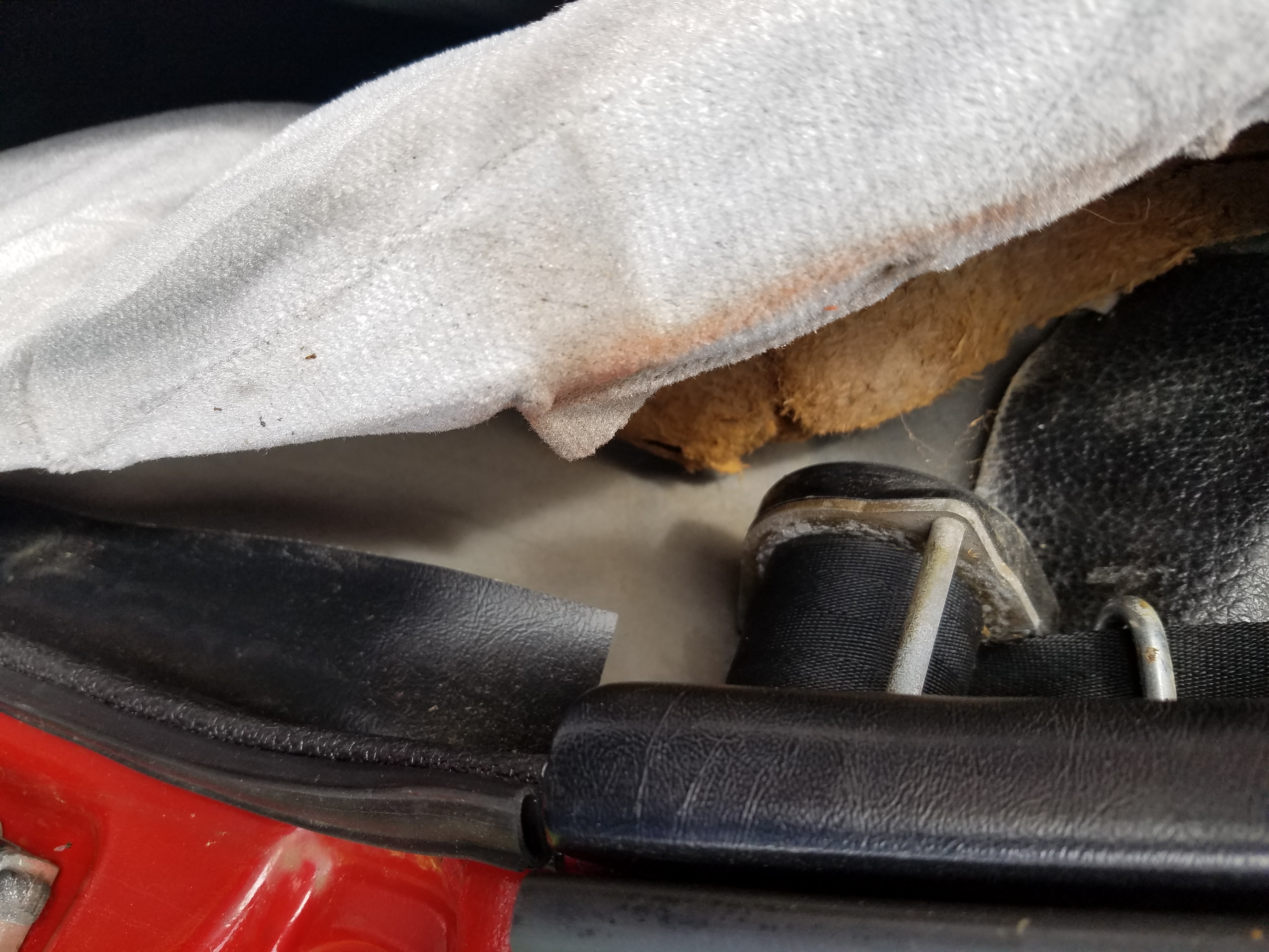 Don't they glue to the top edge of the back wall at the outside shoulders of driver and passenger ? That would be the longer strips above the red circled ones. Mine actually wrap around the seam and are secured by glue and the door seal. Mark is right about the ones above the circled pieces, they mount vertically and wrap around the door pinch weld. The ones that cover the crossmember have notches for the seat recliner tooth piece. They are the upper left pieces Attached is a picture of my old rotten 1970 interior showing the last visible vestige of the rectangular piece in question. Dimensions may help. Attached image(s)
