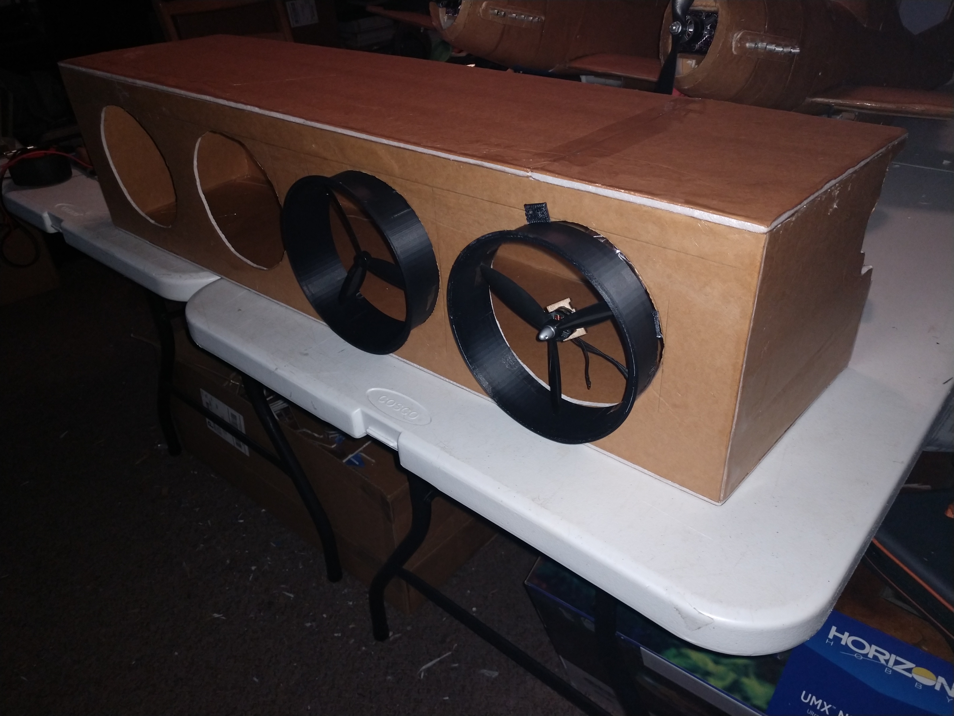 Print in progress. This is a prototype and needs some corrections. It will take 4 fans and they push 800 Cubic feet per minute each. But that's probably not enough thrust to make the car roll. |