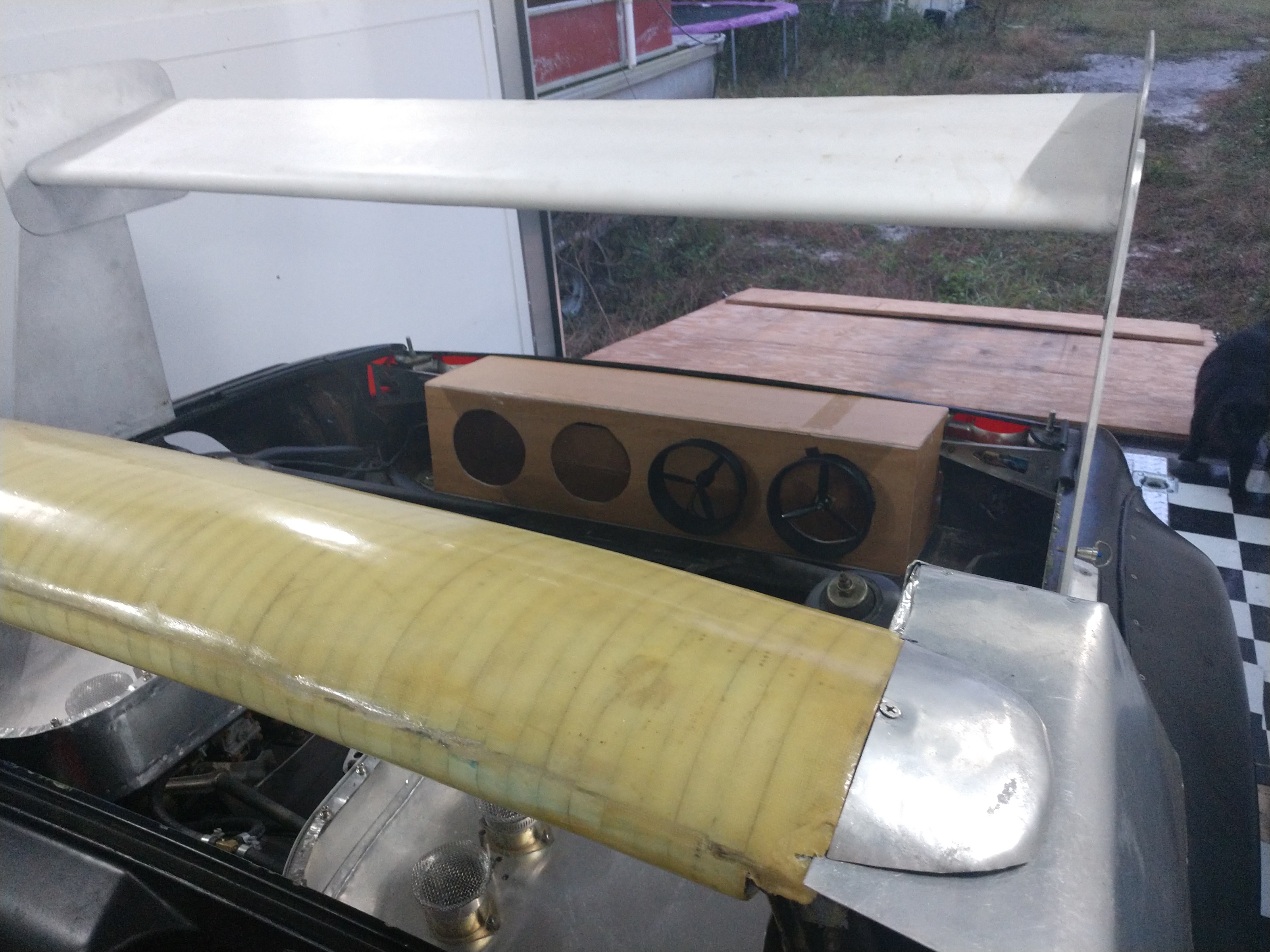 So my immediate thought was Digital Pudding. I had no idea what I would do with an Arduino board and now I get to build one. Going digital in the Plenum with 4 sensors. Atmospheric pressure, Temperature, Humidity and Wind Speed. The parts are on order from E-bay and should be here in a couple of days. This will all be displayed in a screen on the dash. When I originally thought of the Cold Air Intake I asked my neighbor Josh about getting some information about what is going on in the Plenum and he replied "Yes that we could do it digitaly." If proves that it is all a failure you will see about it here first. I'm not looking for turbo like improvement I just want to give the carbs air that is cooler than the air in the engine bay. Come on, if it's 75° outside and 125° in the engine bay it will give a huge psychological advantage over what the cars weight and the wings are already doing. Gosh, I'm thinking about paint. |