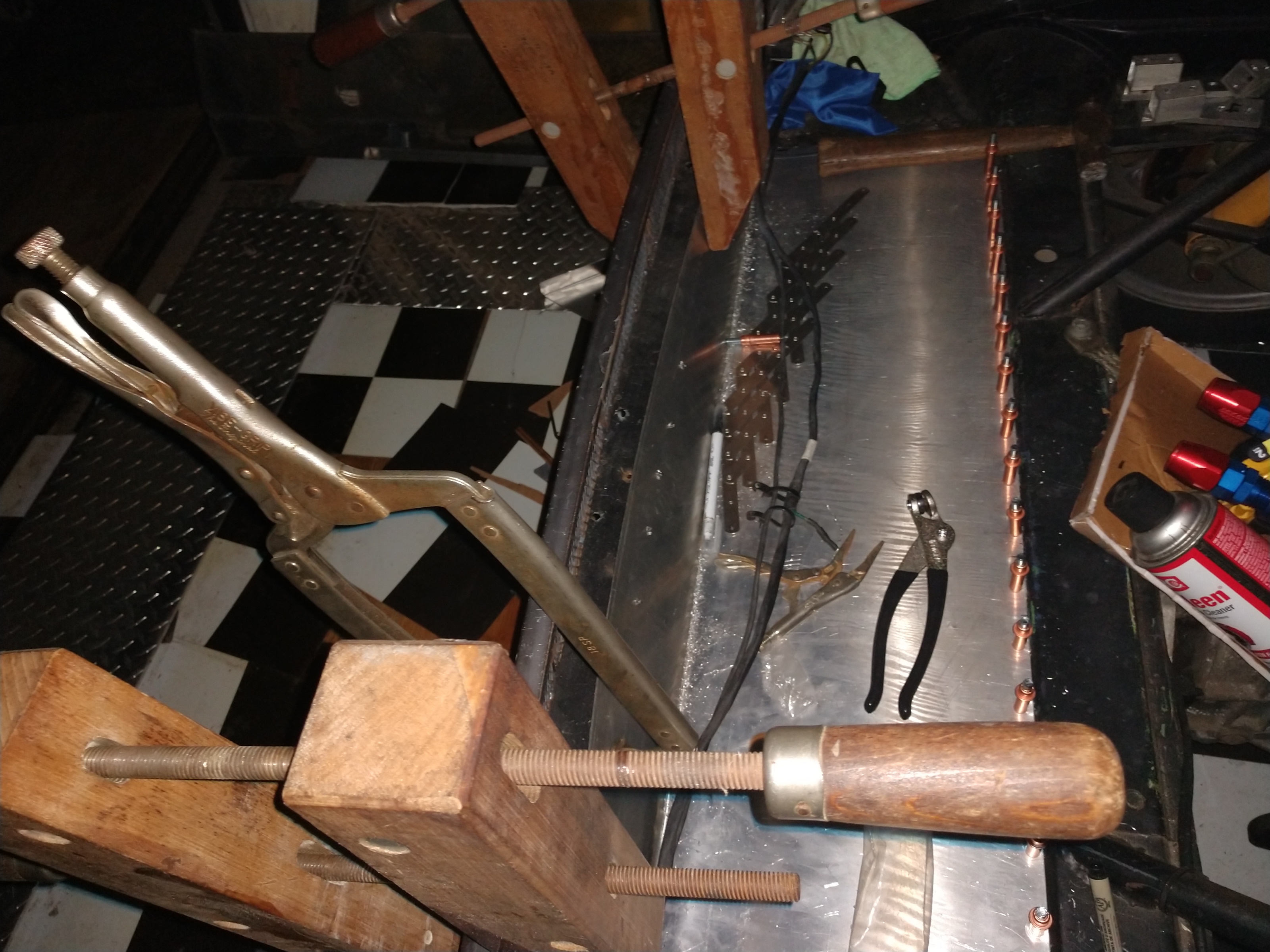You are barely able to see a line of 5 holes in between the clamps. The surface I am clamping to is a rolled lip. I'm drilling from the outside through the center of the lip. I may have to roll the edge of panel before I am done. |