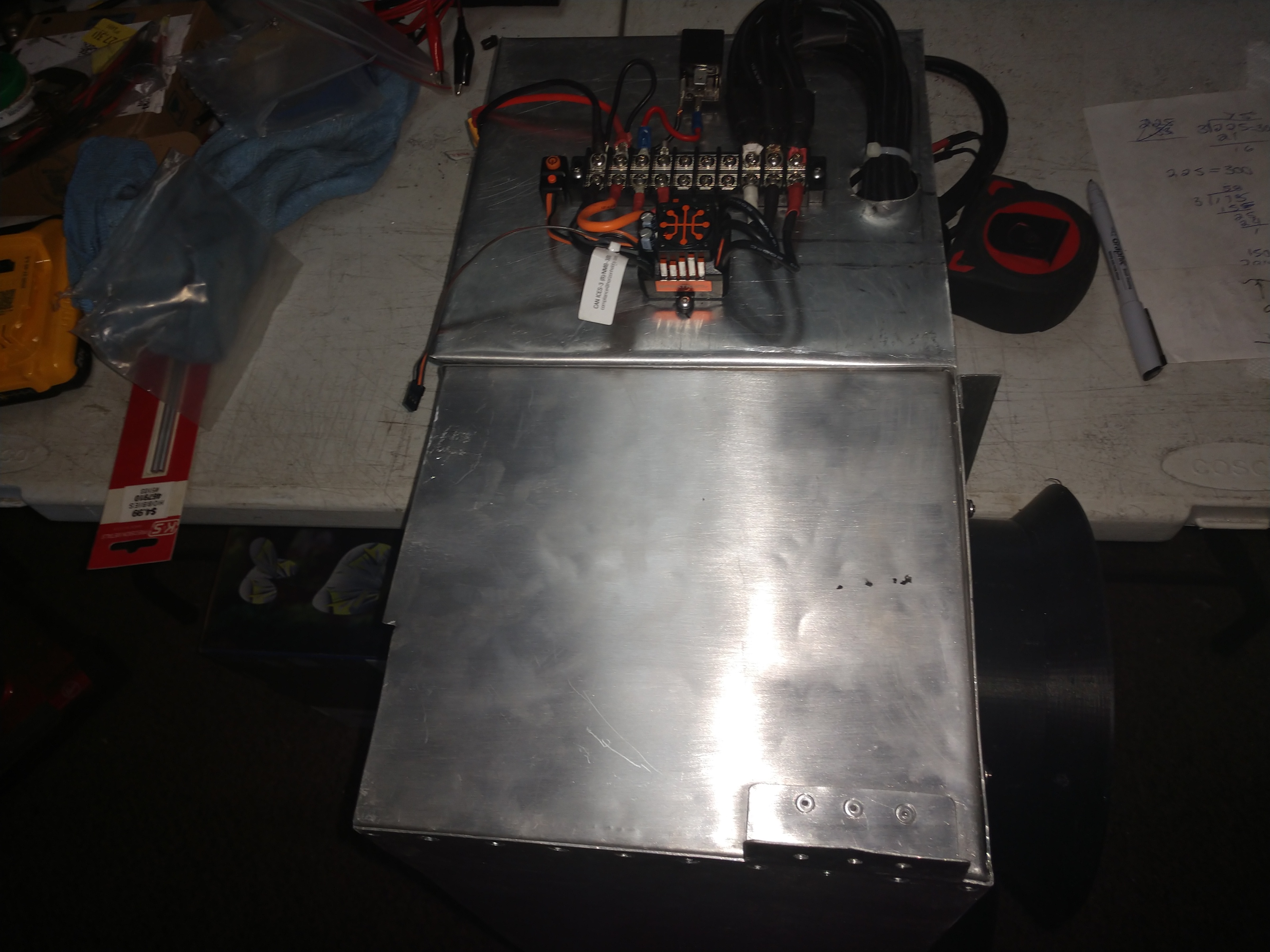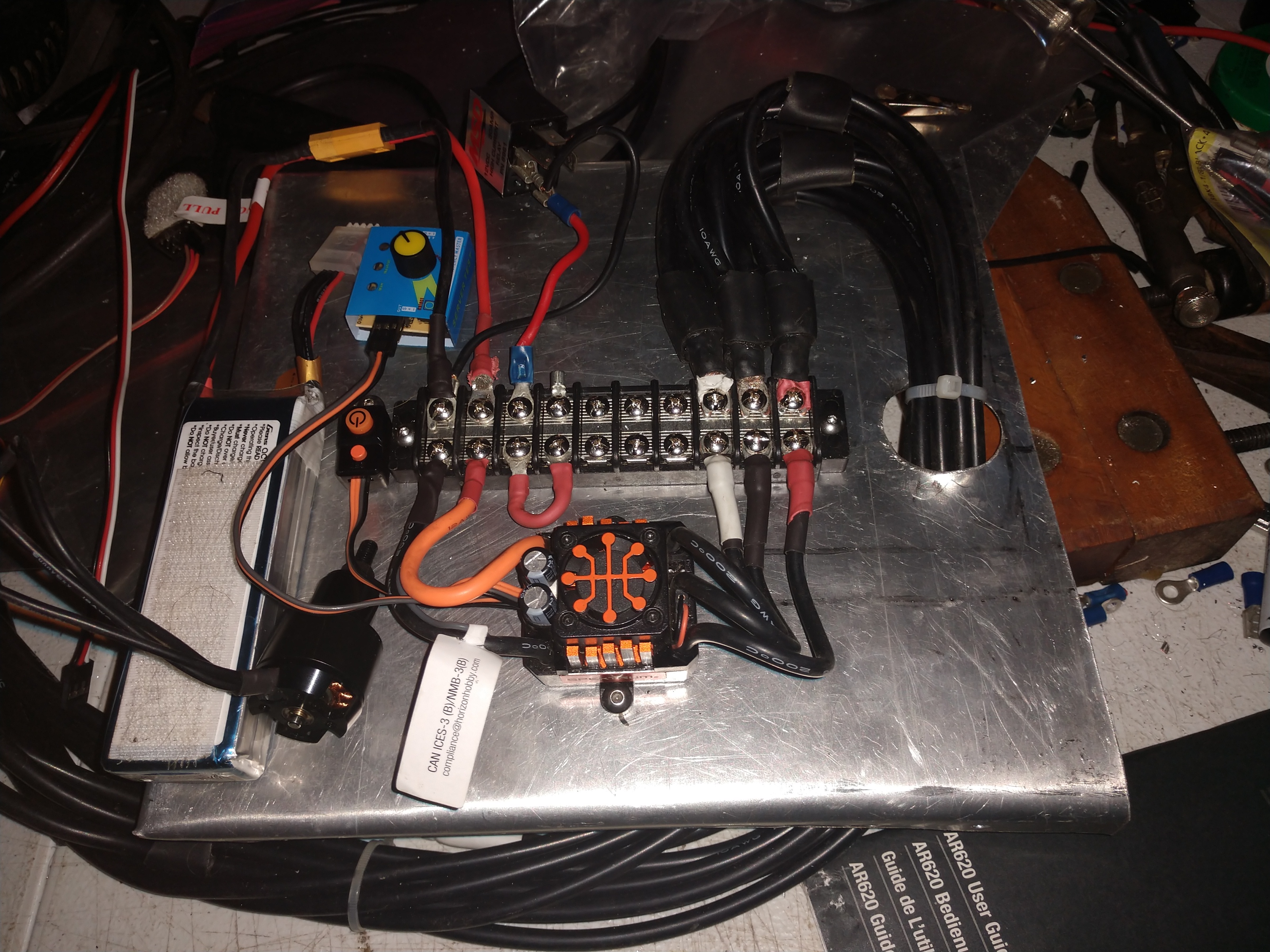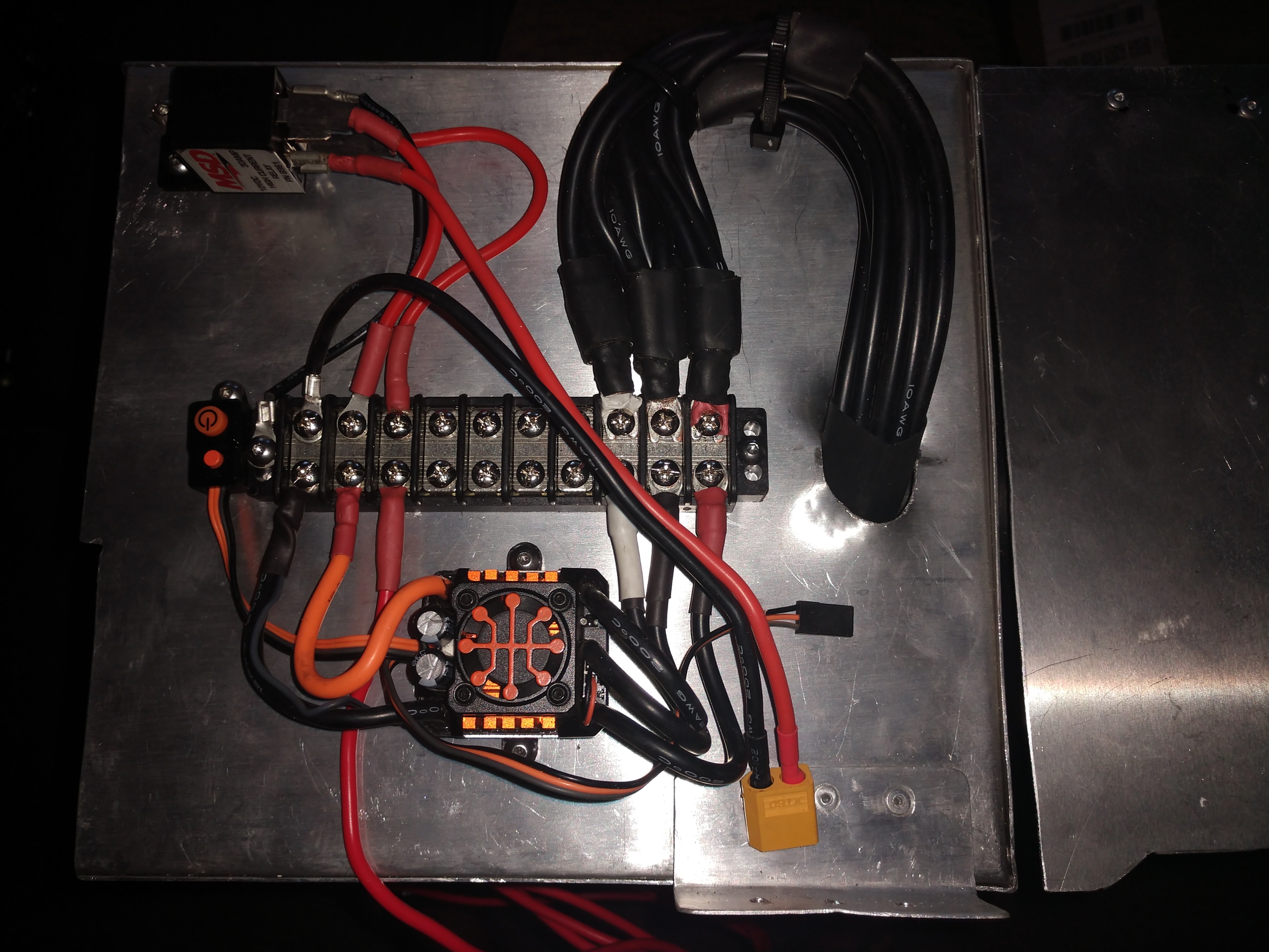 Back from Daytona and all the wires have their heat shrinking done. In the picture I have the wires placed next to the connectors from the motors. Looking for the placement of the bus bar and the ESC. All those wires have to exit the end of the box somehow and the ESC has a switch on it that needs to turned on and off. And I thought this would be simple shit.