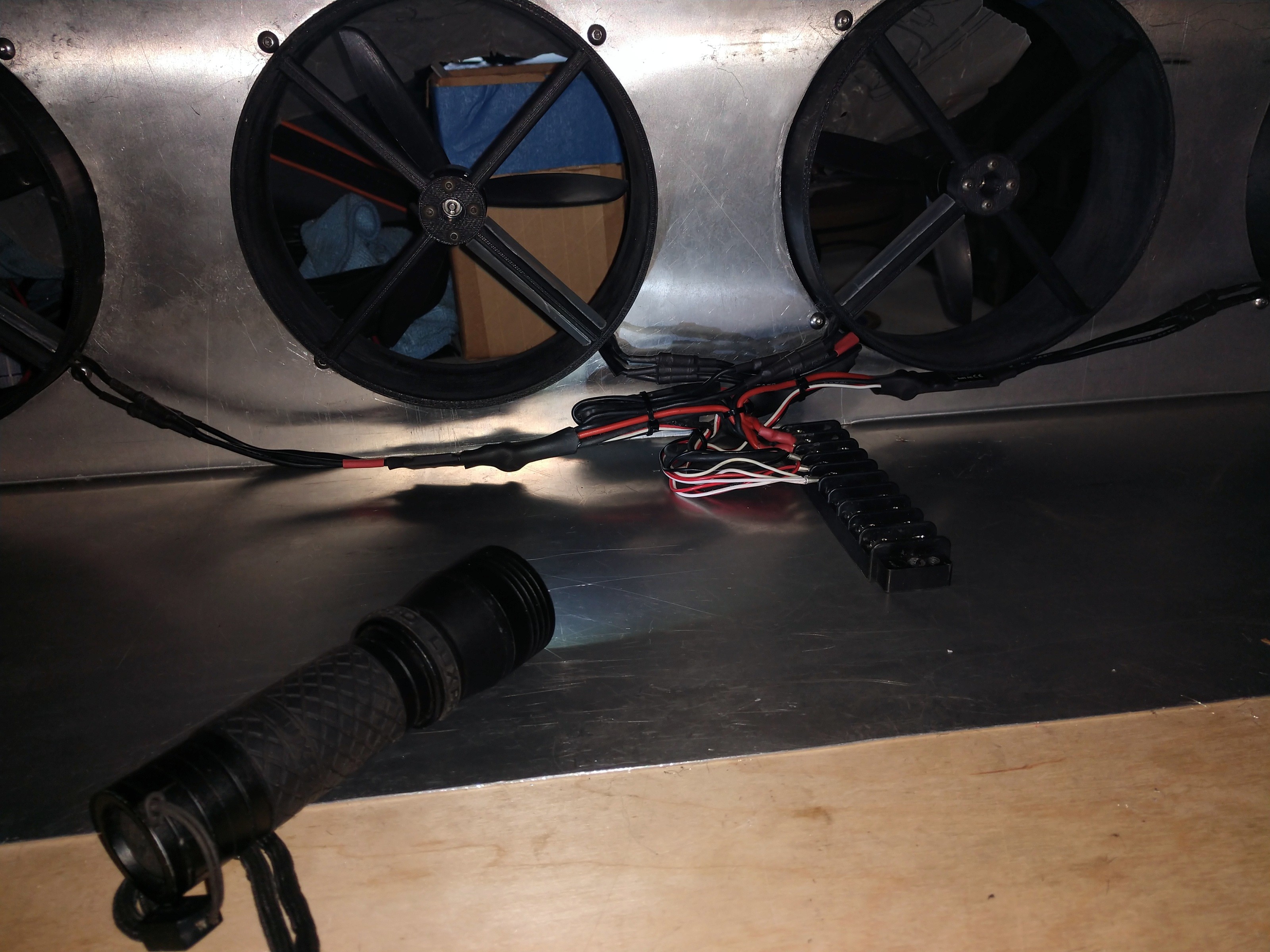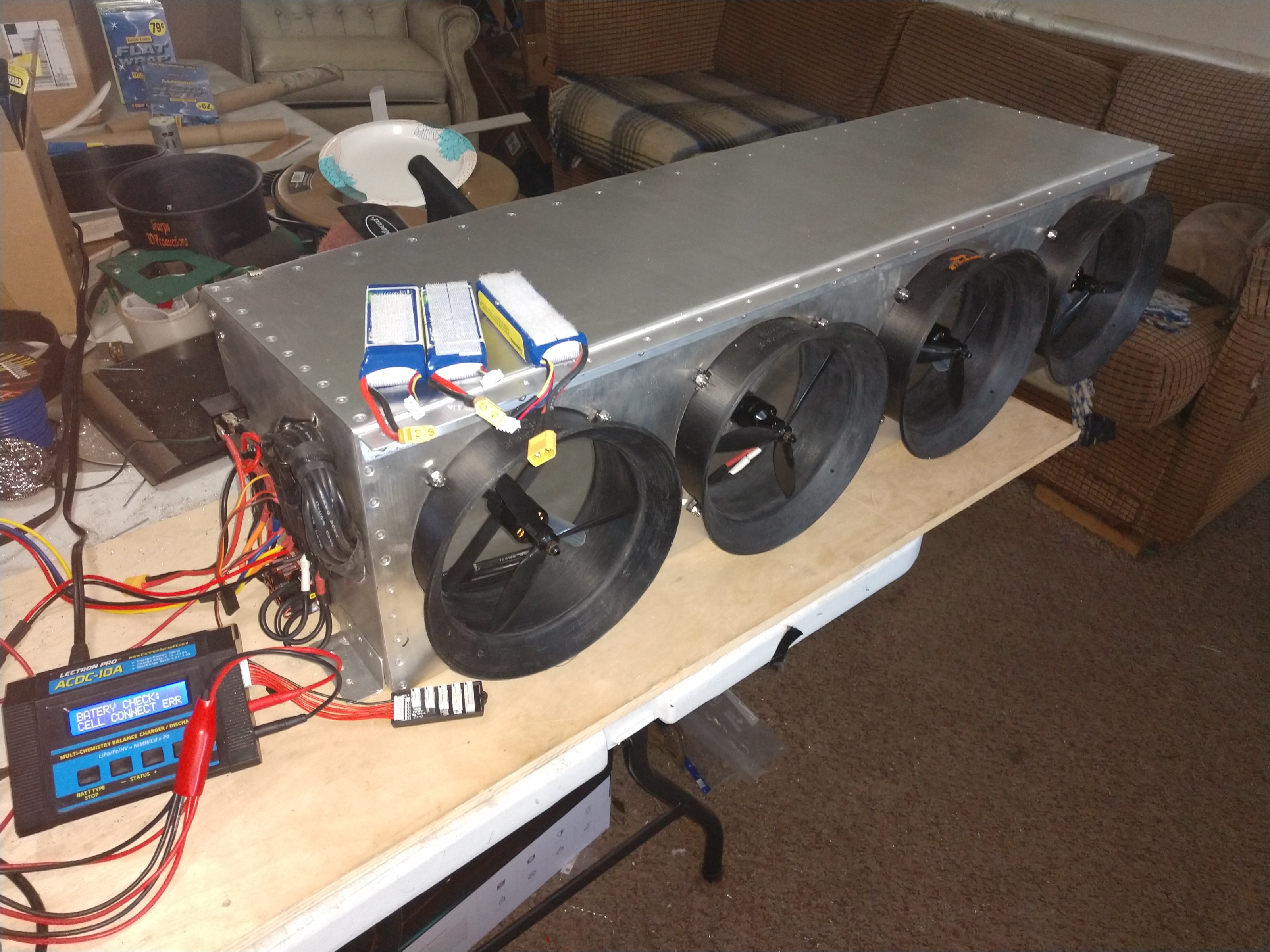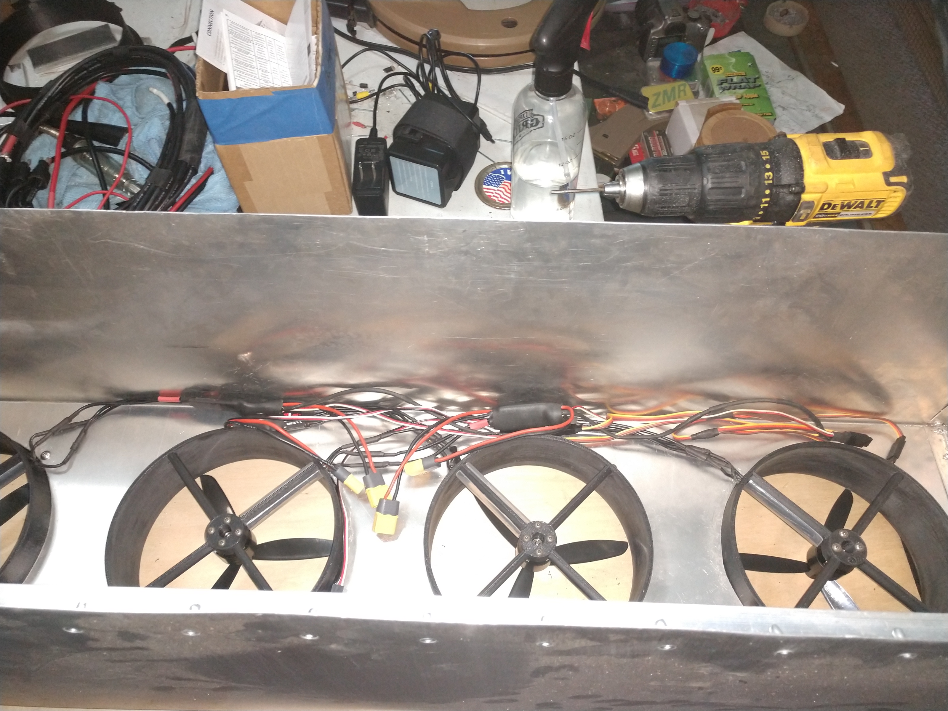 Well I guess this is latter. I've taken all the wires and electronics off of the fan box and I am moving fan housings to inside the box. When I was organizing the electronics originally I was trying to use a single RSC but the complicated electronics didn't want to run the 4 motors. So now I'm going to try to make 4 ESCs work together. One of the advantages to having one ESC was that I could put in on the side of the box. Now everything has to go inside the box which means pulling the box for maintenance.