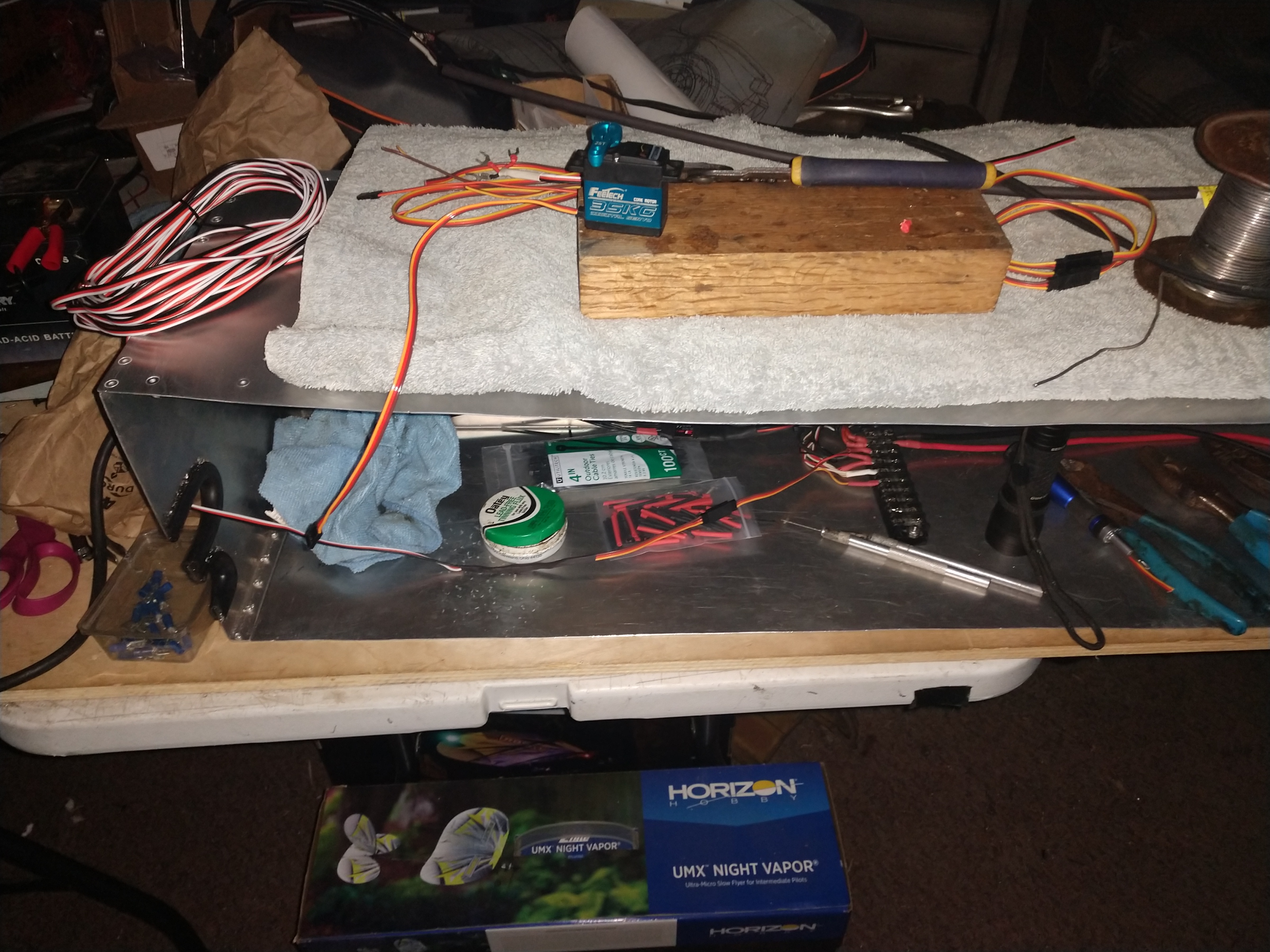 Hiding from the heat today. Working on wires for the motor controls. Trying to get the rear wing apart so I can install the servo and cut in the Gurney flap. If things don't work out, I'll make a new wing built for the Gurney flap and the servo.