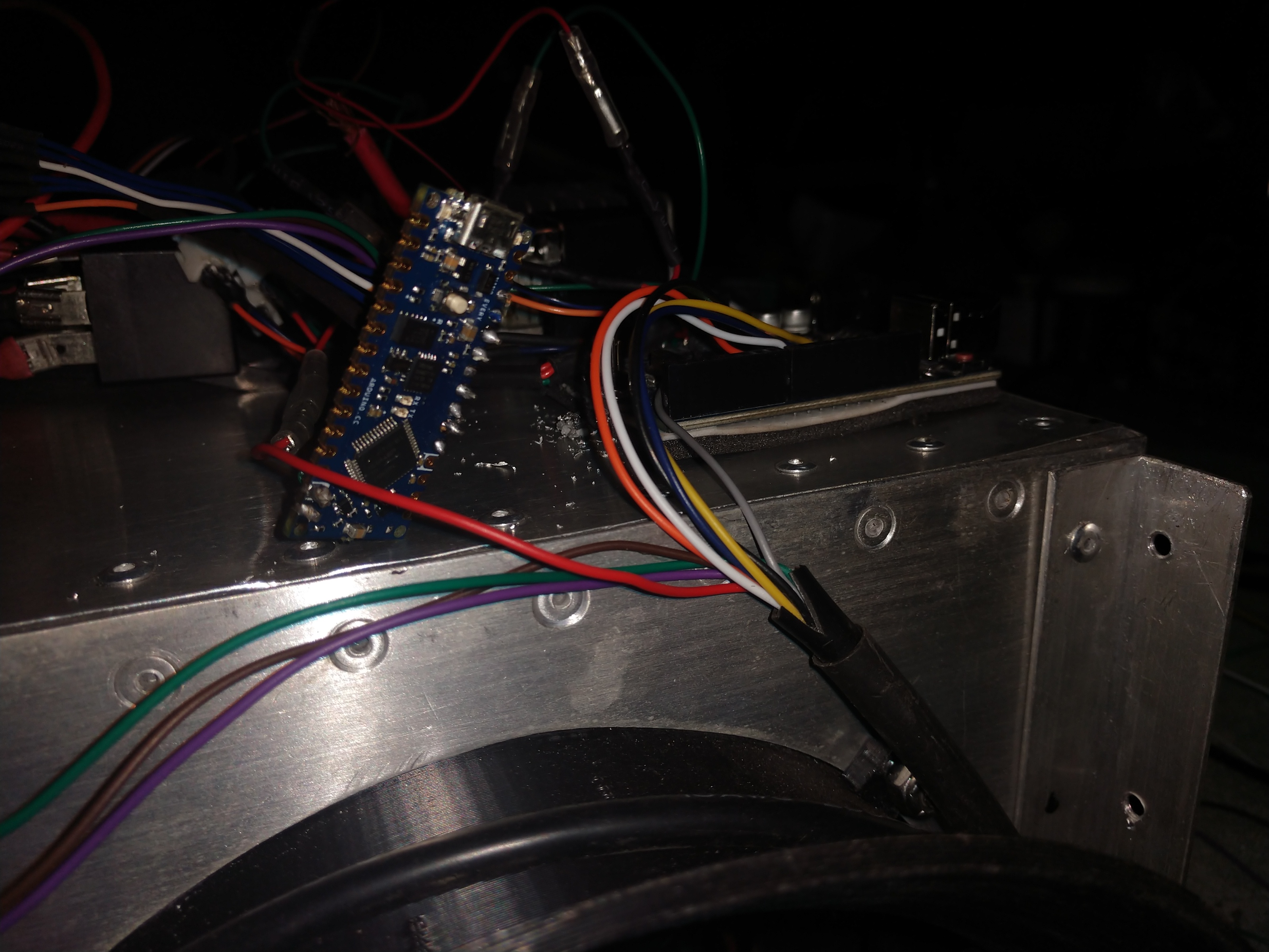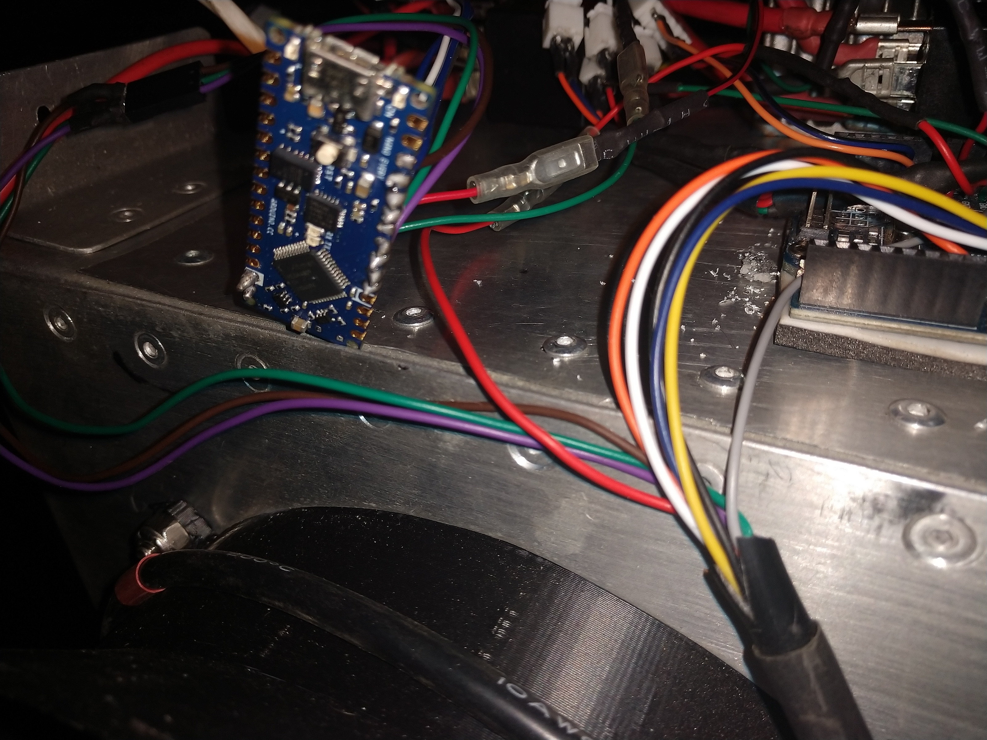 So I'm trying to attach the Arduino board and power pack (the Arduino board didn't like our clean 12v supplied power). So there is a separate board too supply power to the Arduino board. I'm using a M2 x 8mm screws on the Arduino board but they are too big for the power board. I think I can make up something to clamp the board down using the M2 hardware so it should be fine. I have a correction for Josh as I want to flip that board over so the electronics are facing and the wires are pointing up.