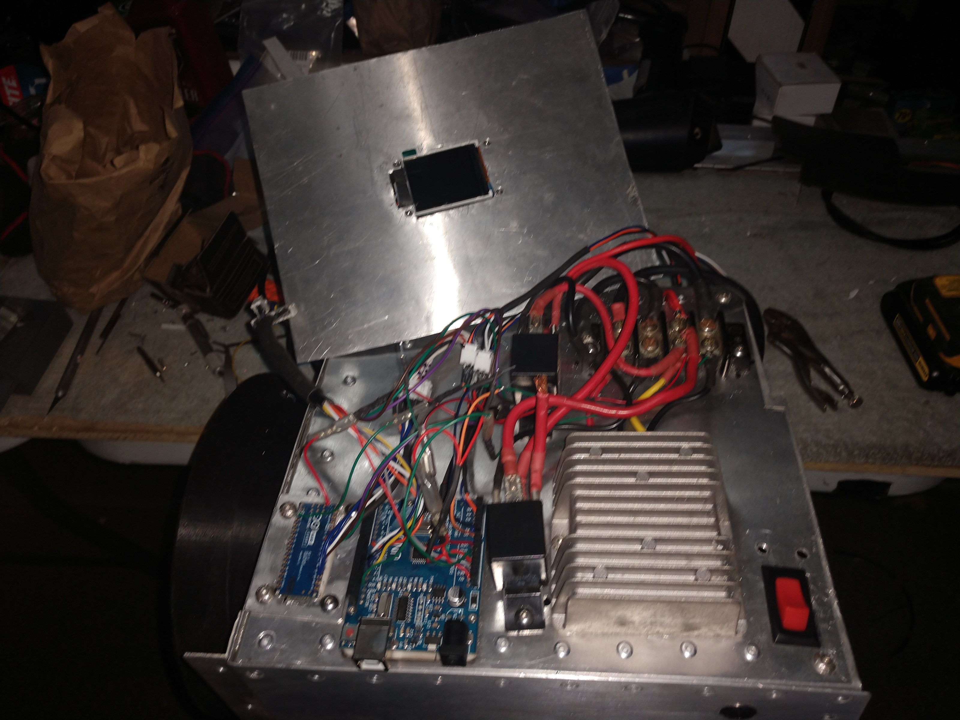I mounted the screen and the 2 circuit boards today. Now Josh gets to clean up behind me. I pulled 2 wires lose but he had a bunch of stuff that needs shortening and straighten out. Soon I will be able to test the motors for detection. I still need to make up the extensions for the sensors and place some sheet steel at the spots I want to read the sensors.