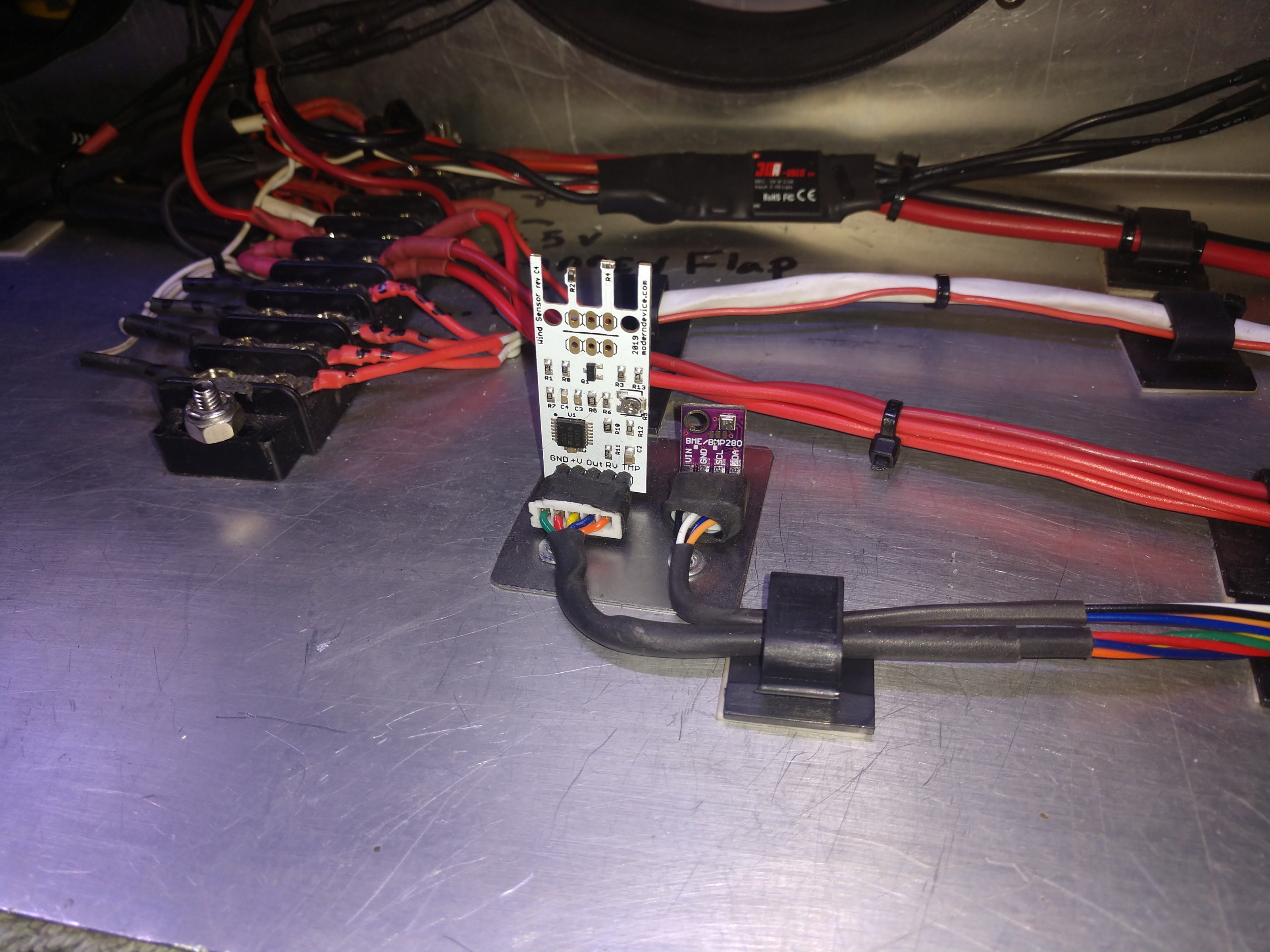 I installed a piece of sheet metal on the floor of the box so I could use for a mounting point for the sensors. They each have a magnet. I want to know the air velocity and biometric pressure inside the box. Only my first curiosity, as I want to compare this to the pressure of the engine bay and under the back of the car at speed. |