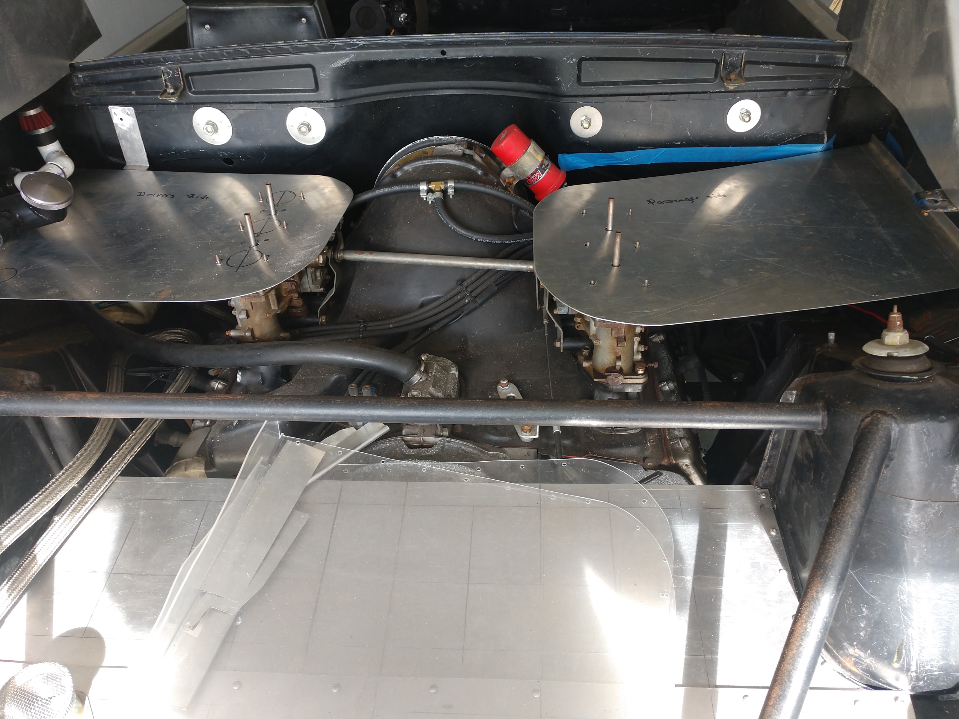 I had decided to make new patterns for the new plenums, aside from looking like they were assembled by the crew that built Starhopper. I thought they could be a little smaller, so I made up patterns from the old plenums and laid out the rain hat over holes for the carbs and made the new plenums just a little larger than the rain hat. We'll see how it looks when I finish it. |