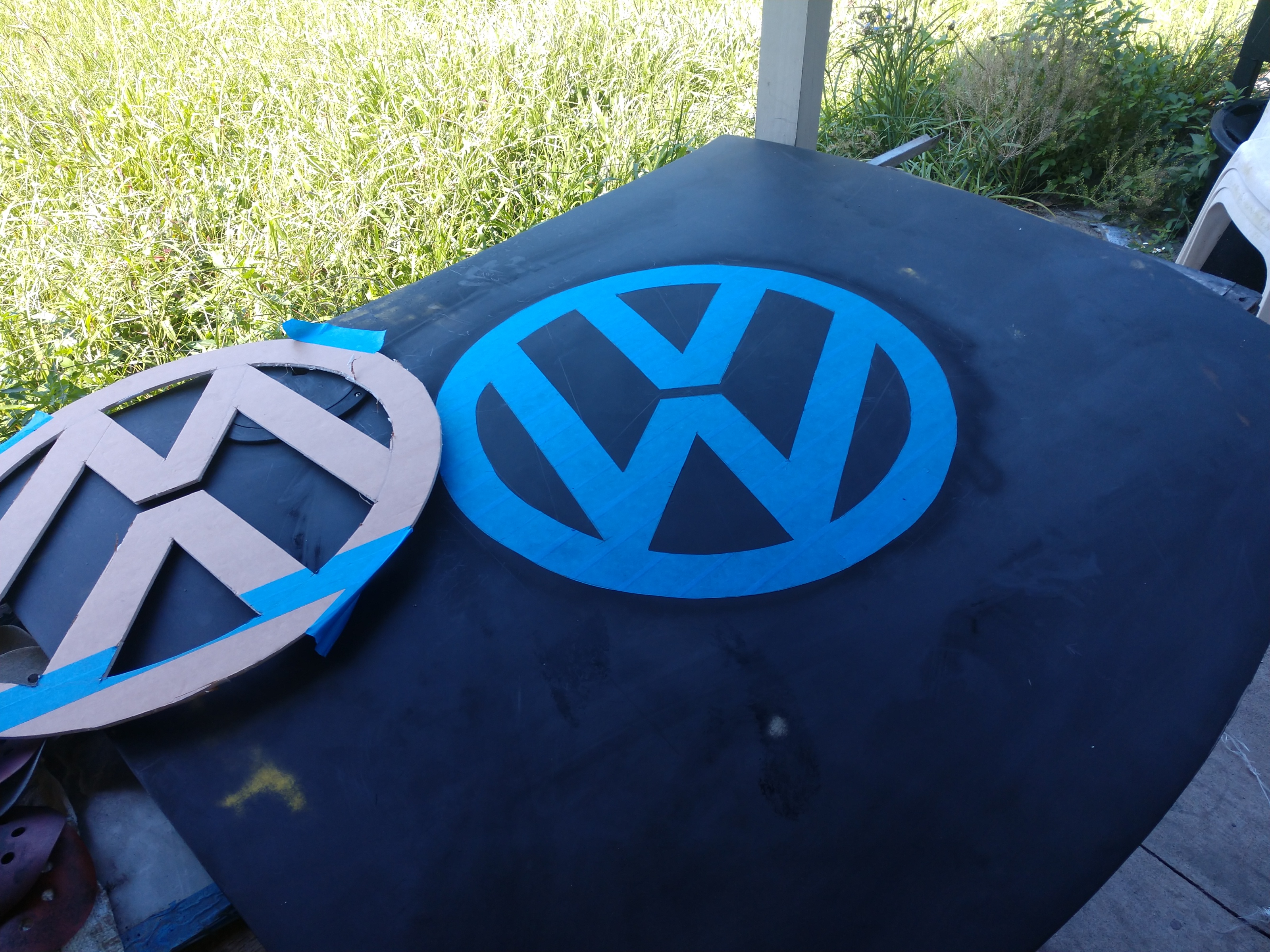 So I am in the middle of detailing the paint of the front hood. I know the hood is junk and needs replacement but I wanted to see if I could put a little V W back into her . That V W is about 23" in diameter.