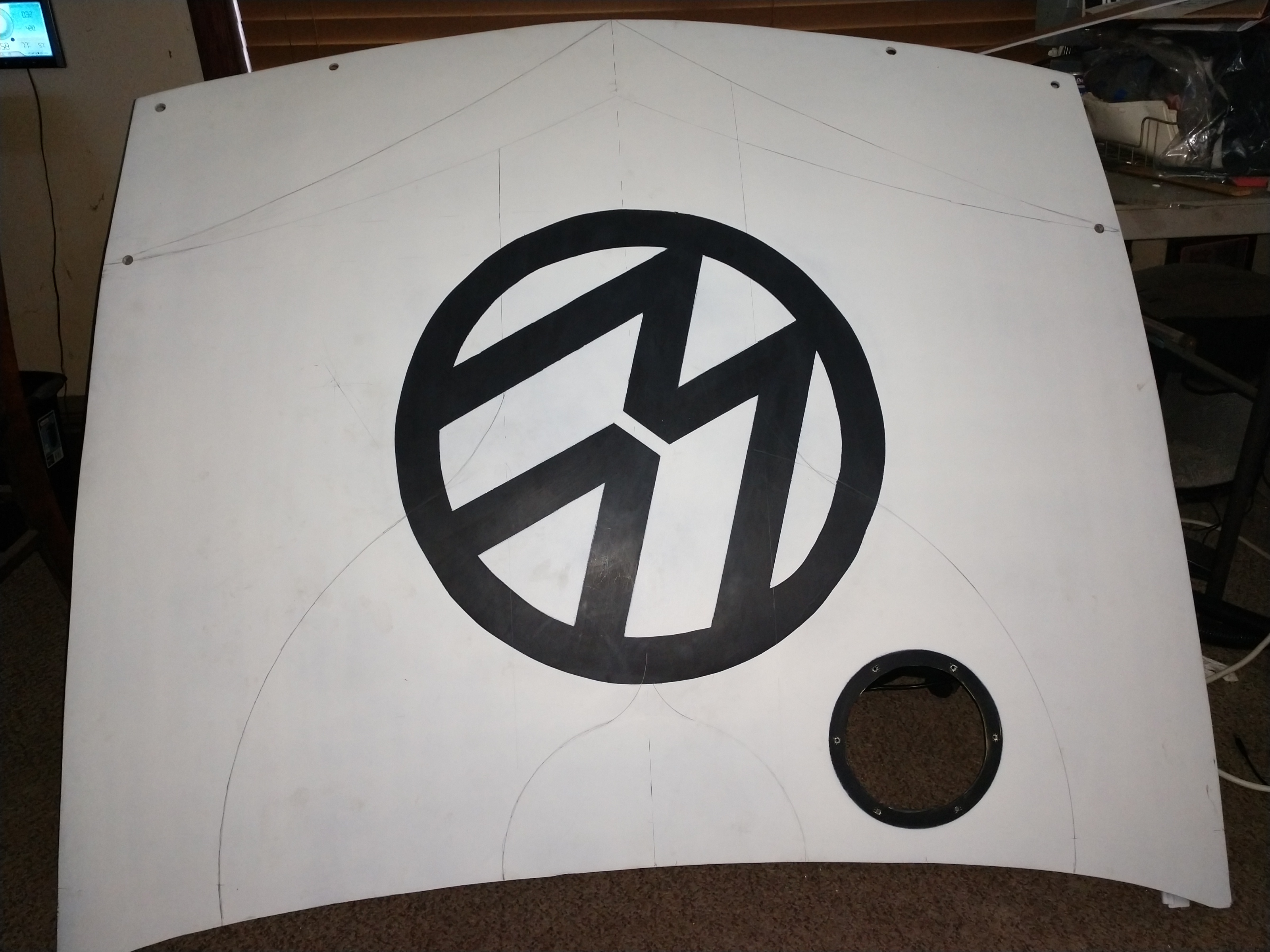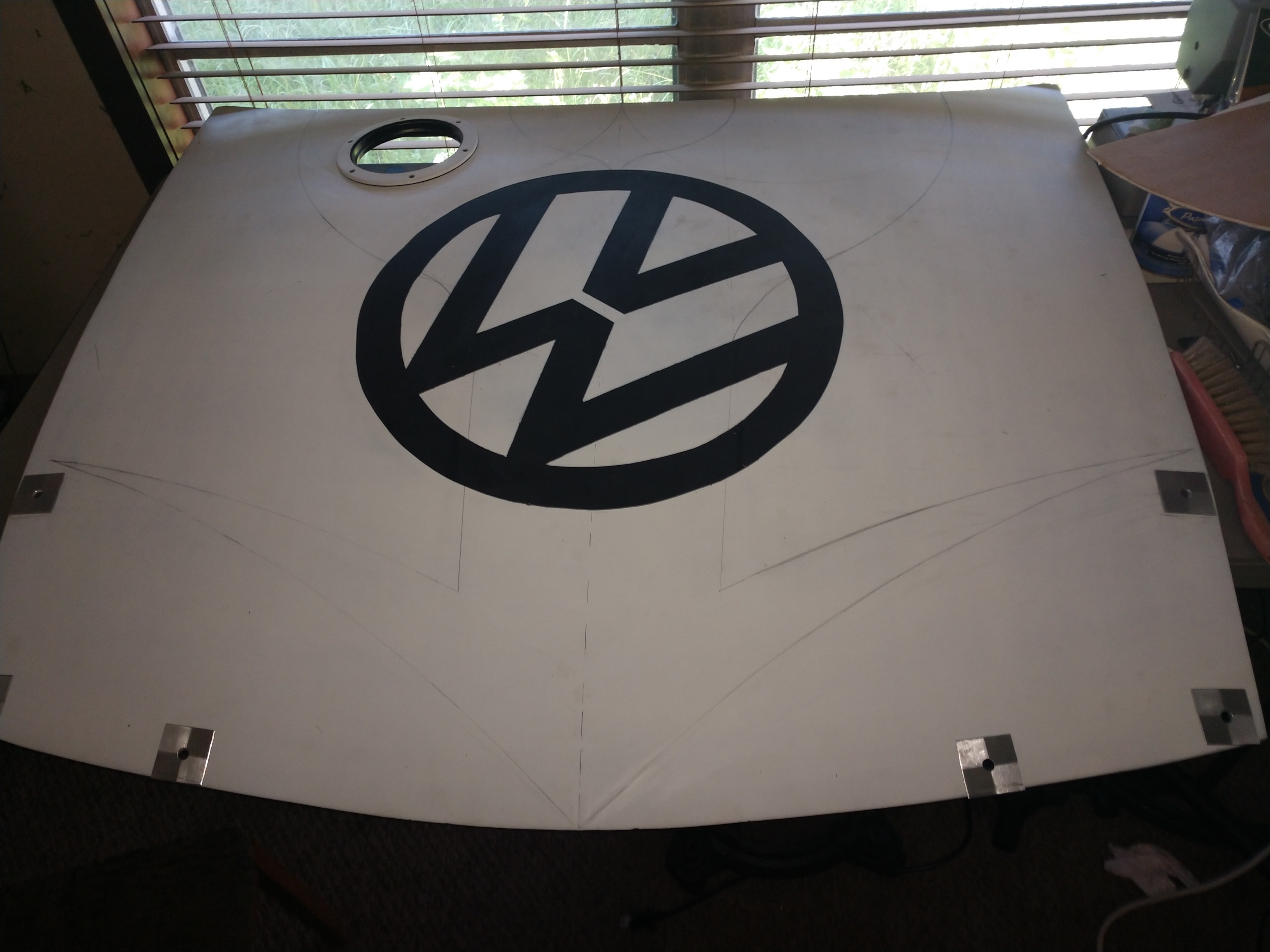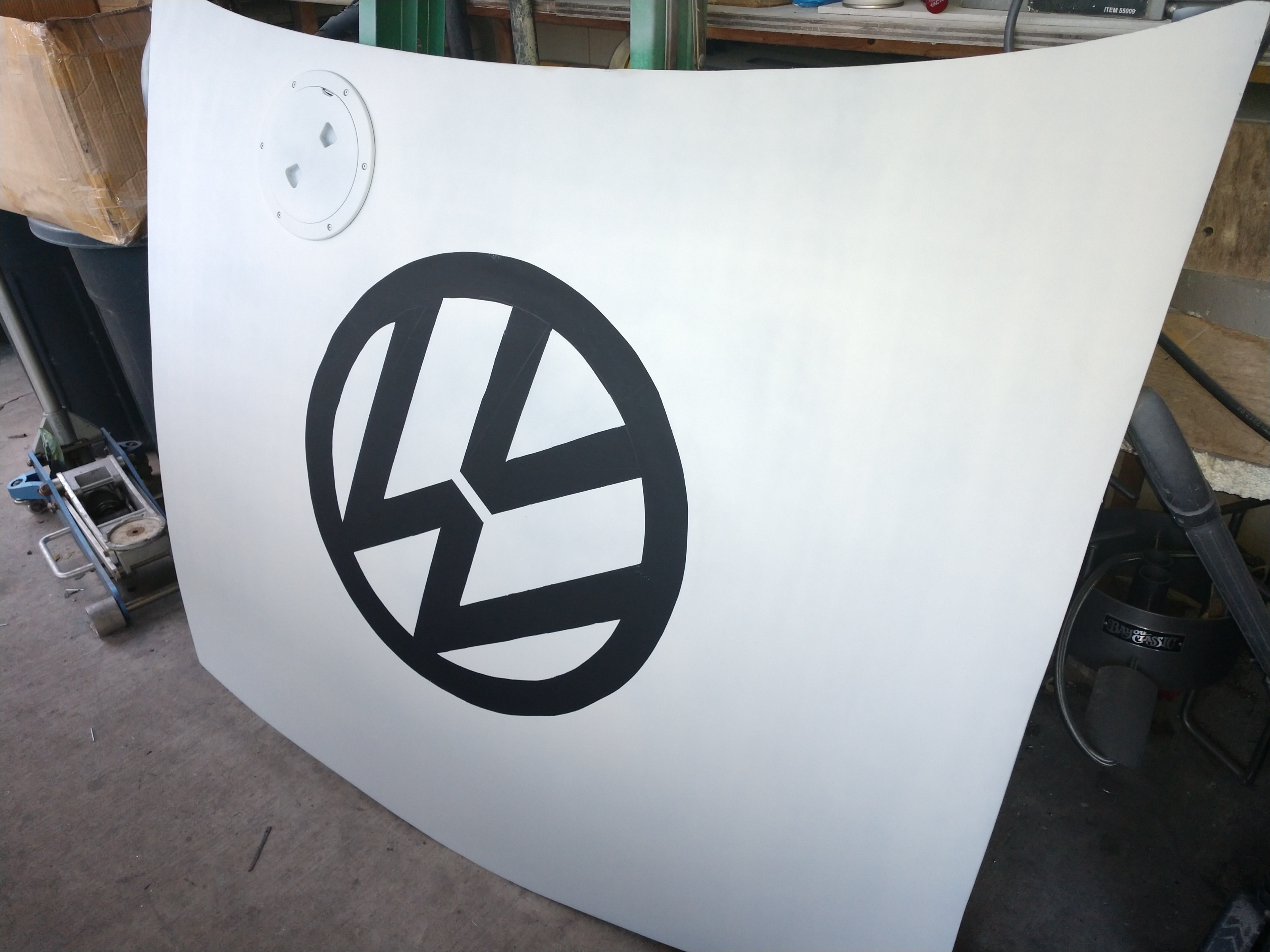 The hood is currently in black primer and is about to be sprayed white primer. I am hoping that I can change the color of the shade of the paint in the finish of the color. It is a V W after all. I figured that if I tried to put a sticker on that it would probably pull up the fresh paint. Now to paint it white and pull up the taype. |