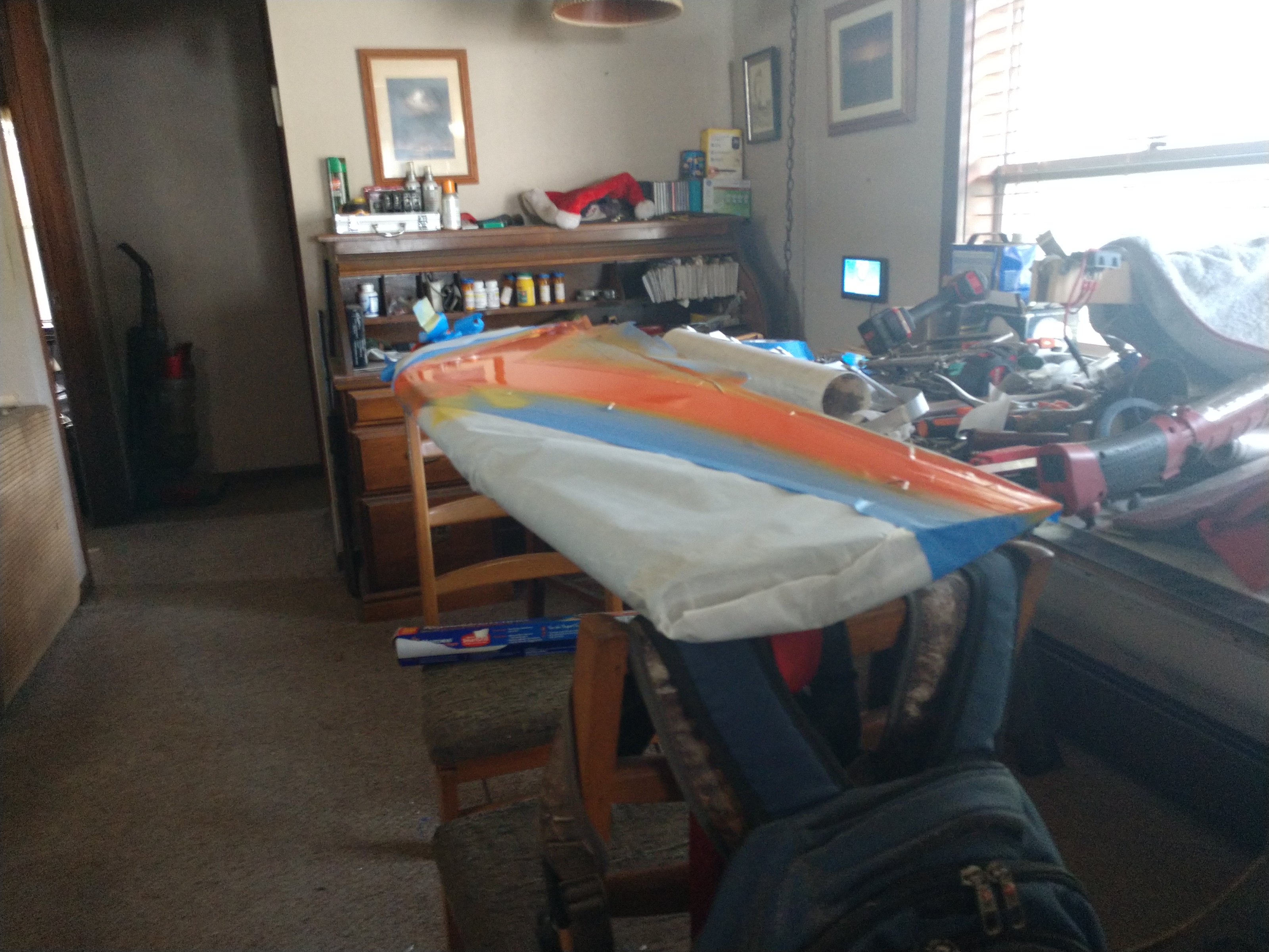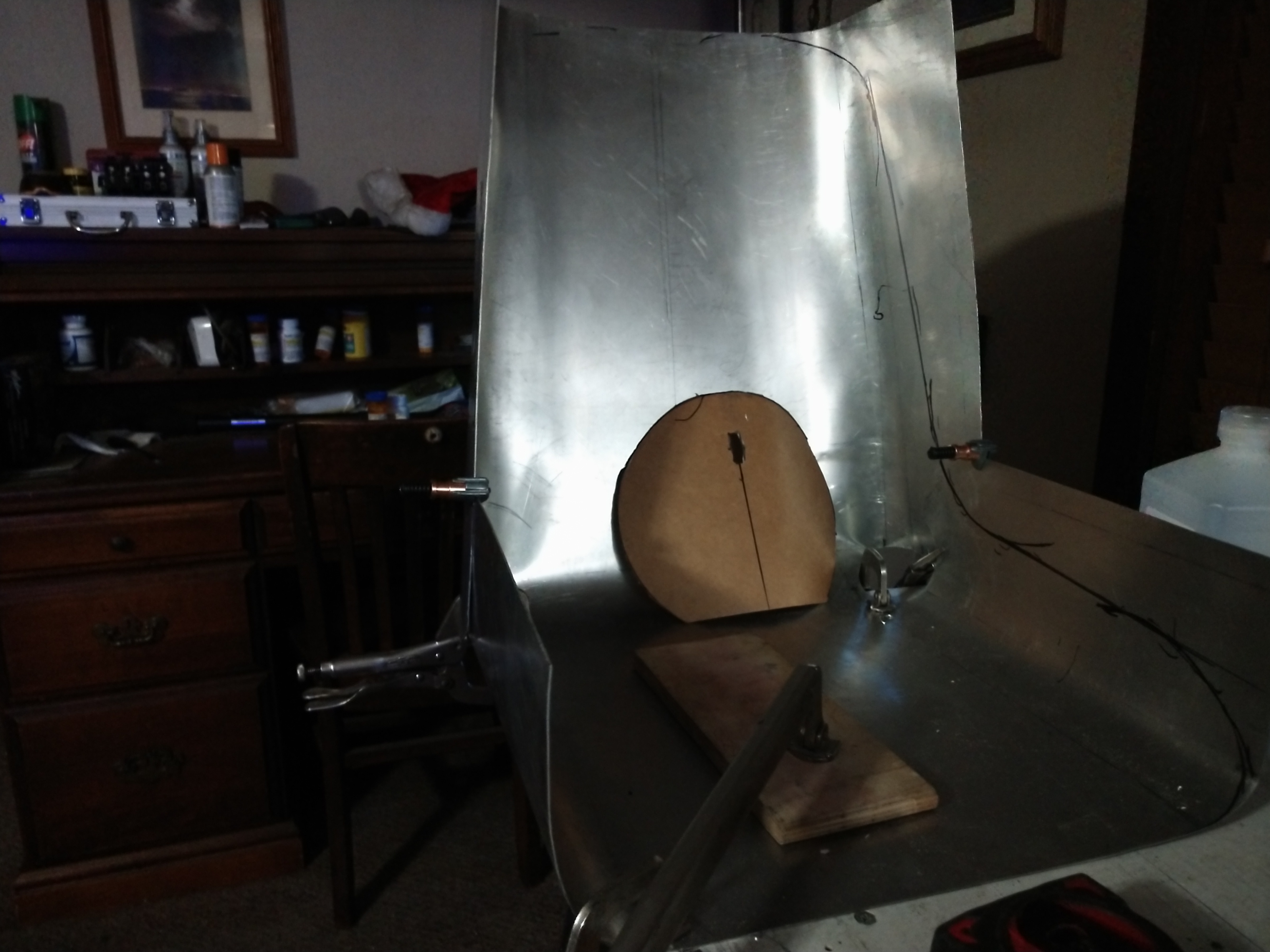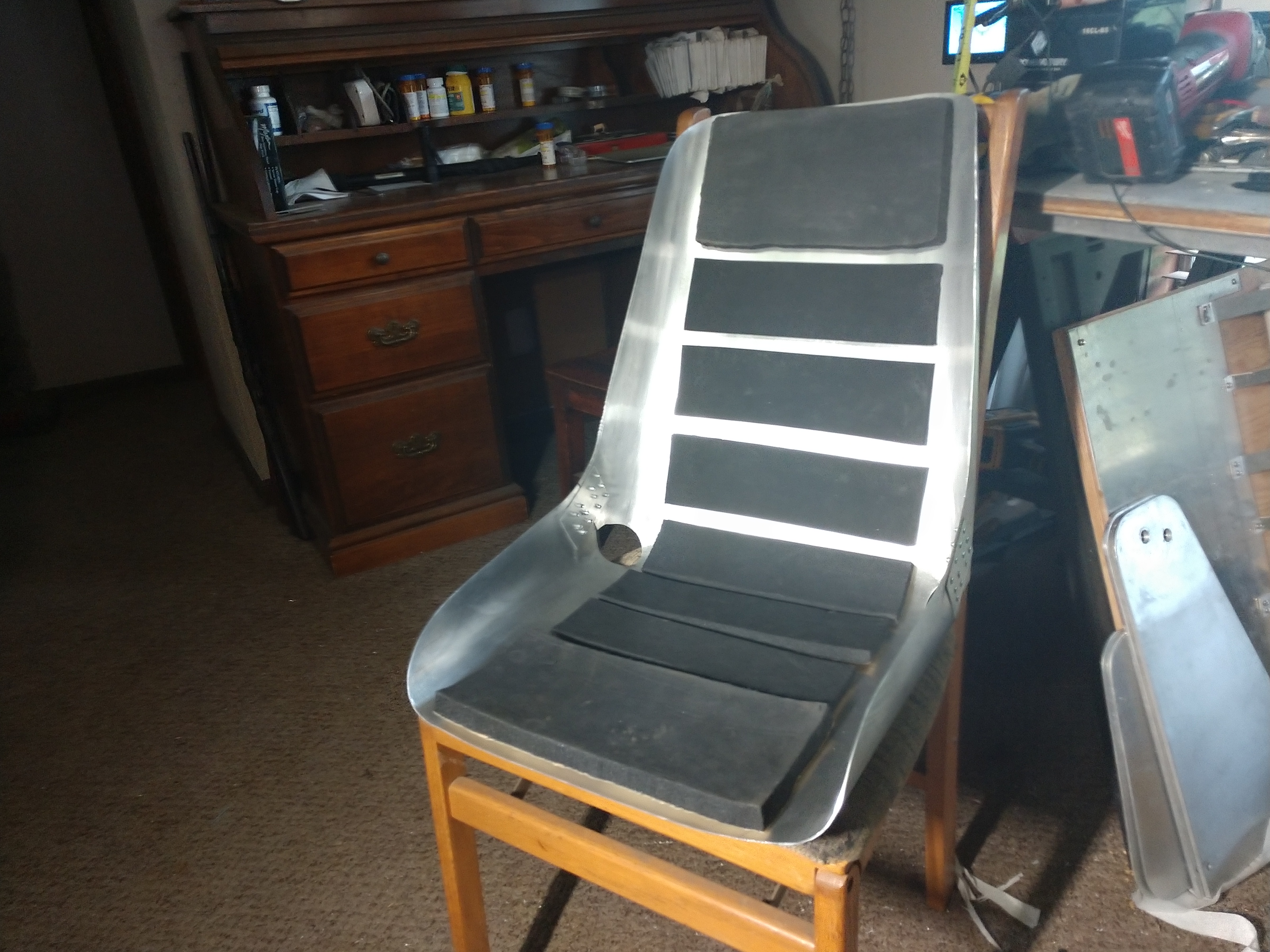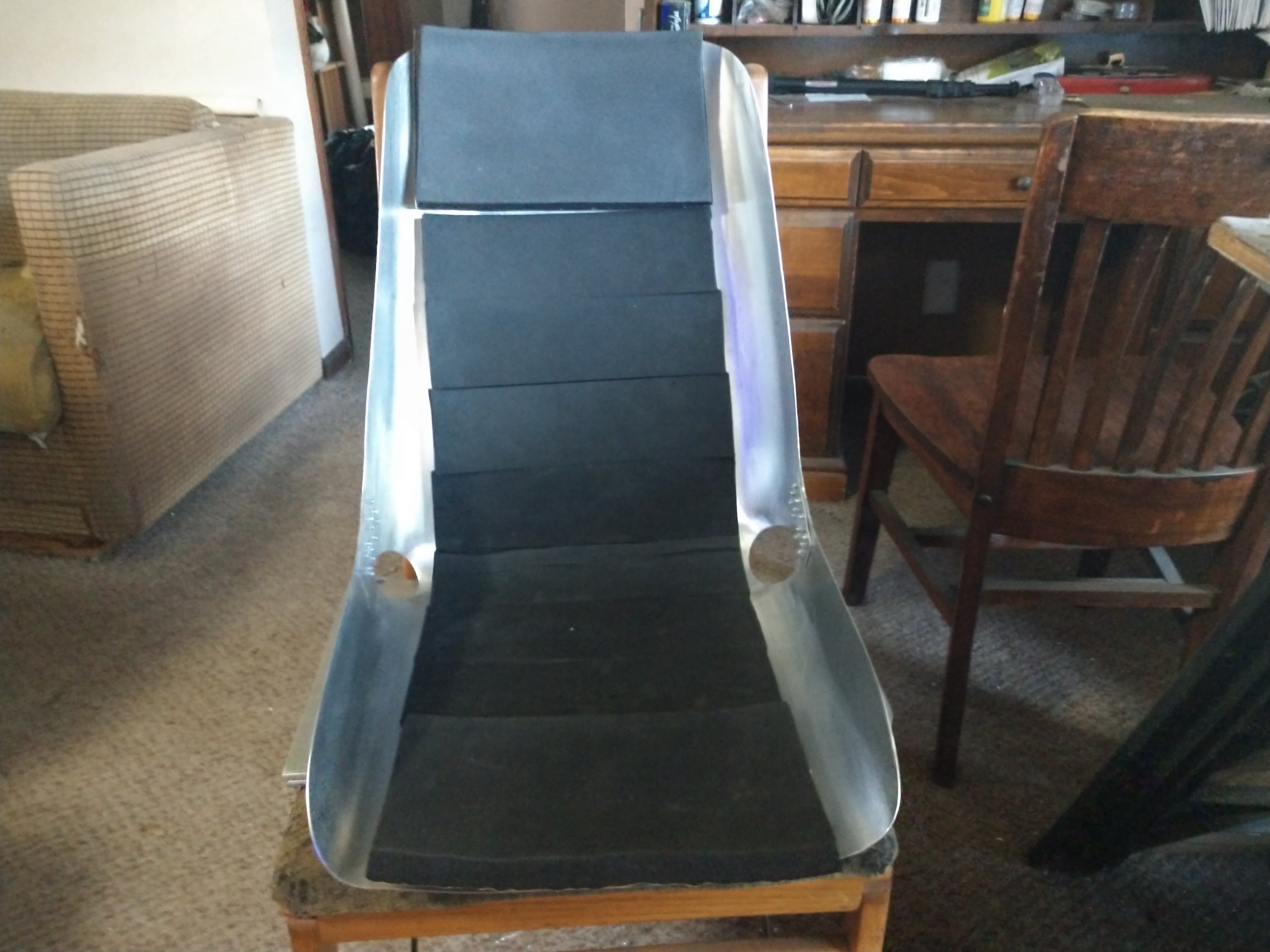 I've been doing more work on the lawnmower seat. I just finished cutting the material down to fit the modified fixture. The seat behind it is now being used by Diesel as his chair. That chair has very bad aerodynamics and weighs way too much. I call it an elefawntay.